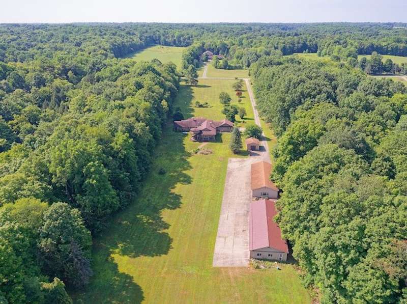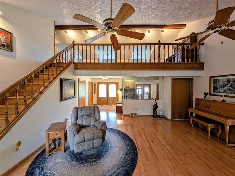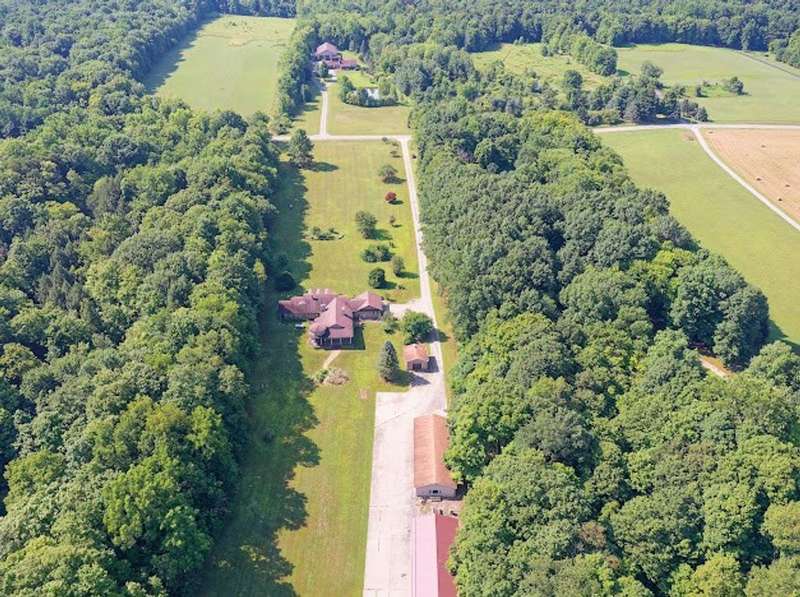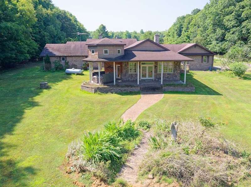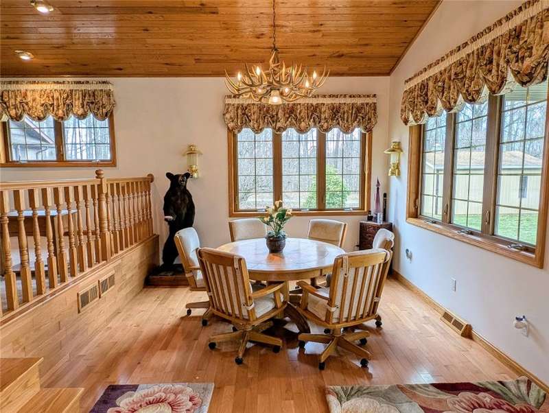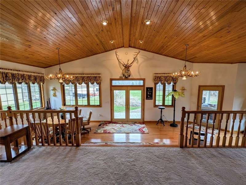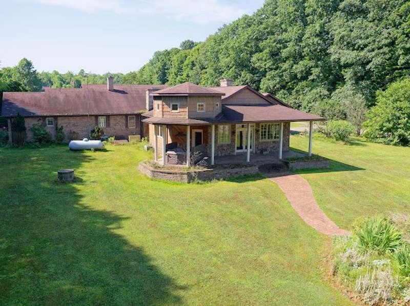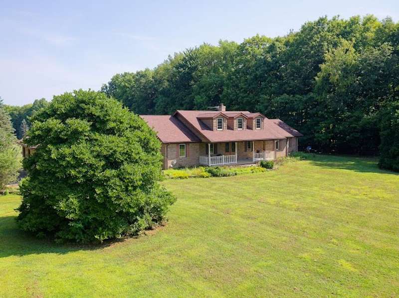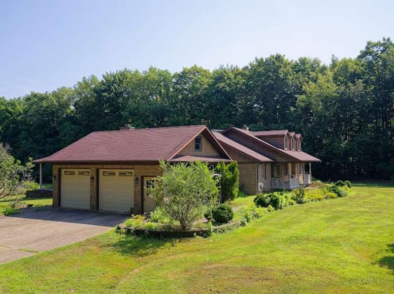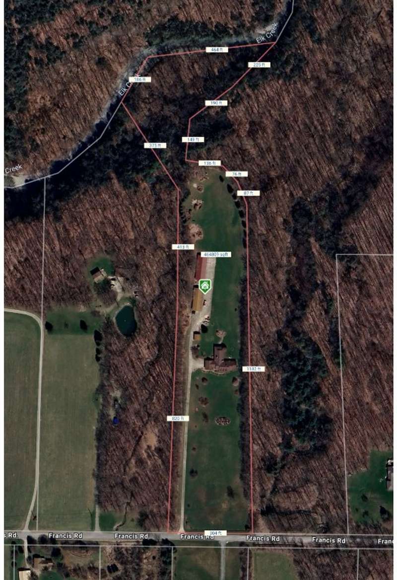 Country estate on 10.64 wooded acres along Elk Creek. This sprawling home has stunning architectural details, hardwood floors, and wood and stone accents. The inviting great room has vaulted ceilings, a soaring stone fireplace and walls of windows with views of wildlife. The attached gazebo is a private retreat for relaxing, with an ornate ceiling and a spa tub. A large loft area serves as a home office. The den has a wet bar and enough room for a gaming or pool table. The first floor laundry room could be converted into a bedroom. A finished lower level with kitchen and living area is perfect for an in-law suite. Attached 2 car garage. The outbuildings with heated work spaces and large overhead doors, add tons of storage and a party barn with a covered picnic pavilion. A wood boiler to the home is an additional heating source! Whether enjoying the peaceful surroundings, hosting gatherings, or simply unwinding in nature, here is a rare opportunity to own a true country sanctuary!