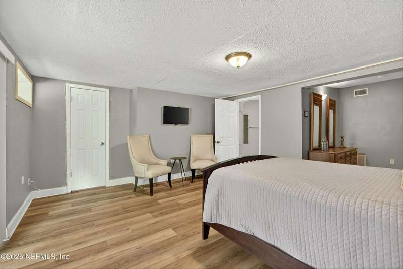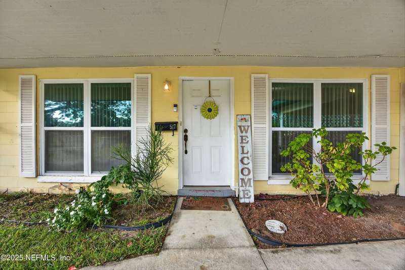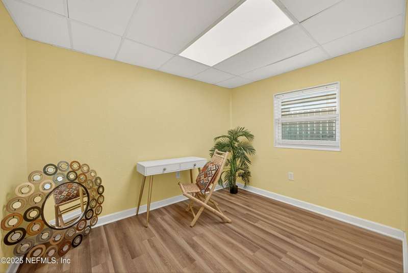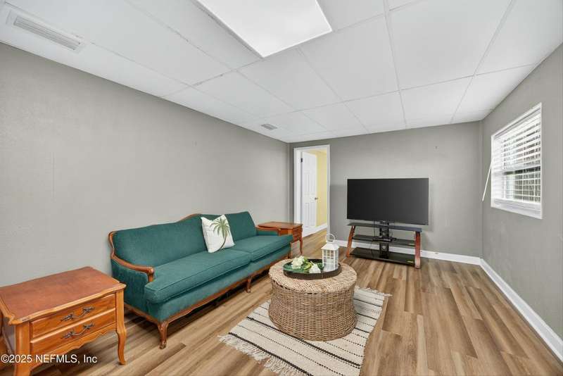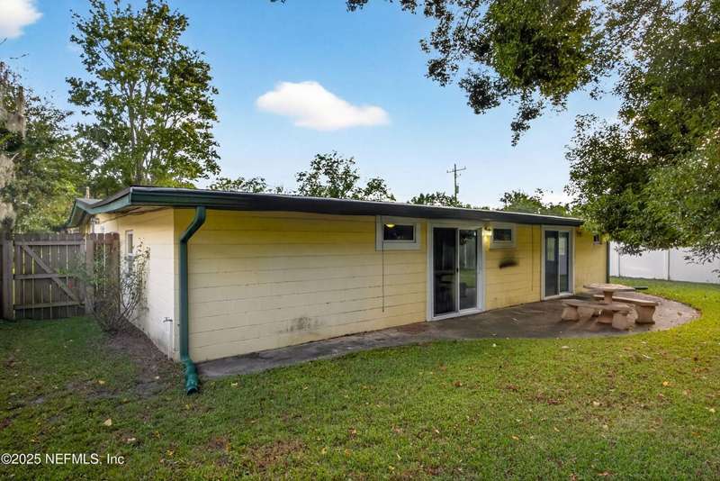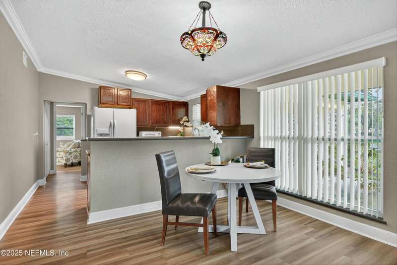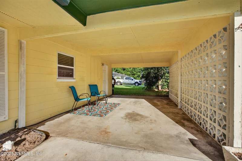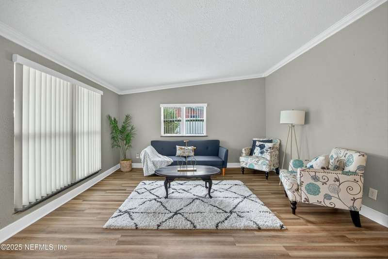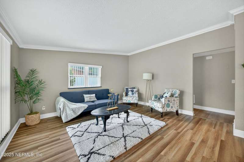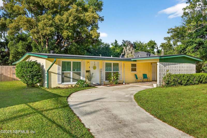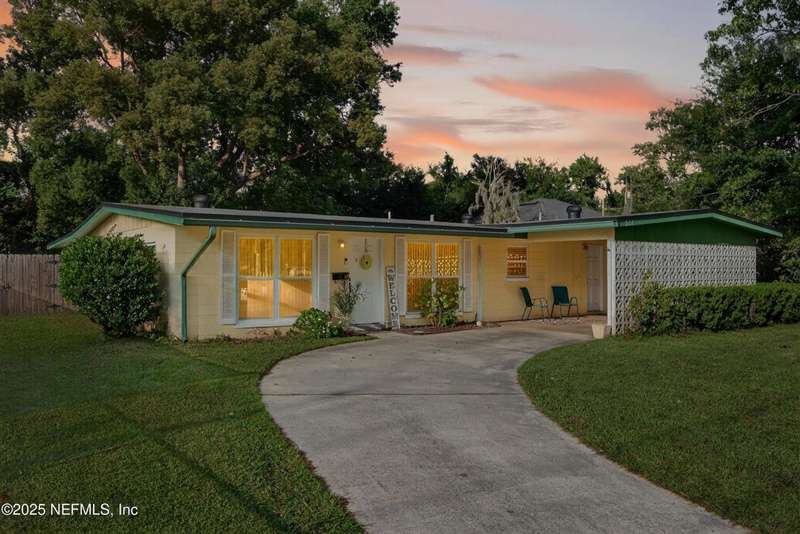 ACCEPTING BACKUP OFFERS WHILE STILL CONTINGENT TO BUYER SELLING HOME. Step back in time to a community that still celebrates holidays in block-party fashion. This San Mateo mid-century modern concrete block home combines the retro charm of its time with all of the upgrades you expect in a new home. The decorative breeze block wall creates a functional, decorative carport leading to the front door. Open it to a combination living/dining room and kitchen with a breakfast bar. Both spare bedrooms are oversized and the primary bedroom/bath is as big as a studio apartment. Additional living space includes a family room and an office, which can easily be transformed into a 4th bedroom with a walk-in closet. Large laundry room serves as extra storage space, too. If you have been searching for an affordable, large home, this 2,000+ square foot beauty is perfect. 2021 roof, 2022 HVAC, 2025 updated LVP flooring, and crown molding.