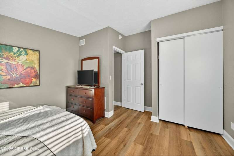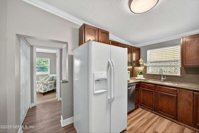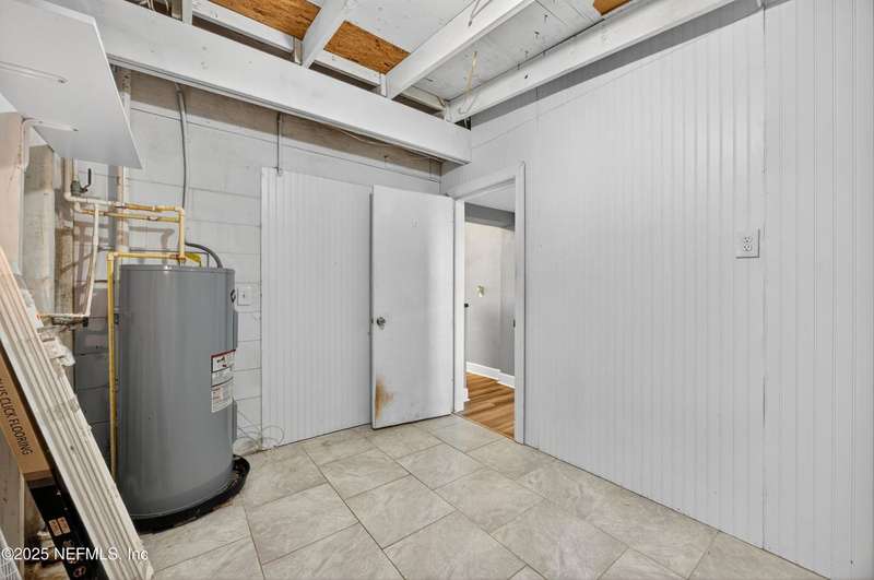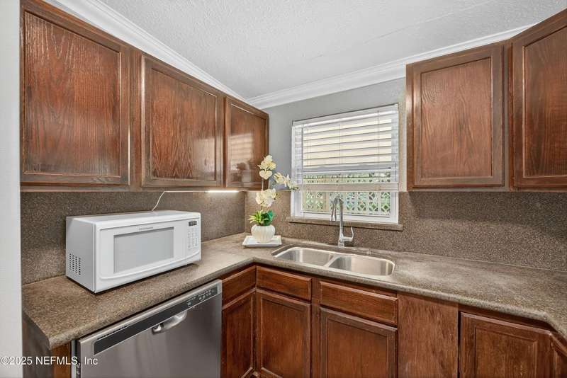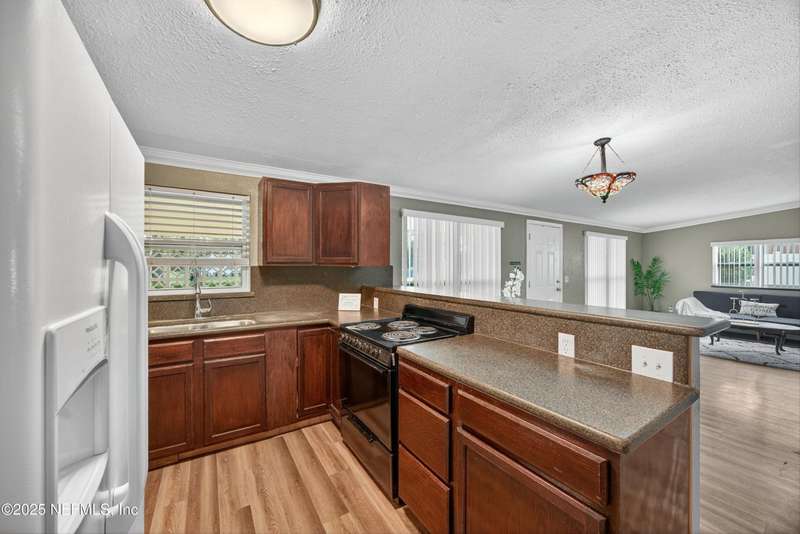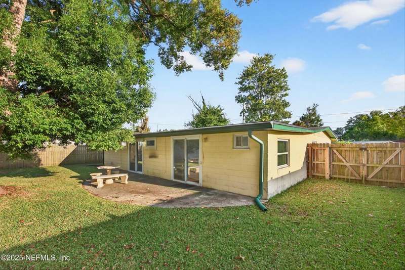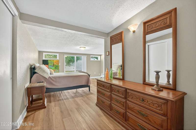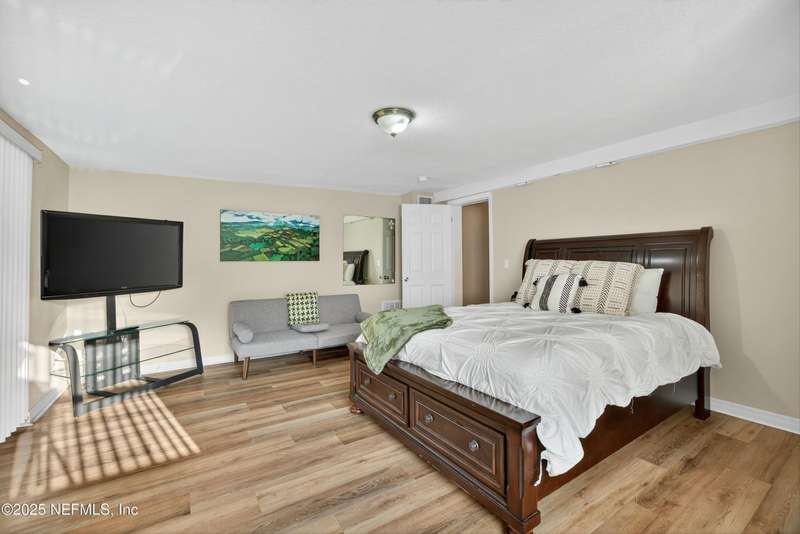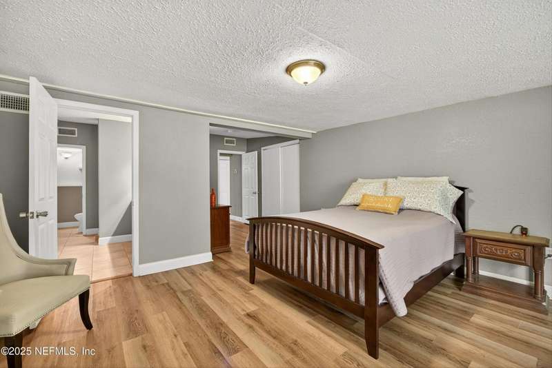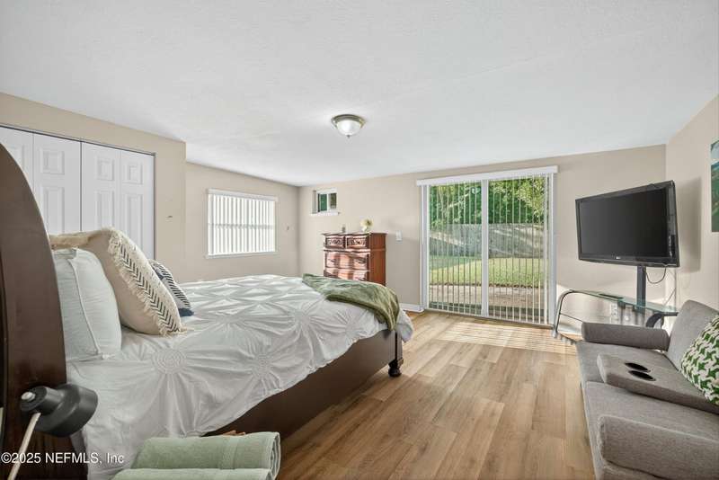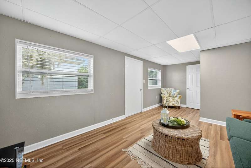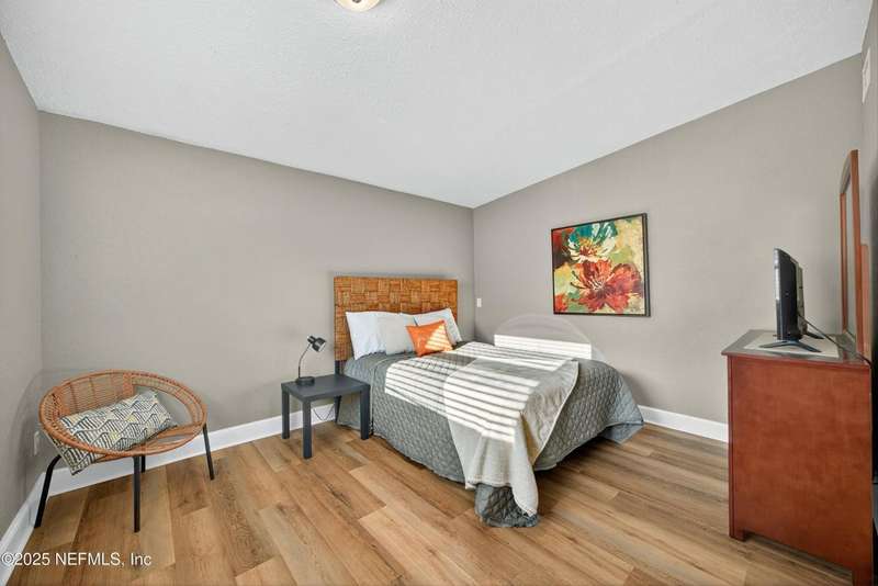 ACCEPTING BACKUP OFFERS WHILE STILL CONTINGENT TO BUYER SELLING HOME. Step back in time to a community that still celebrates holidays in block-party fashion. This San Mateo mid-century modern concrete block home combines the retro charm of its time with all of the upgrades you expect in a new home. The decorative breeze block wall creates a functional, decorative carport leading to the front door. Open it to a combination living/dining room and kitchen with a breakfast bar. Both spare bedrooms are oversized and the primary bedroom/bath is as big as a studio apartment. Additional living space includes a family room and an office, which can easily be transformed into a 4th bedroom with a walk-in closet. Large laundry room serves as extra storage space, too. If you have been searching for an affordable, large home, this 2,000+ square foot beauty is perfect. 2021 roof, 2022 HVAC, 2025 updated LVP flooring, and crown molding.