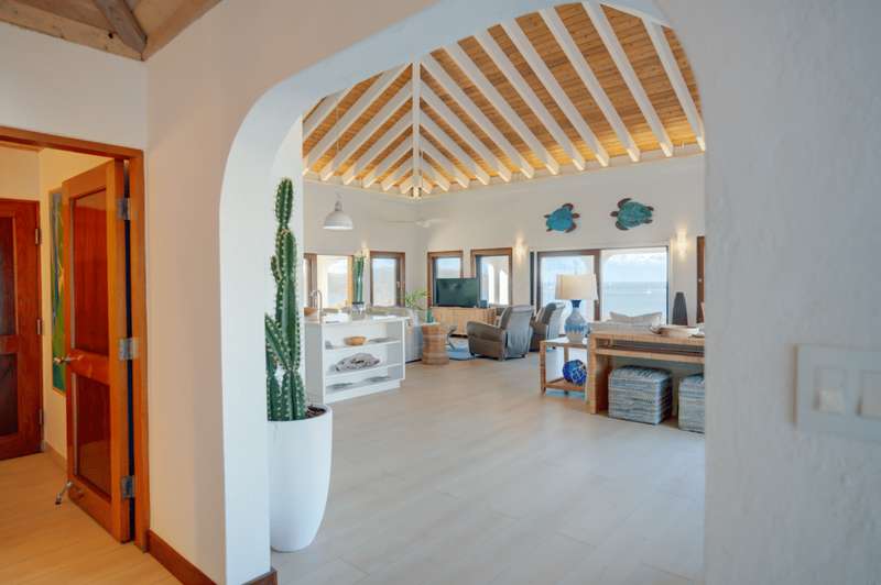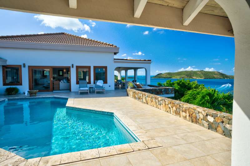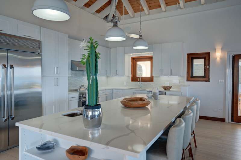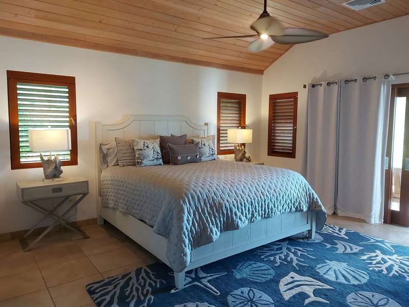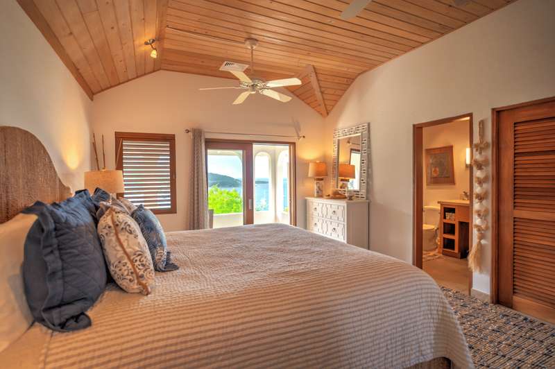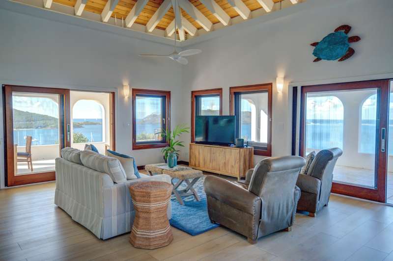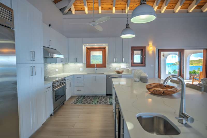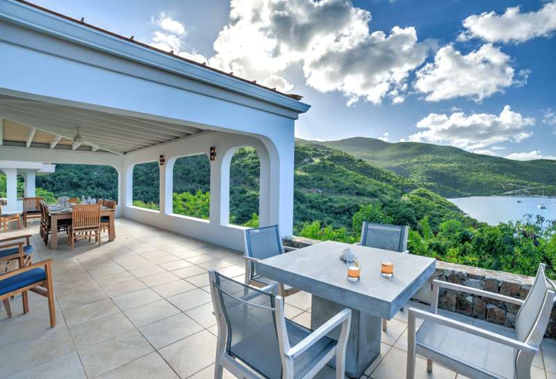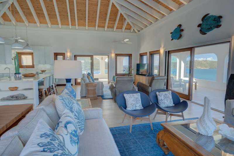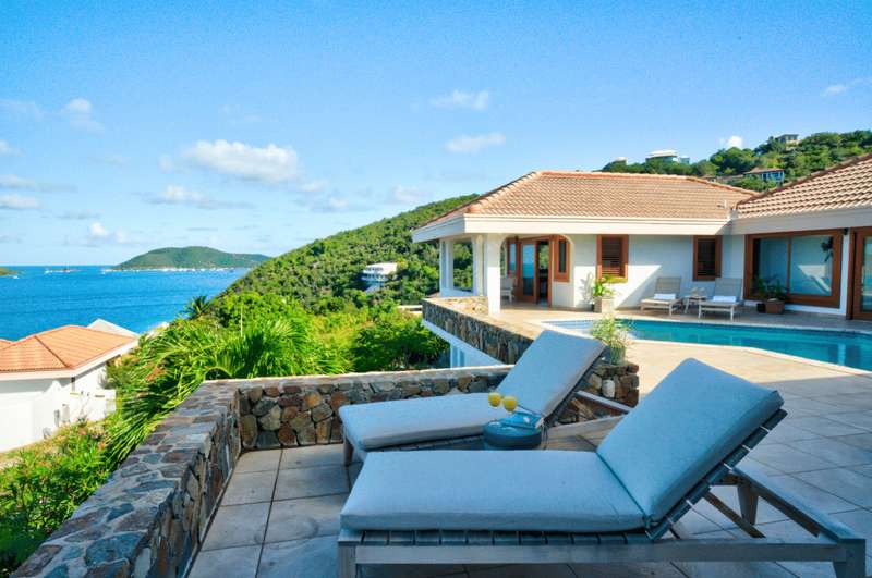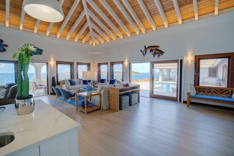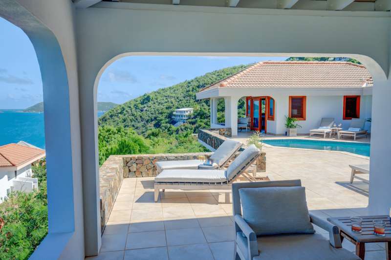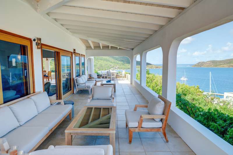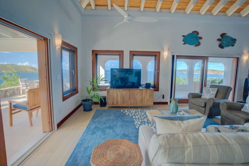 Located above Leverick Bay, with the most spectacular view in the North Sound, this beautiful property affords island living in luxury and style. A short drive from the Leverick Bay Marina, Christa Villa is conveniently located near to shops, two excellent restaurants, spa, watersports, and the marina. Christa Villa is unobtrusively set at the front of a hillside overlooking the islands of the North Sound Channel. This superb residence was recently renovated and now sets a new benchmark in contemporary living in the Leverick Bay Estate. From its magnificent Great Room and each of the six ensuite bedrooms, there are unobstructed views of the brilliantly blue Caribbean Sea. The vista spans Blunder Bay to the west, Moskito Island, Necker Island, Eustatia, Saba Rock and Bitter End Yacht Club to the east. Christa Villa is set on 0.8 acres of freehold land with well-tended, mature tropical landscaping. A short walkway leads from the garage and four-car parking area to the upper level of this beautiful home. Stepping into the Great Room, with its cathedral-ceiling, and magnificent views, there is an undeniable, awe-inspiring WOW-moment. German custom-made mahogany doors frame impact-resistant glass panes that let in plenty of light keeping the room bright and airy. The open-plan Great Room encompasses a sleek, modern kitchen, expansive stone-topped island with bar-height seating, a luxurious drawing room, and a relaxed family/TV area. To capitalize on the panoramic view and cool Trade Winds, the Great Room is surrounded by wide, covered verandahs. There is seamless flow from the Great Room to the outdoor dining table on the west-facing verandah, and to the multiple seating clusters, and sparkling swimming pool. The 3,500 square feet of covered space is superbly finished and topped by dramatically high ceilings of pickled white cypress under concrete tiled roof. There is an additional 2,000 square feet of exterior space that includes the swimming pool deck, terraces, and walkways. Masterfully designed, the five luxuriously, spacious bedrooms on the upper level are built, so each enjoys amazing seascape views, and has easy access to the pool deck. The free-from pool is centrally located to capture morning, mid-day and afternoon sun, keeping it naturally heated all day. The spacious pool deck is sun-filled year-round and affords plenty of room for lounging. A stroll along a path of native stone, accesses the lower level of Christa Villa, where a comfortable studio apartment provides independent living for staff or guests. This apartment is graced by strong breezes and lush garden views. The tranquility of its secluded setting makes it a peaceful retreat. Generous landscaping allows the villa to meld unobtrusively into the natural terrain. Set well off to one side of the property is a platform of solar panels that powers the entire property. A mechanical building houses the battery storage for the solar power, a generator, garage and ample storage. The North Sound of Virgin Gorda is reputed to be the Billionaire’s playground with exquisite yachts, world class sailing and international regattas commonplace. The value of Christa Villa capitalizes on the scarcity of available property in the area, and means ownership of increasing property values. With the high demand for accommodations in Leverick Bay, owners benefit from various leasing options, including vacation rentals. Leverick Bay Estate, where Christa Villa is located, has a small-town charm. As part of the private estate, its owners and guests enjoy resort amenities including a pristine beach, sun-warmed pool; two excellent restaurants, spa, shops, commissary, private dock and marina. The Virgin Gorda airport and Yacht Harbour are twenty minutes’ drive away while the airport at Beef Island is twenty minutes away by boat. ; Additional Details Furniture Modern Contemporary. Jaipur and Beacon rugs were handwoven in India. Furniture coordinated from Blu Dot, Room and Board, Pottery Barn, Restoration Hardware and other top-of-the-line designers. WiFi Wireless, high-speed internet is available throughout the Upper and Lower levels and on Terraces and Pool area. Also available is fibre-optic internet, television and landlines. Doors and Windows German; Custom-made Mahogany; Glass Panes are engineered specified to hurricane ready specifications. Cabinetry Custom-made Cabinets and centre island topped with Quartz Solar Power Solar Panels and battery storage with the capacity to power the entire property. Generator FG Wilson AC Synchronous Generator with Triple Phase, Automatic Transfer switch. Backup 250KW Diesel Generator Central A/C Bedrooms have Split AC Units to allow for independent temperature control. Pool Salt-water pool Landscaping Multi-Zone drip irrigation system Water 3 cisterns are located under the Great Room with a total capacity of 45,000 gallons. Property is also fed by government mains for back-up. Laundry On the Upper Level Sewage/Waste Traditional Soak-away Sceptic in multi-chambers ;
