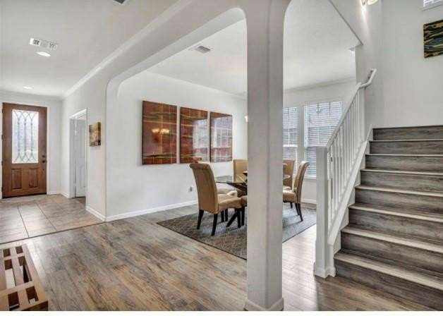 24 hour showing notice. This stunning Georgetown home offers refined elegance, thoughtful functionality, and timeless style. Abundant natural light fills each space, creating a warm and welcoming atmosphere throughout. Step inside the foyer, where wood-look vinyl plank flooring sets the stage with classic sophistication and modern durability, carrying seamlessly across the main level and staircase. A formal dining room provides the perfect setting for memorable gatherings, while a private office with French doors creates a quiet retreat. A convenient mud area and stylish half bath with pedestal sink add everyday ease and charm. At the heart of the home, the expansive open-concept kitchen and living area combine beauty and function. The chef’s kitchen showcases granite countertops, a tile backsplash, large center island with bar seating, built-in desk, pantry, refrigerator, microwave, double ovens, and an electric cooktop—an entertainer’s dream. The adjoining living room with ceiling fan flows into a bright breakfast nook, the perfect spot to start your mornings. Upstairs, a versatile game room offers space for fun or relaxation. The primary suite features plush carpet, a walk-in closet, and a spa-inspired bath with dual quartz vanities, a garden tub, and a walk-in shower. Three additional bedrooms provide excellent storage, while the full bath with granite counters, makeup desk, and tub/shower combo ensures comfort for all. Enjoy year-round serenity in the sunroom with ceiling fan, opening to a covered deck, stone patio, and beautifully landscaped yard with privacy fencing—ideal for relaxing or entertaining. Energy-efficient solar panels add sustainable savings. Perfectly located near Georgetown’s top attractions—historic Downtown Square, Blue Hole Lagoon, Berry Springs Park, Inner Space Cavern, the Palace Theatre, and more—plus shopping, dining, and top-rated schools, this home is the ideal balance of comfort and convenience.