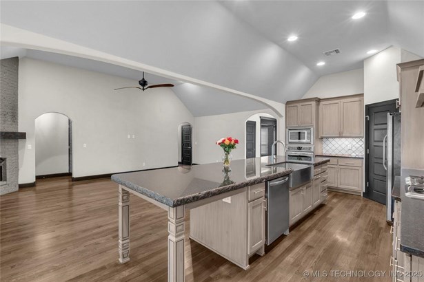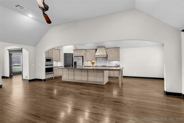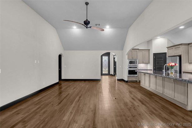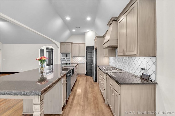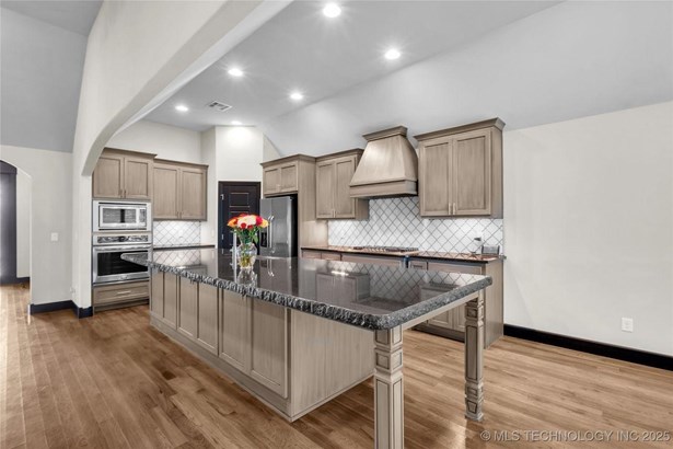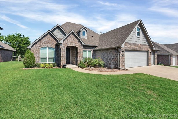 MOTIVATED SELLER! *RARE FIND* FABULOUS VIEWS GREENBELT LOT ONE OWNER FULL BRICK home on almost a quarter of an acre (CH)in desirable Seven Oaks South II. This is a beautiful, established neighborhood with two fishing ponds, swimming pool and clubhouse. Looking for your dream home? Look no further than this stunner with 4 bedrooms and 2 full bathrooms. You'll love the open feeling created by the vaulted/higher ceilings in all of the main areas. This modern dream home is a rare find! Hickory hardwood floors throughout entry, great room, kitchen, dining, office/4th BR, primary suite and hallways. Stunning open concept chef's kitchen with 13+ ft long extra deep island with storage, 6cm granite countertops, tile backsplash, all stainless steel appliances, including the refrigerator, extra tall cabinets and vaulted ceiling. The Primary Suite is over-sized with sitting area, spa like private bathroom with TV in the mirror as well as a dream two-story walk-in closet with hydraulic pulldown rods & custom shoe shelves. Truly an outdoor oasis complete with large covered patio ready for a hot tub with a dedicated GFCI connection, gas line for a grill, a mounted TV and a fully fenced yard. Plus, this home backs up to a 240 acre pasture with breathtaking views of a large pond, horses, cattle and tree line providing a serene backdrop to this incredible property. PRIME LOCATION with the NSU Broken Arrow, Events Park, Challenger Sport Complex, H2O Inflatable Aqua Park, entrance to the Creek Turnpike and Liberty Trail system all within 1.5 miles. Rose District, Broken Arrow Hills shopping district, and Ascension St. John Hospital are only 5 to 10 minutes away. LIKE NEW & move-in ready! All This and so much MORE this home is MUST SEE!
