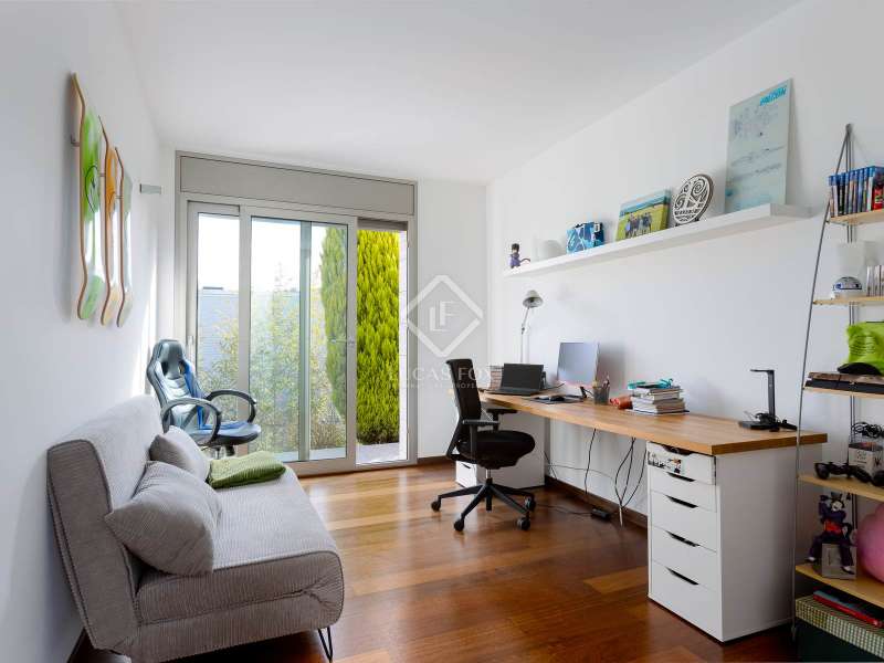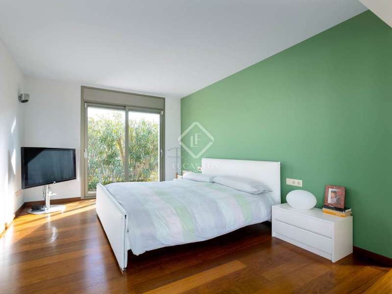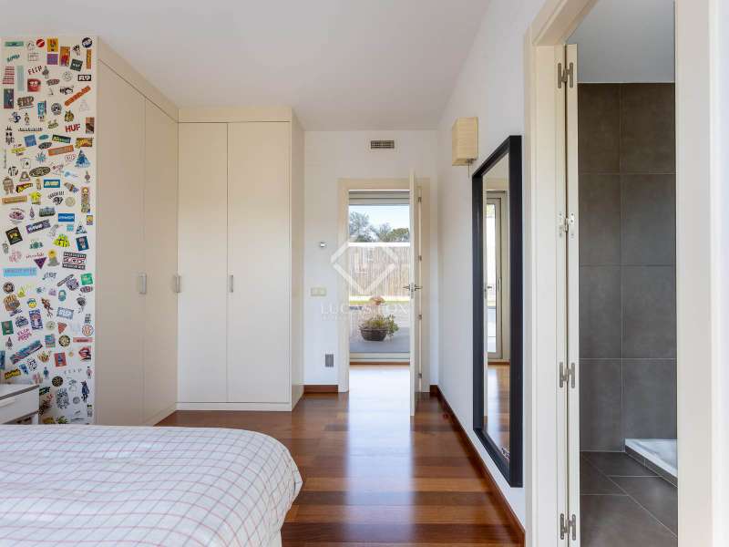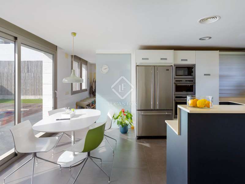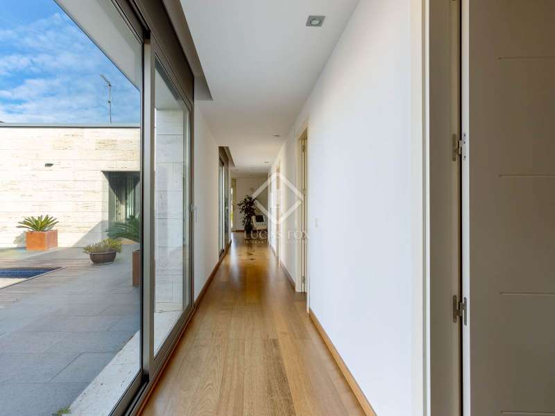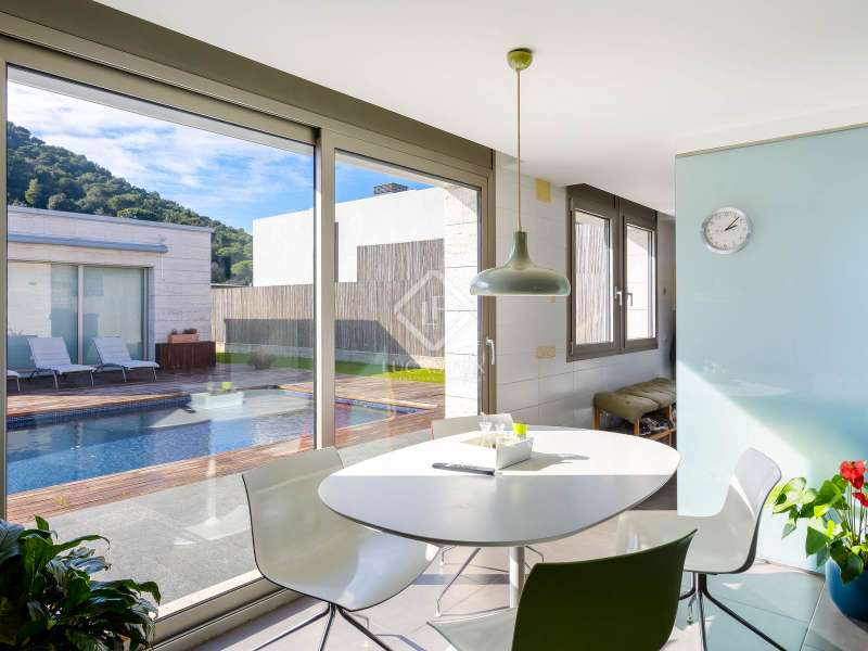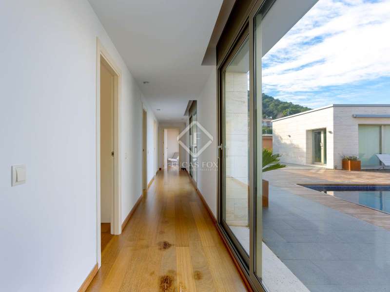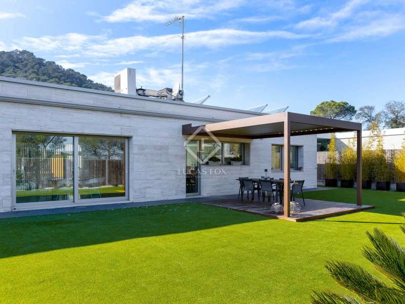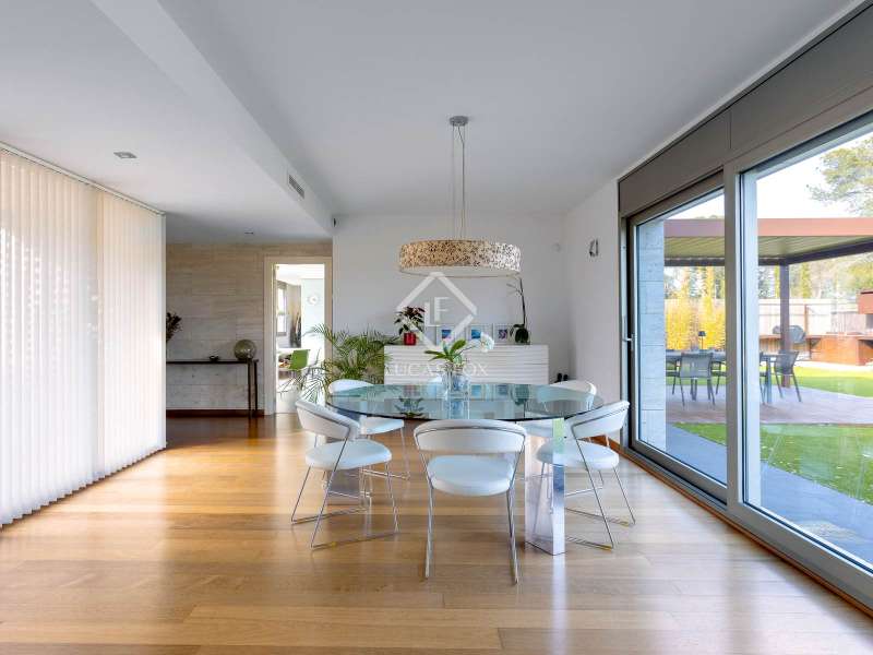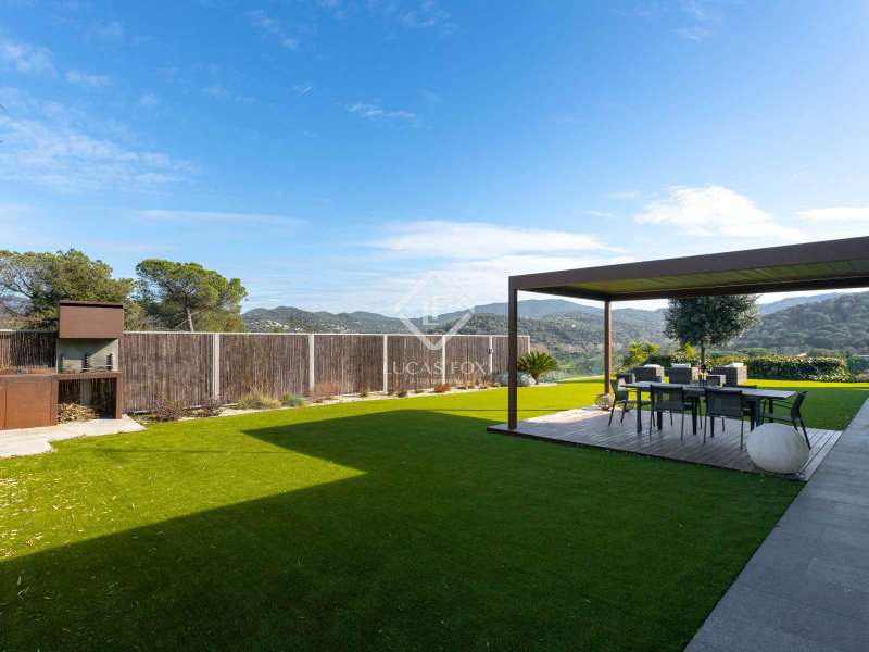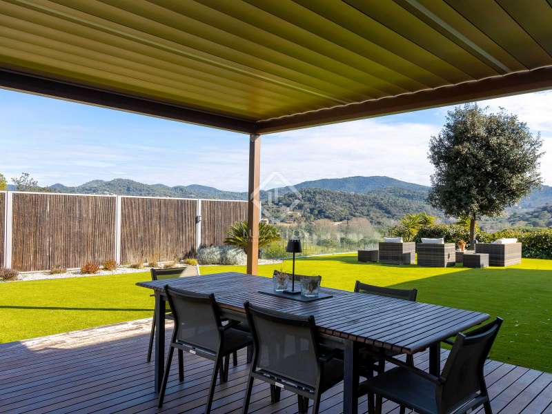 Exclusive Villa for Sale in Golf de Vallromanes Located in a privileged setting, this elegant 400 m² villa sits on a beautifully landscaped 1,600 m² plot with a south-facing orientation, offering privacy, tranquility, and spectacular views of the valley and the Vallromanes golf course. Designed on a single floor in an "L" shape, the layout maximizes the connection between indoor and outdoor spaces, seamlessly integrating the garden and the saltwater pool for a warm and functional atmosphere. The villa features a spacious and bright living-dining room with direct access to the exterior, a large kitchen with an office area, a laundry room, and a guest toilet. The sleeping area includes four bedrooms: two en-suite with private bathrooms and two additional double bedrooms sharing a full bathroom. All rooms are exterior-facing, ensuring natural light throughout the day. Built with high-quality materials, the villa boasts travertine marble finishes, wooden floors, home automation, motorized blinds, and an efficient solar panel system that significantly reduces energy consumption. Outside, there is a covered porch with a barbecue area, a well-maintained garden, and a private garage for two vehicles, along with additional parking space at the entrance of the property. The location is unbeatable: just 5 minutes by car from the center of Vallromanes, with quick access to the AP-7, only 12 minutes from the beach, and close to prestigious international schools. A unique property for those seeking exclusivity, comfort, and an unparalleled natural environment.