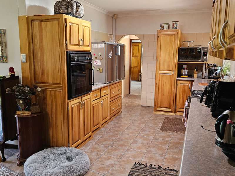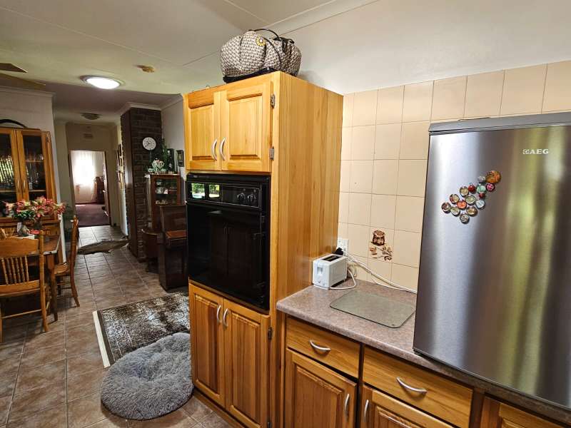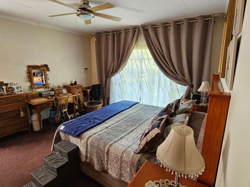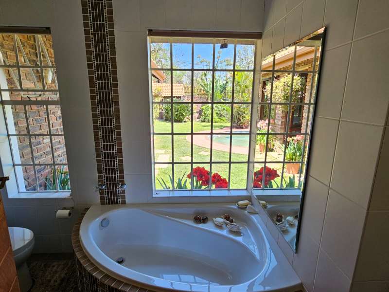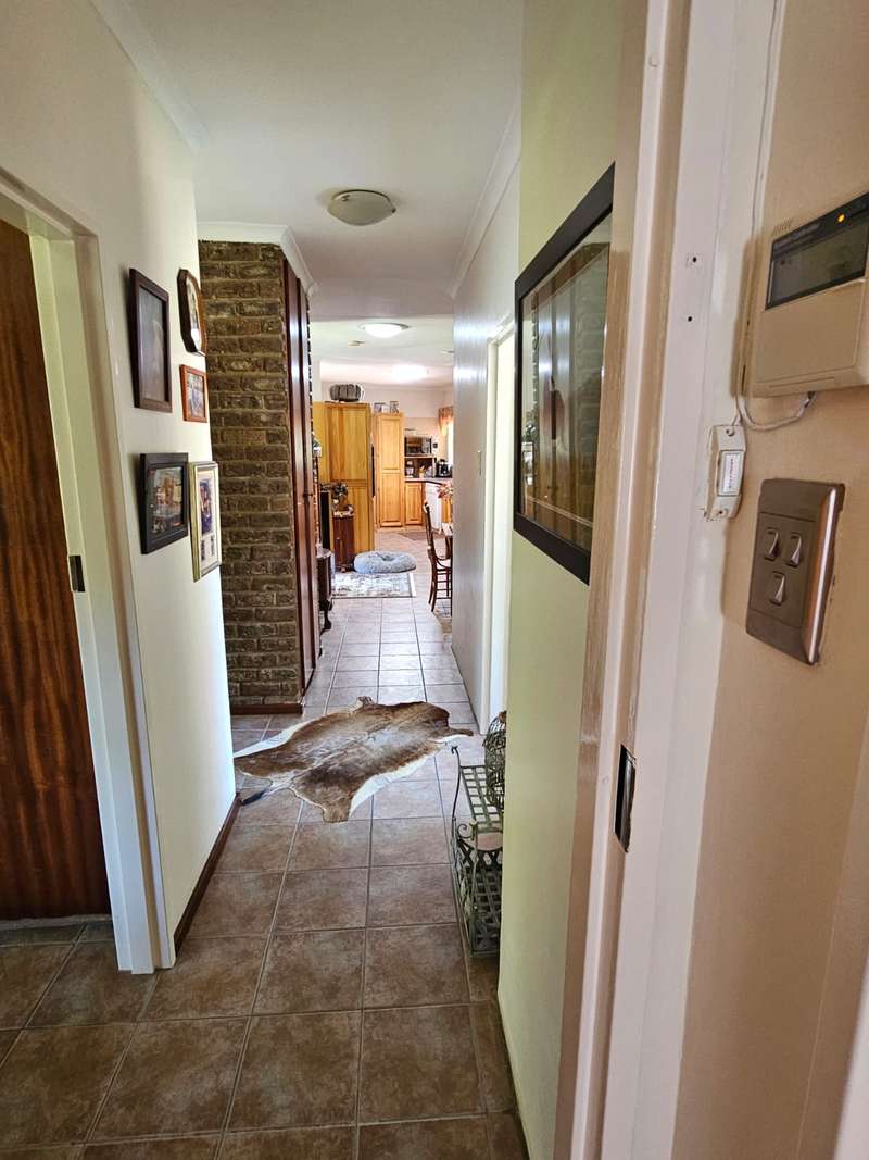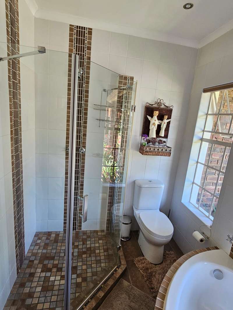 When you enter the gate, a beautiful garden awaits you. The house consists of 3 spacious bedrooms and 2 bathrooms, very modern (MES). Beautiful kitchen and separate scullery, lounge and dining room with separate TV room. Absolute stunning. The veranda is closed with wooden frames, doors leading to pool area and built-in braai to create the perfect picture. Outside shower and toilet for pool area. Brick store room that fits with tiled roof and face brick. The garden at pool is absolutely stunning. Big open back yard with lovely trees. Excellent security, double brick walls with palisade on top. Full security system and alarm system. The house is fully running on its own electricity with 18 large panels, 3 batteries and converter. This house is not a time waster. Call us to view this property!!!