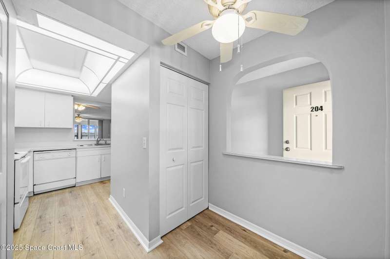 Merritt Towers is a meticulously maintained, professionally managed 224-unit condominium community located directly on Sykes Creek in Merritt Island, Florida. The three eight-story towers are set amidst lush landscaping and offer stunning river views along with unforgettable vantage points for rocket launches. This beautifully updated residence boasts fresh interior paint, a remodeled bathroom, and luxury vinyl plank flooring. Powered hurricane shutters provide added security, enclosed balcony with windows and screen showcases panoramic river views, spectacular launch sights, open layout with an inclusive entertaining area that doubles as guest or extra living space with sliders open. Residents enjoy extensive amenities, including two riverfront pools, a sauna, hot tub, boardwalk, tennis and pickleball courts, a dog park, propane BBQ grills, two car wash stations, a library/game room, and two community clubhouses with full kitchens and bathrooms. The gated community features 24/7 security gate. Conveniently located near Merritt Island Mall, Publix, Aldi, Starbucks, Walgreens, and numerous restaurants, residents also have easy access to CMX Cinemas at Merritt Square Mall and the Veterans Memorial Center, which offers walking trails and a new amphitheater. Monthly maintenance fees include cable, high-speed internet, water, sewer, trash, and recycling. The home comes with a deeded covered parking space, with ample additional parking for residents and guests. If you are looking for that Resort-style living on a budget, this property is for you. Schedule your appointment today.