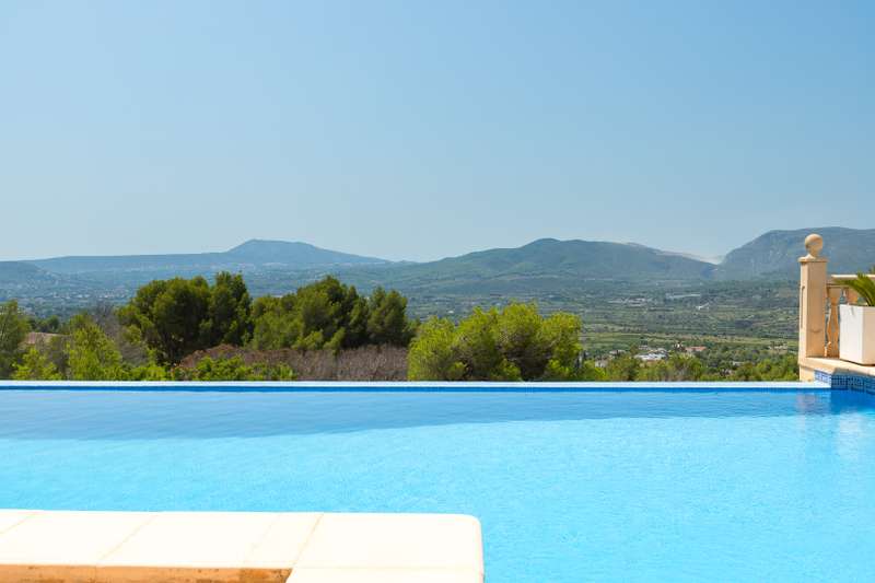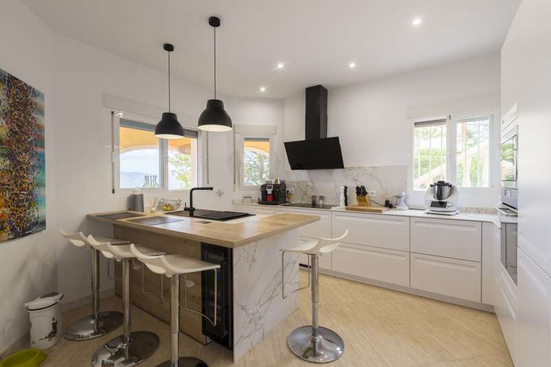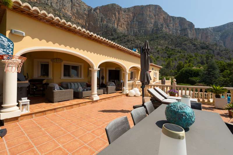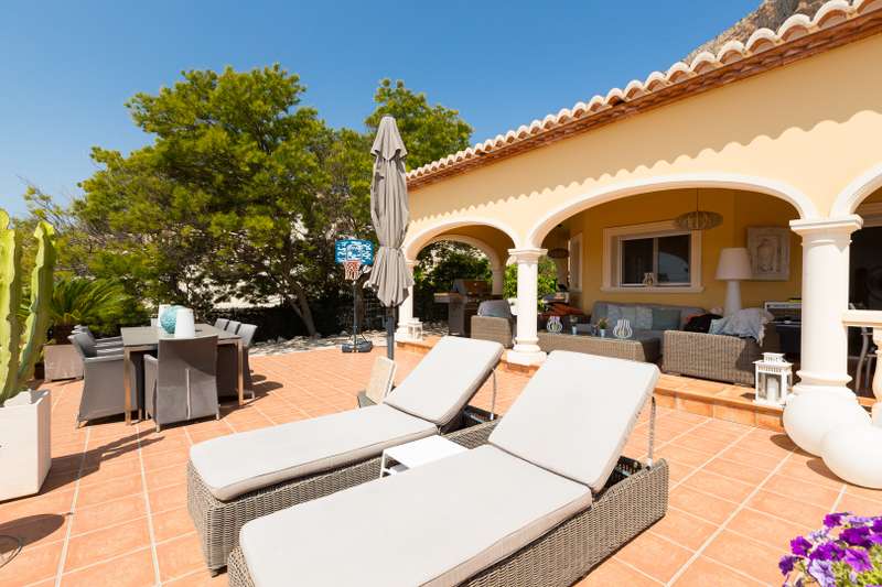 Introducing a villa located in the prestigious Montgó area of Jávea, Alicante. This property stands out for its privileged location on the mountainside, offering stunning panoramic views and a peaceful environment, while being close to all amenities and the town center. The home features three spacious bedrooms, each with its own en-suite bathroom, ensuring privacy and comfort for all family members or guests. Additionally, there is a guest toilet for added convenience. The main living room, fully furnished, includes a pellet fireplace that provides warmth and a cozy atmosphere. Climate control is guaranteed with individual air conditioning in every room and underfloor heating throughout the house, complemented by gas heating. Outside, the villa boasts a spectacular heated private pool, surrounded by a well-maintained garden with an automatic irrigation system, ideal for year-round enjoyment. The various terraces, both covered and uncovered, allow you to make the most of the Mediterranean climate and mountain views. Among the leisure spaces, there is a pétanque court, perfect for social gatherings and outdoor activities. The property is in excellent condition and includes additional features such as an alarm system, independent laundry room, and a private terrace ideal for relaxation. Although it does not have a garage, its proximity to the village and the spaciousness of the plot make access and parking easy. This villa represents a unique opportunity for those seeking an exclusive residence in Jávea, with all the comforts and in an incomparable natural setting.