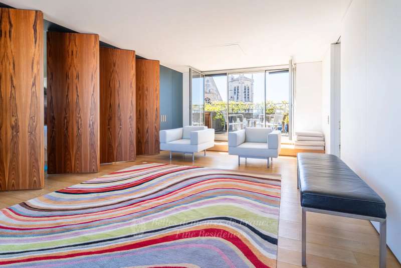 Luxembourg Gardens neighbourhood. This 230 sqm apartment benefiting from balconies is on the top floors of a luxurious Haussmannian building. It includes a spacious south-facing living/reception room bathed in sunshine and commanding picture-postcard views of Place du Panthéon and the church, a kitchen with dining facilities, two bedrooms with bathrooms, and a study. Commanding a breathtaking view of the capital and its landmarks, the upper floor comprises a master suite opening onto two terraces, and a study/home cinema. A parking space nearby is available for rental or purchase. Henri IV catchment area.