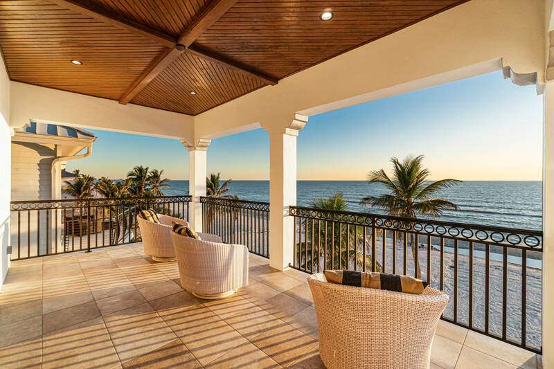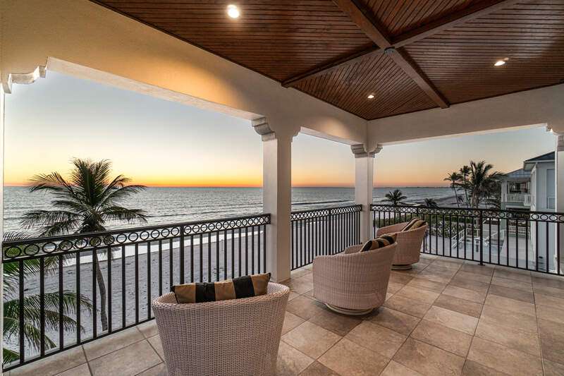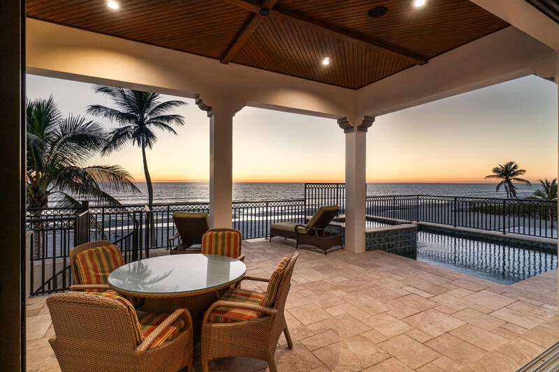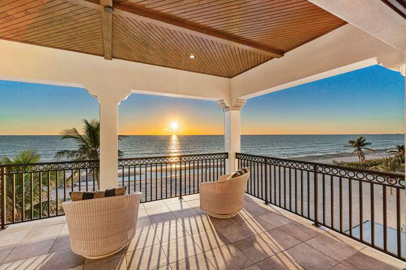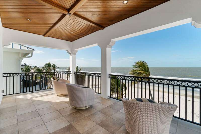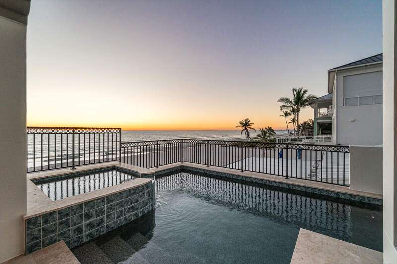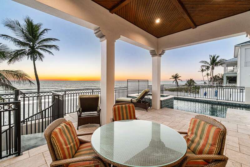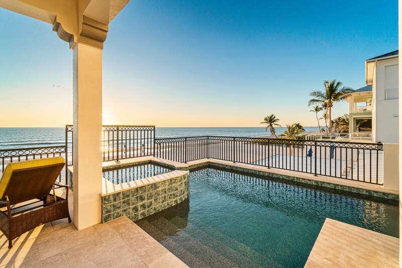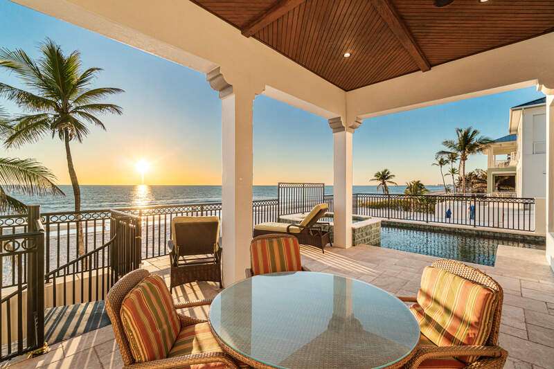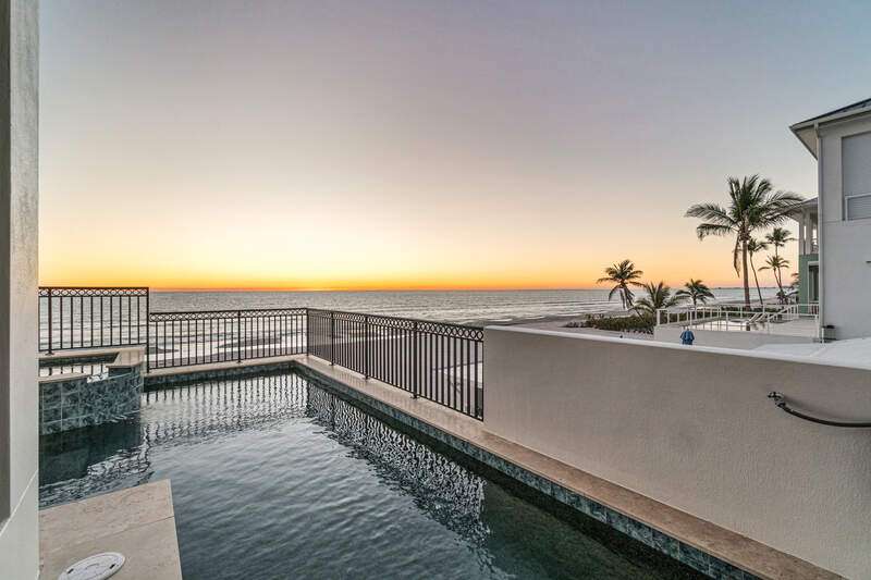 Stunning & newer-built beachfront home with breathtaking views of the Gulf, ideally situated on the highly coveted Bonita Beach. With unobstructed views of the turquoise waters and pristine white sands, this home is a true coastal gem. Built like a fortress, this home features all concrete-block construction and brand-new hurricane impact windows and sliders. Perfect for entertaining, the spacious open floor plan includes 4 bedrooms, 5.5 bathrooms, an expansive upstairs bonus room, and a versatile ground-floor flex space. Step outside to a private backyard oasis, complete with a RARE elevated pool and spa, a summer kitchen, and panoramic Gulf views. Inside, you'll find luxurious finishes throughout, including custom wood-paneled coffered ceilings and a seamless blend of hardwood and travertine tile flooring. The chef's kitchen boasts granite countertops, an oversized island, light colored custom cabinetry, an eat-in area, and a breakfast bar perfect for casual dining. Adjacent to the kitchen is a custom bar area with a built-in wine cooler, wet bar, and additional bar seating-ideal for entertaining guests. The expansive primary suite offers a serene retreat with sweeping Gulf views, a private balcony to enjoy spectacular sunsets, and a spa-like bathroom with dual vanities, a frameless glass shower, and a separate soaking tub. The upper-floor bonus room is a versatile space, complete with an ensuite bathroom, wet bar with beverage cooler, and an open-air balcony-perfect for a media room, office, or additional living area. Additional features of this home include a private elevator and a smart lighting system. Close to several fantastic restaurants and only a 10-minute drive to Mercato and the Promenade, with Waterside Shops, Coconut Point, Naples 5th Ave, and the International Airport nearby. Live the ultimate coastal lifestyle with sweeping views of the Gulf-this is luxury living at its finest!