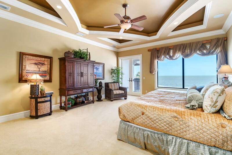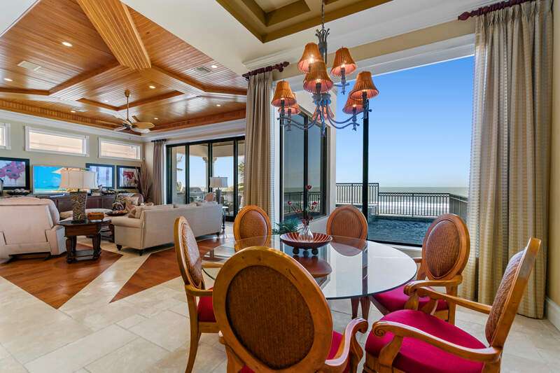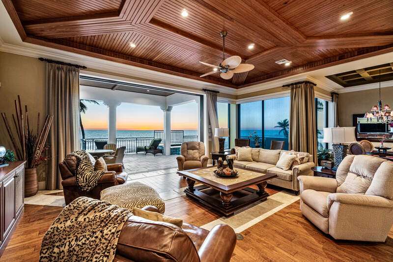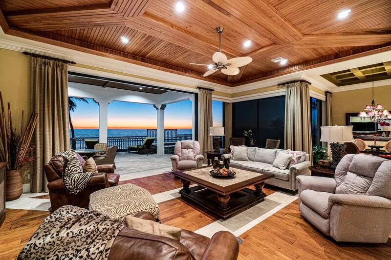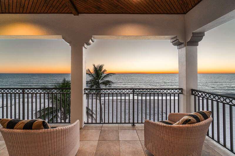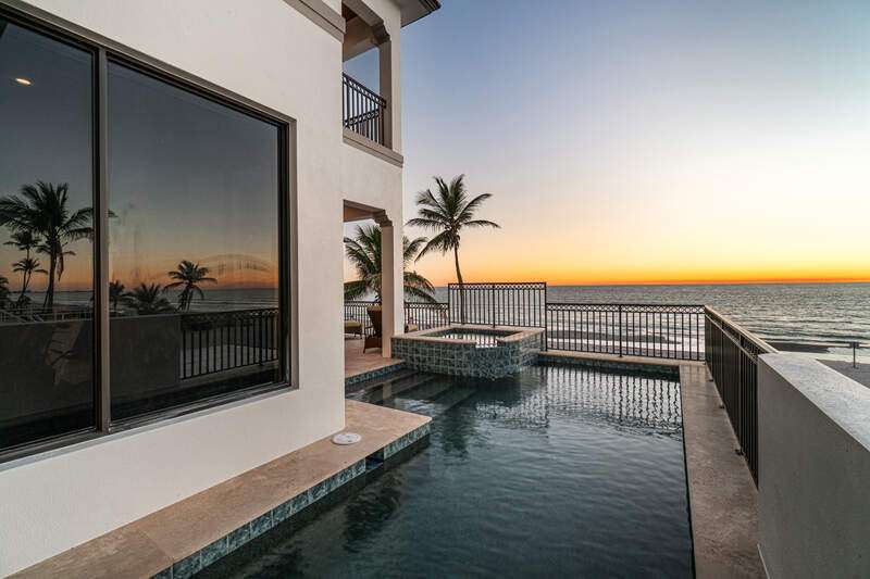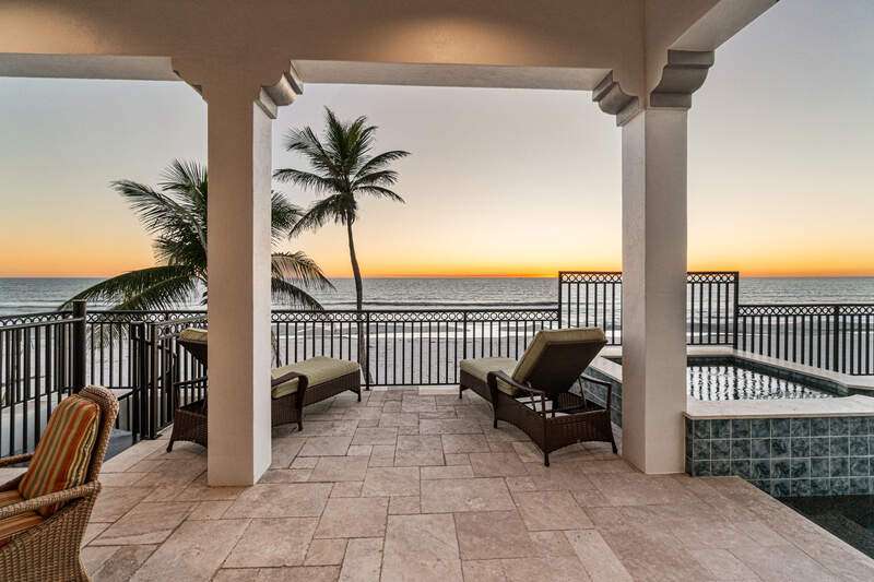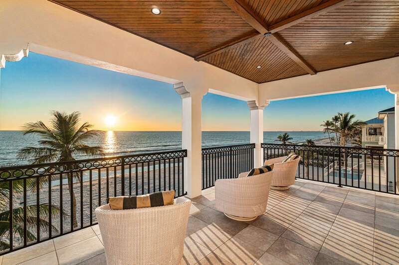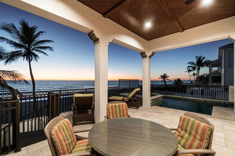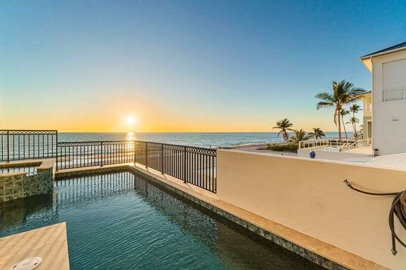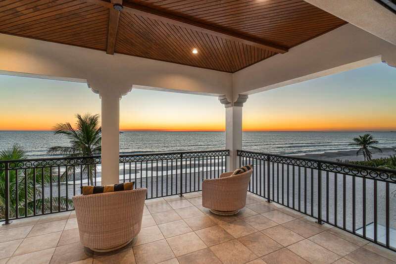 Stunning & newer-built beachfront home with breathtaking views of the Gulf, ideally situated on the highly coveted Bonita Beach. With unobstructed views of the turquoise waters and pristine white sands, this home is a true coastal gem. Built like a fortress, this home features all concrete-block construction and brand-new hurricane impact windows and sliders. Perfect for entertaining, the spacious open floor plan includes 4 bedrooms, 5.5 bathrooms, an expansive upstairs bonus room, and a versatile ground-floor flex space. Step outside to a private backyard oasis, complete with a RARE elevated pool and spa, a summer kitchen, and panoramic Gulf views. Inside, you'll find luxurious finishes throughout, including custom wood-paneled coffered ceilings and a seamless blend of hardwood and travertine tile flooring. The chef's kitchen boasts granite countertops, an oversized island, light colored custom cabinetry, an eat-in area, and a breakfast bar perfect for casual dining. Adjacent to the kitchen is a custom bar area with a built-in wine cooler, wet bar, and additional bar seating-ideal for entertaining guests. The expansive primary suite offers a serene retreat with sweeping Gulf views, a private balcony to enjoy spectacular sunsets, and a spa-like bathroom with dual vanities, a frameless glass shower, and a separate soaking tub. The upper-floor bonus room is a versatile space, complete with an ensuite bathroom, wet bar with beverage cooler, and an open-air balcony-perfect for a media room, office, or additional living area. Additional features of this home include a private elevator and a smart lighting system. Close to several fantastic restaurants and only a 10-minute drive to Mercato and the Promenade, with Waterside Shops, Coconut Point, Naples 5th Ave, and the International Airport nearby. Live the ultimate coastal lifestyle with sweeping views of the Gulf-this is luxury living at its finest!