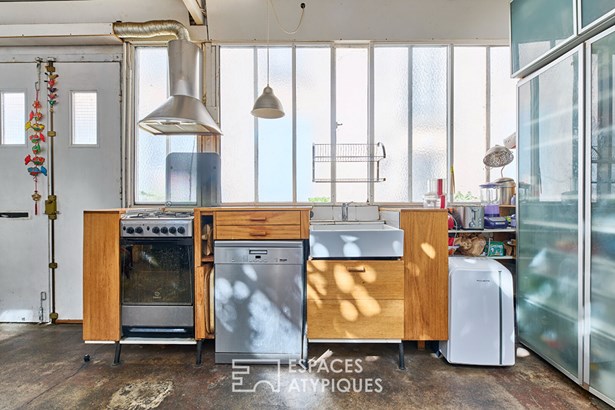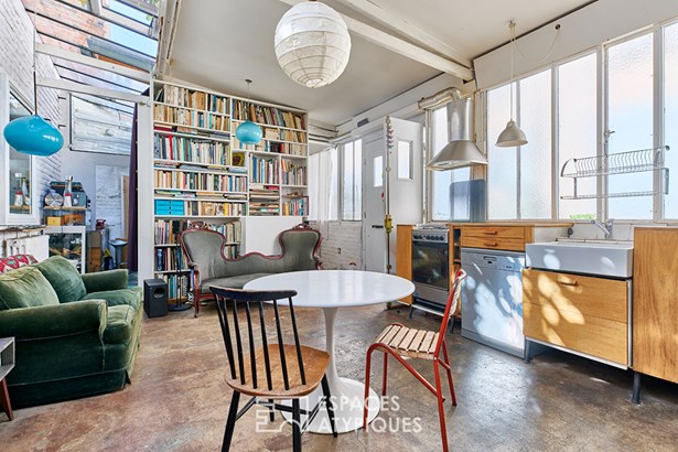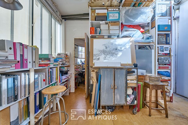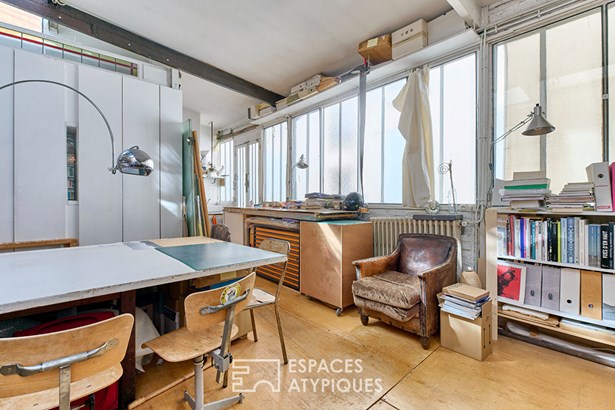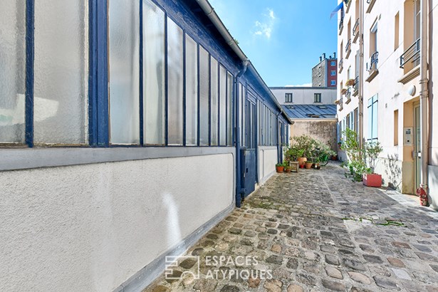 In the heart of Jourdain village, nestled in a peaceful courtyard between the Buttes Chaumont and Belleville, this 84m2 (900 sq ft) Carrez law artist's studio offers a unique living environment.