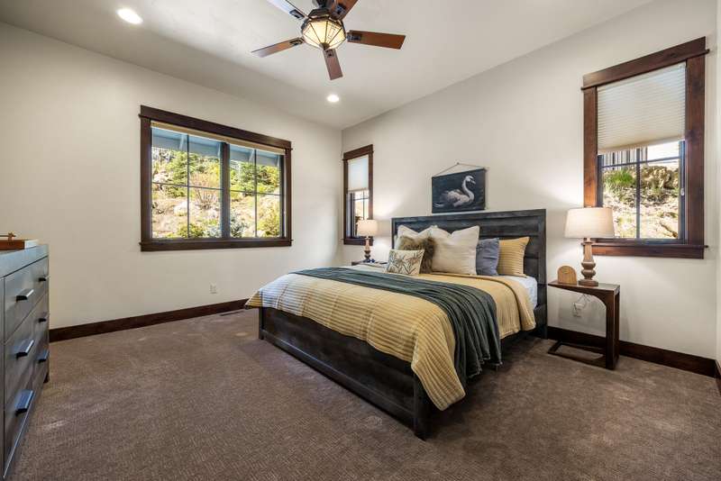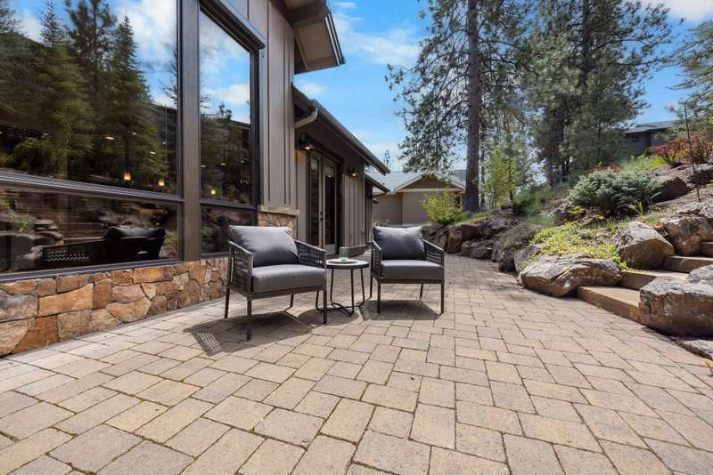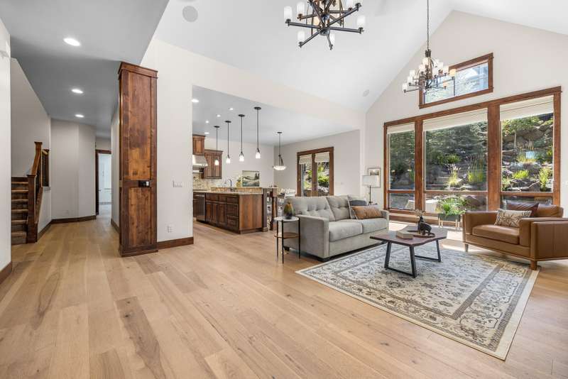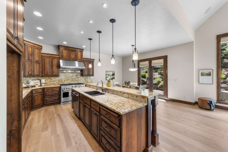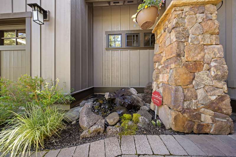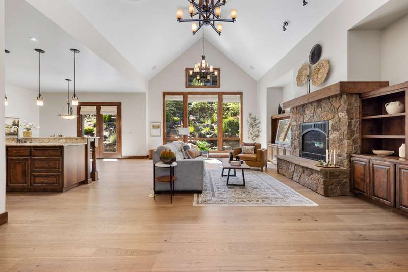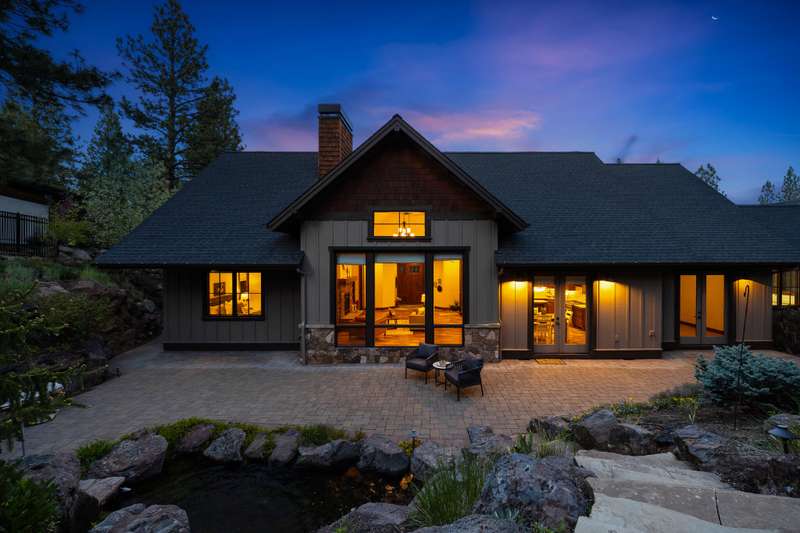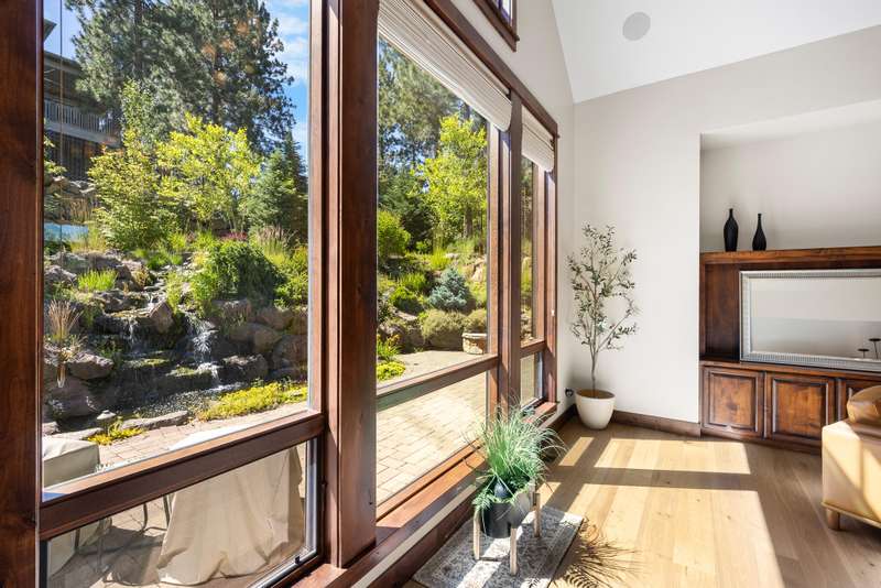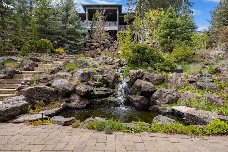Embrace tranquil luxury in this stunning retreat! Vaulted great room windows capture serene water features & lush landscaping. Entertain in a gourmet kitchen w/ Monogram range & granite. Hickory floors flow to a vaulted bonus & spa-inspired primary suite w/ soaking tub, dual-head shower & heated floors. Enjoy a paver patio by the stream, natural gas BBQ, dual-zone HVAC, generator & custom details throughout. Nature's beauty meets modern comfort in this exquisite home—an exceptional place to live! From the owner, Frogs come out for a visit about tax day and leave about Memorial day. It's so pleasant to fall asleep to their songs. About the same time of the year two male Mallards and a Hen come and stay for a few weeks. I never tire of their beauty and devotion to one another.Great Room W/Vaulted ceilings and large picture windows with Hunter Douglas blinds offer breathtaking views of the waterfall and pond.