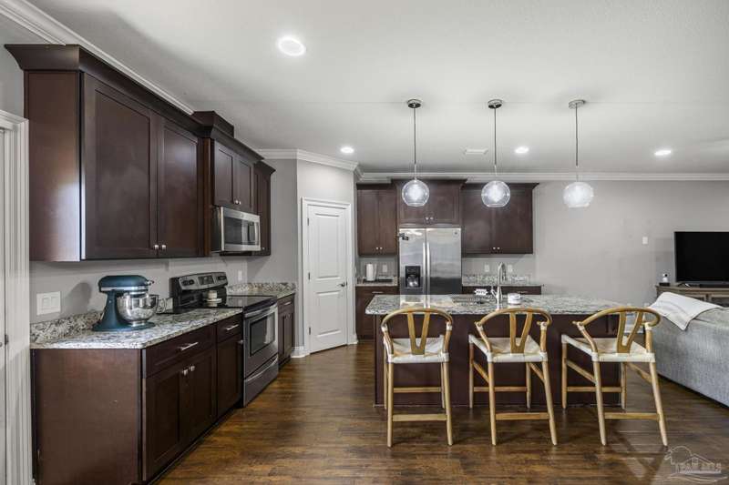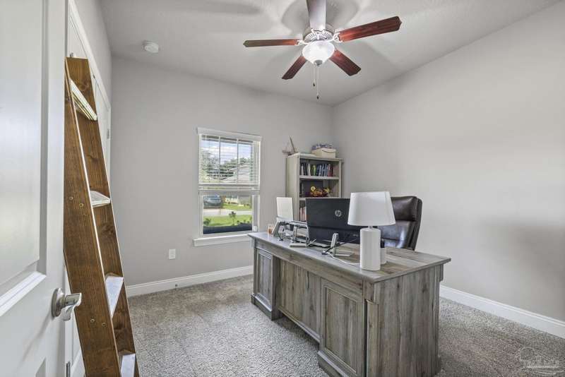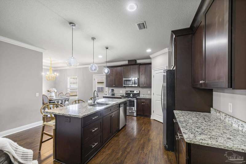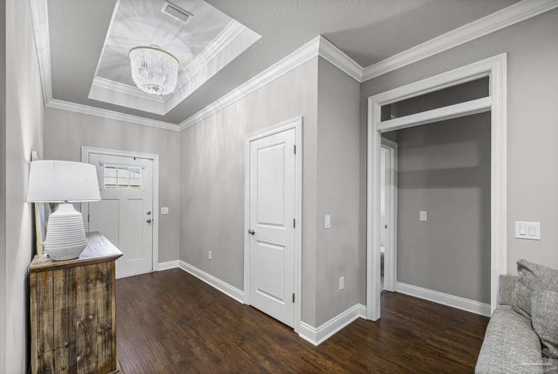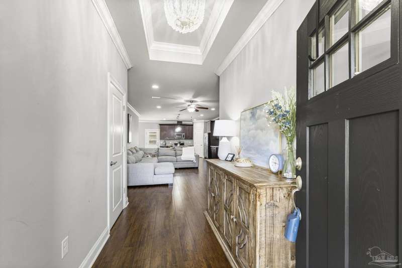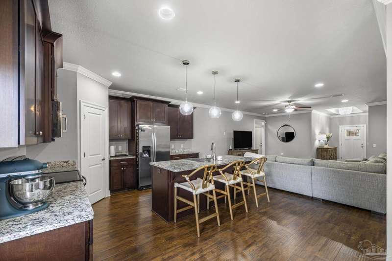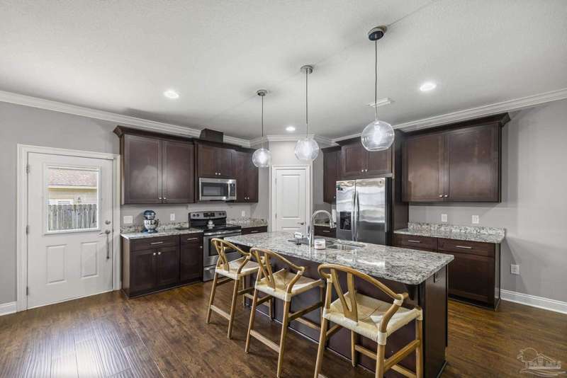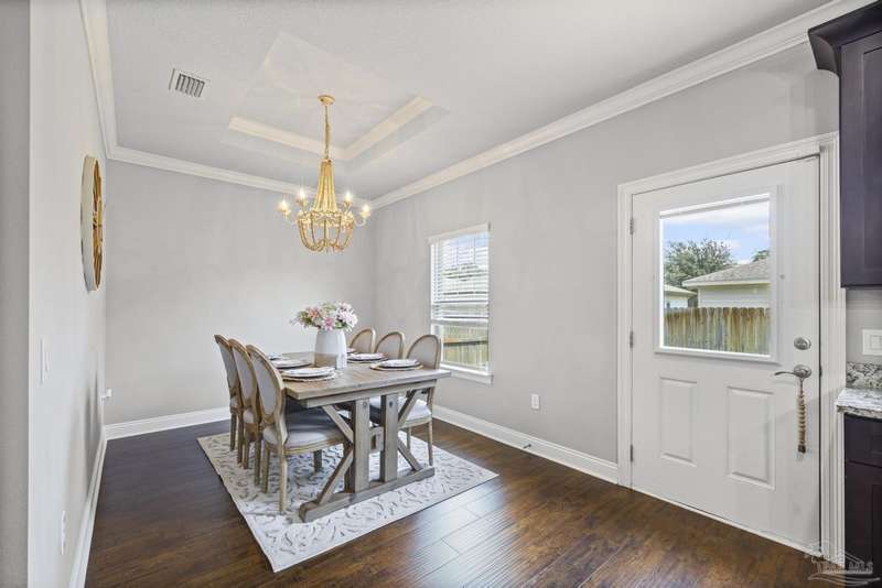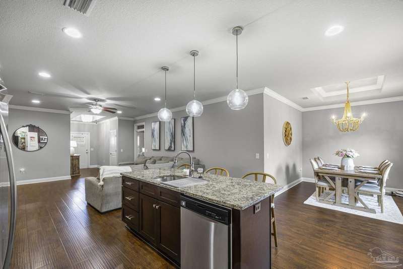 Move-in ready 3 bedroom, 2 bathroom single-family home with 1623 sq ft of living space. Built in 2015, this property offers No HOA and sits on a quiet street in Navarre. Inside you'll find an open floor plan with wood laminate flooring in the main living areas, neutral tile in the wet zones, and carpet in the bedrooms. The primary suite features a tray ceiling, custom walk-in closet with built-ins, and a private bath. Crown molding, wide baseboards, transom windows, and upgraded doors and hardware add detail throughout. The kitchen features granite countertops, stainless steel appliances, breakfast bar seating along with a separate dining room, plenty of cabinet space and a pantry. The exterior is clad in durable Hardie board with an architectural shingle roof. Outdoor features include a covered front porch, fenced backyard, sprinkler system, and two-car garage. Located in East Navarre close to Hurlburt Field, Eglin AFB, shopping, schools, dining, and the white sand beaches of Navarre.