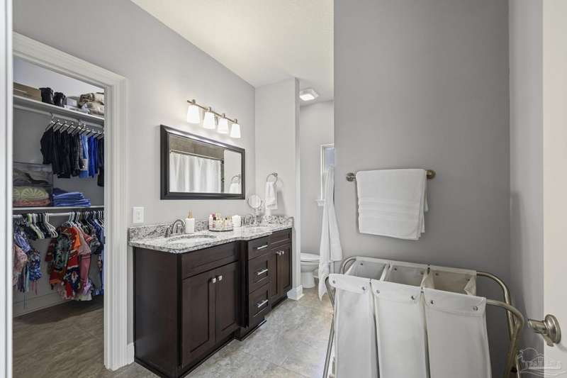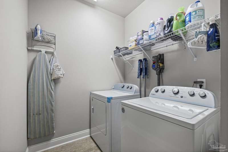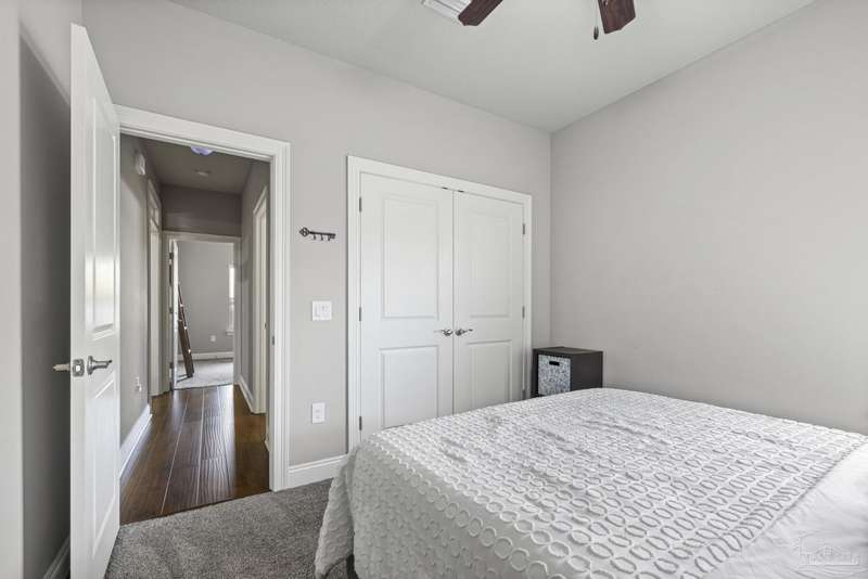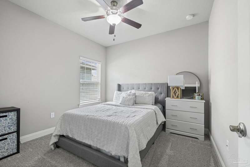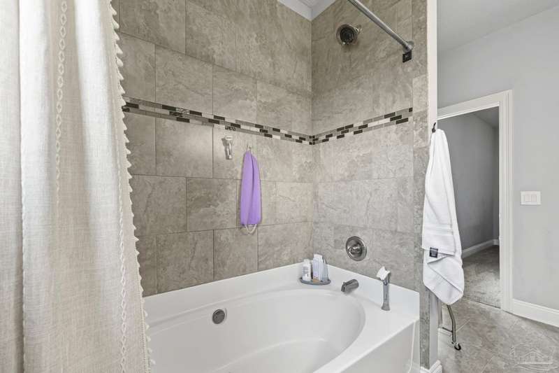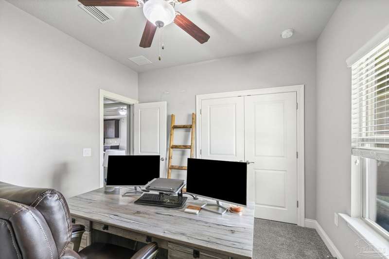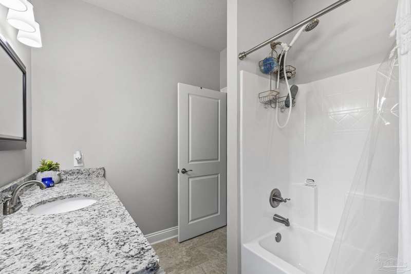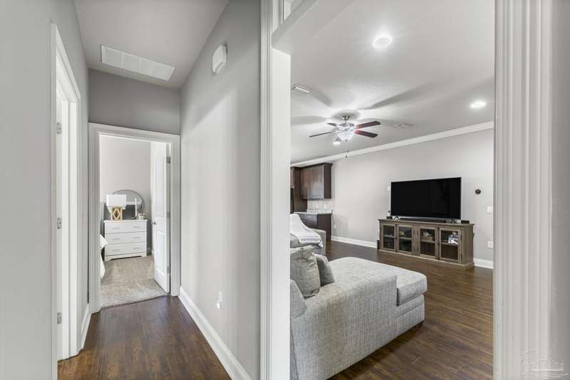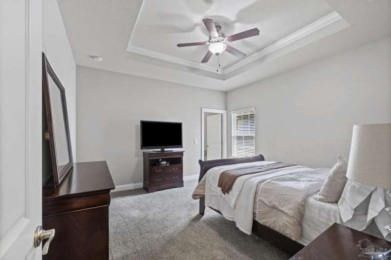 Move-in ready 3 bedroom, 2 bathroom single-family home with 1623 sq ft of living space. Built in 2015, this property offers No HOA and sits on a quiet street in Navarre. Inside you'll find an open floor plan with wood laminate flooring in the main living areas, neutral tile in the wet zones, and carpet in the bedrooms. The primary suite features a tray ceiling, custom walk-in closet with built-ins, and a private bath. Crown molding, wide baseboards, transom windows, and upgraded doors and hardware add detail throughout. The kitchen features granite countertops, stainless steel appliances, breakfast bar seating along with a separate dining room, plenty of cabinet space and a pantry. The exterior is clad in durable Hardie board with an architectural shingle roof. Outdoor features include a covered front porch, fenced backyard, sprinkler system, and two-car garage. Located in East Navarre close to Hurlburt Field, Eglin AFB, shopping, schools, dining, and the white sand beaches of Navarre.