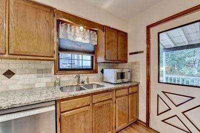 Welcome home to this lovingly maintained home by the same owners for the past 28 years! This home is truly move in ready - it's been freshly painted inside since the sellers moved out; the carpets have been cleaned; fresh mulch spread in the front and backyard; HVAC last serviced in July and thermostat replaced. The windows were replaced, and the deck was extended and partially covered in 2011; the kitchen and primary bathroom remodeled in 2015; upstairs carpet replaced in 2021 and primary bedroom carpet replaced in 2023; exterior of the house was repainted in 2023 and new garage doors installed in 2023 as well. This home offers the opportunity to own in award-winning Lassiter High School district, with a Roswell address (but lower Cobb County taxes), with no HOA. The stone accent on the exterior is the same stone as the floor-to-ceiling fireplace in the living room and is absolutely stunning in person. You'll also love the vaulted ceilings in the living room (with the incredible stone fireplace) and the primary bedroom which really make the rooms feel incredibly open. The sellers will tell you that they loved the home because it feels like a cabin in the woods, but right in the middle of Roswell. They loved the peace of the front porch, as well as the huge rear deck and the private, wooded view. One of their favorite spots was the swing under the deck and they've left the swing for the owners to fall in love with as well.