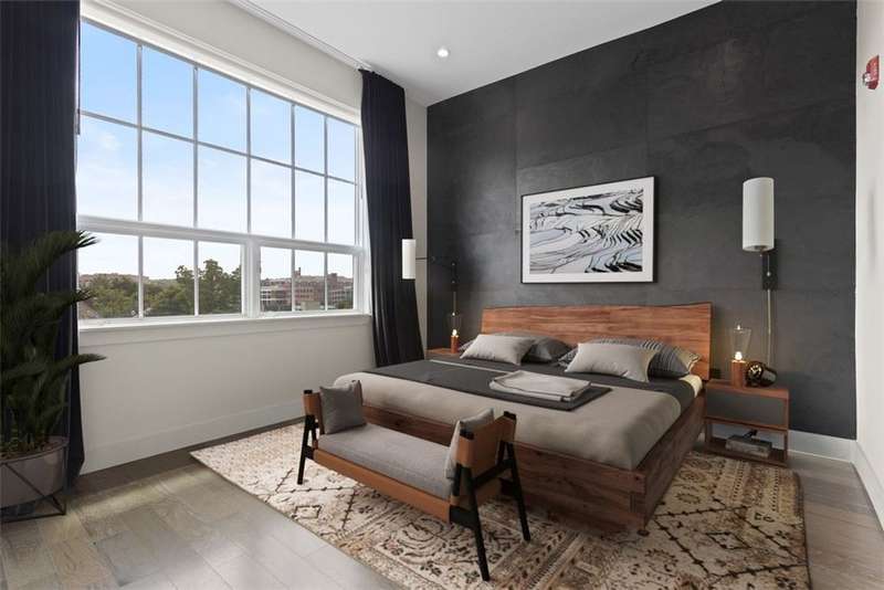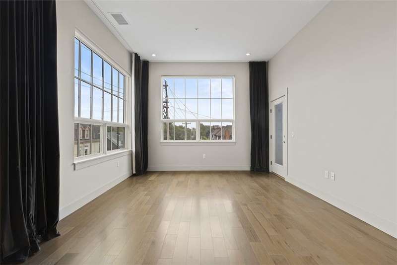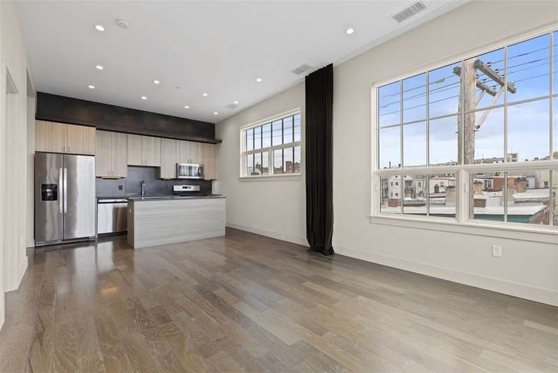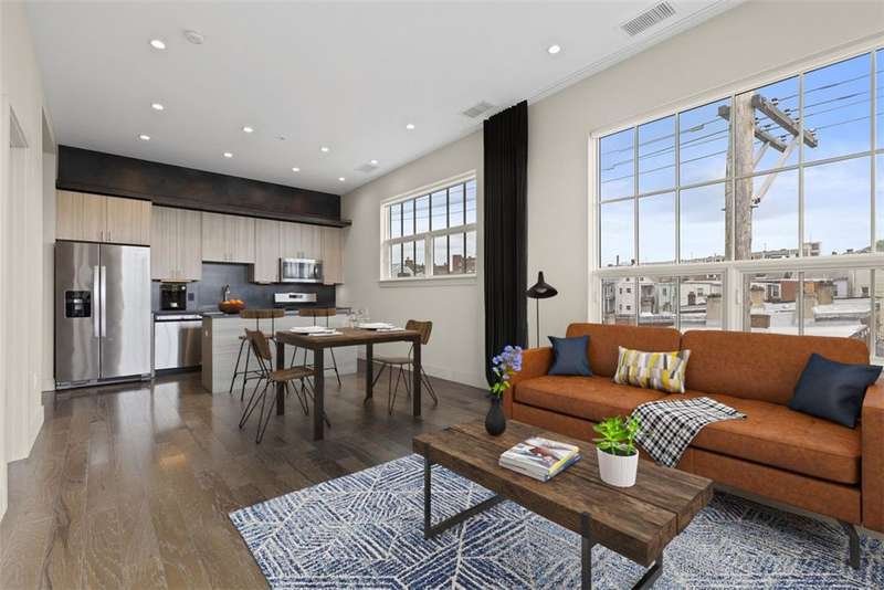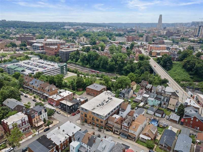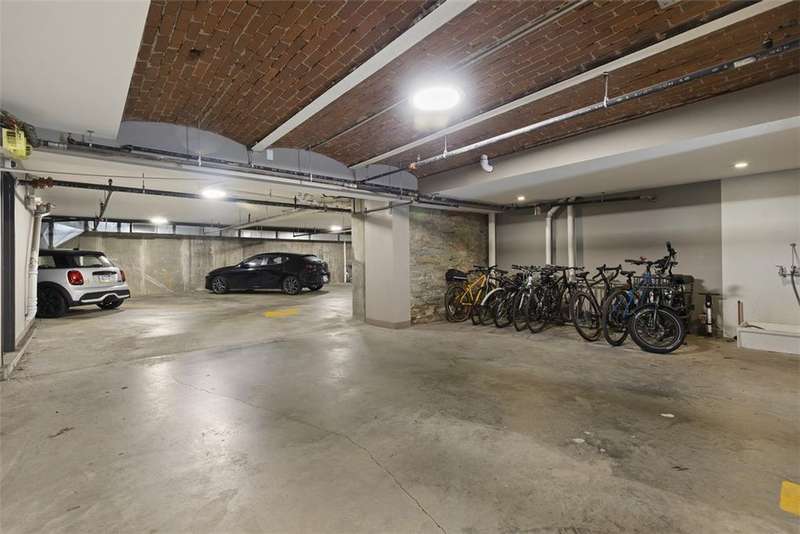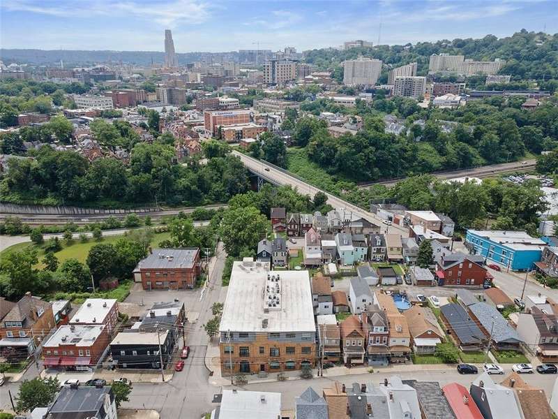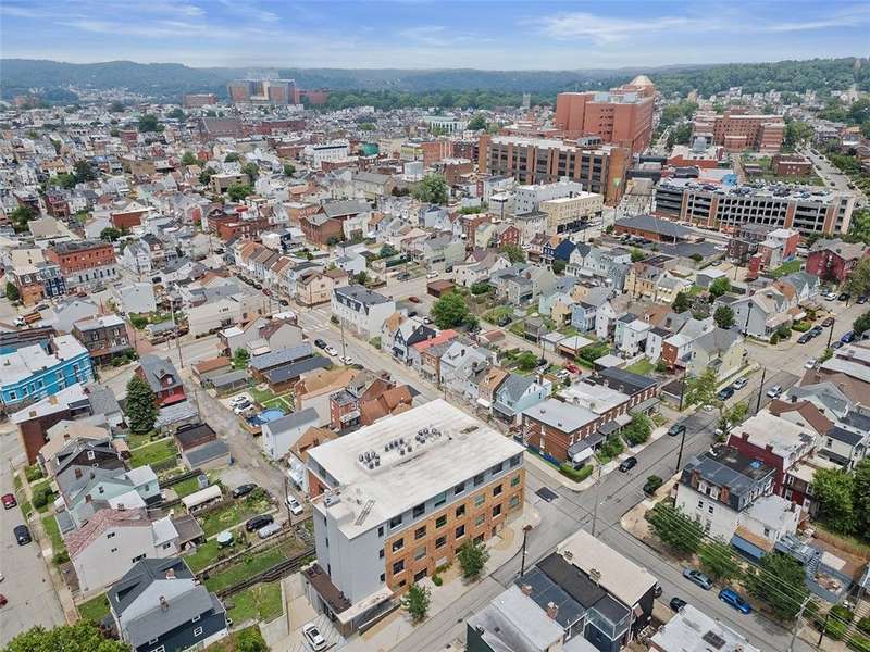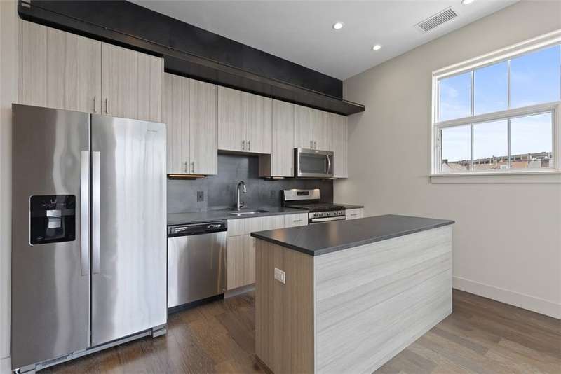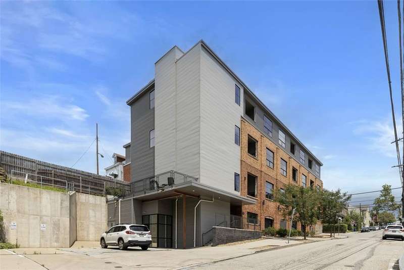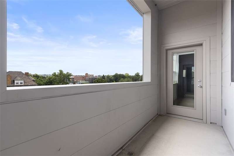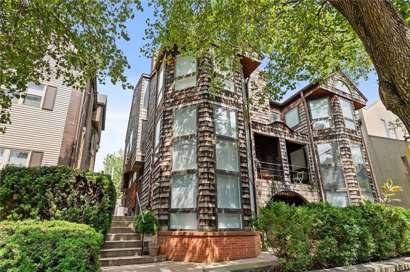 Positioned above tree-lined streets in a tranquil Bloomfield neighborhood, this recently renovated 2 bedroom, 2 1/2 bath condominium that offers in-unit laundry, exemplifies sophisticated urban living.The entryway to the top-floor unit showcases woven navy wallpaper, crisp white trim, & warm hardwood flooring. An open floor plan features expansive windows that provide abundant natural light and stunning views. The kitchen is equipped with modern flat-panel cabinetry, soapstone countertops and backsplash, a central island, and Stainless-Steel Whirlpool appliances. Adjacent to the living room is a private terrace. Both bedrooms offer an abundance of closet space and recently renovated bathrooms. Conveniently located minutes from Pittsburgh's major hospitals and shopping districts, this prestigious turn-of-the-century building has 18 units and deeded garage parking, a fitness center, dog wash station, shared outdoor areas, and lift access.