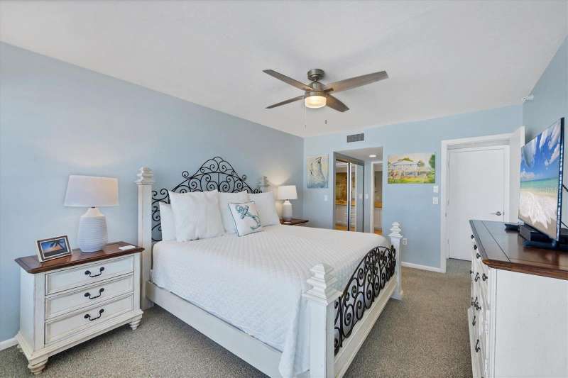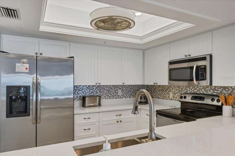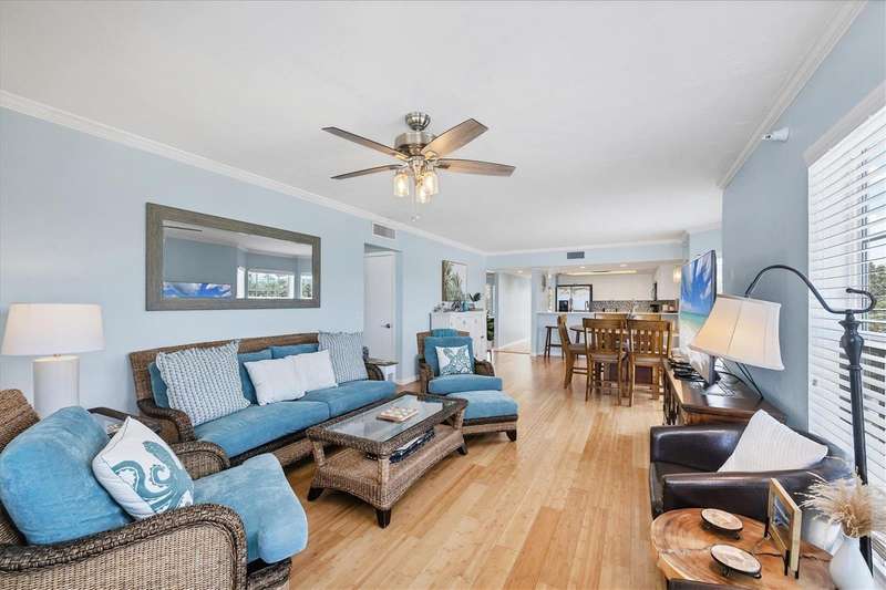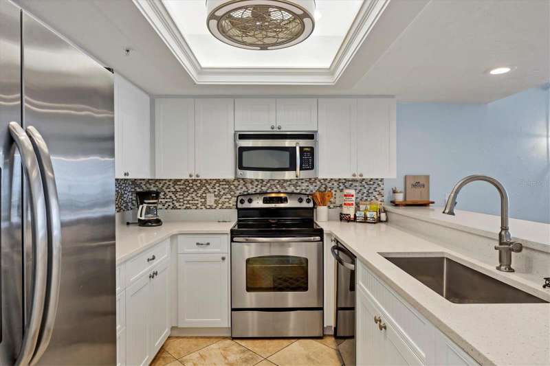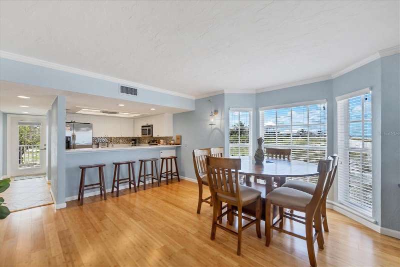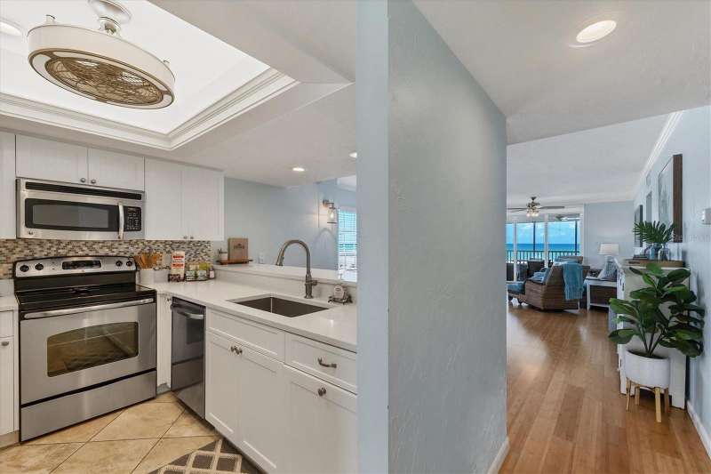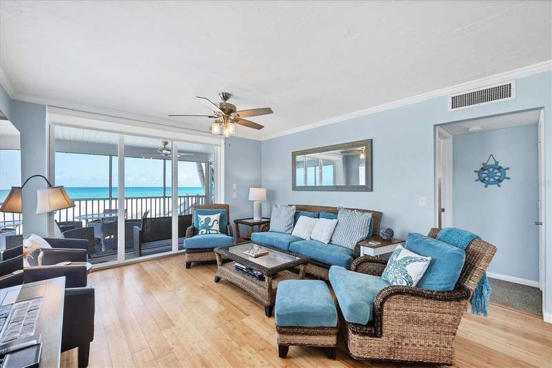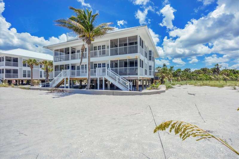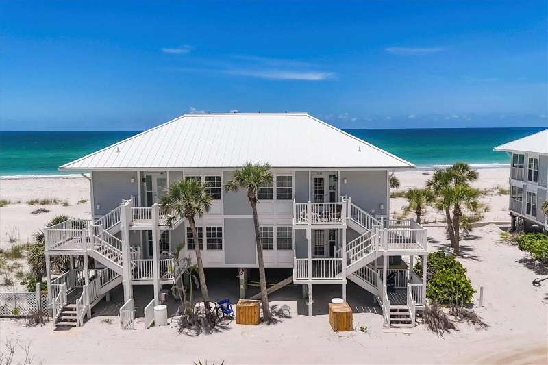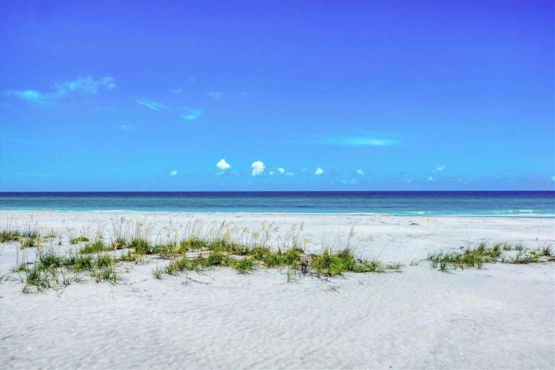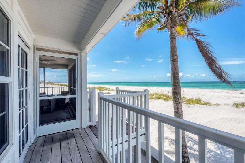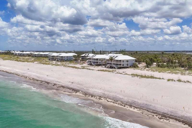 This without a doubt is the MOST SPECTACULAR 2-bedroom 2-bathroom villa with unobstructed coastline views on beautiful Palm Island! Within a few steps of exiting your beachfront lanai you're on the beach basking in the sun, collecting seashells and shark teeth, and watching the dolphins and manatees play. The beach is so quiet and quaint it will feel as if you are the only one living on Palm Island. Entertain your friends and family from your back porch and watch the amazing colorful sunsets that can only be seen from your covered screened in lanai. The long miles of beach views are endless from your primary bedroom, dining room, kitchen and covered lanai. This 1232 square foot home comes completely furnished and has had recent major improvements including: new AC unit installed (2021), new quartz countertops and stainless steel sink in kitchen (July 2022), new granite bathroom countertops and sinks (July 2022), freshly painted cabinets in both bathrooms (July 2022), new paint throughout the entire villa (July 2022), NEW flat screen televisions in ALL rooms including family room (60” inch) and both bedrooms (2022) , new fans installed throughout entire unit (July 2022), new sea turtle approved roller shade in family room (September 2022), new hot water heater (2022) and a NEW ROOF . The villa has been recently redecorated (July 2022) and can also be used as a rental within Palm Island Resort if so desired. This home has bamboo floors in the main living areas with tile in the kitchen and bathrooms. There is a comfortable king-sized bed in the primary bedroom with private en-suite and dual built-in closets. The second bedroom includes two twin-sized beds with built-in closets. Two additional closets within the unit provide ample space for any extra pool/beach accessories. The kitchen has slow-close cabinets and is fully stocked for all your cooking needs. The laundry room with a stacking washer/dryer, mini fridge, storage cabinet, and sink and window with beach view, so makes doing laundry FUN! Extras outside the villa is a outdoor shower, two-foot showers, and deck box to hold beach chairs and beach canopies. This golf cart only friendly island includes a community pool, restaurant at Palm Island Resort (Rum Bay), tennis courts, spa/workout center, boat docks, 24-hour security, and many other amenities to be enjoyed! A short ferry ride is all it takes to get to this incredible private oasis. No matter where you are on Palm Island, you will never regret owning this little piece of paradise.