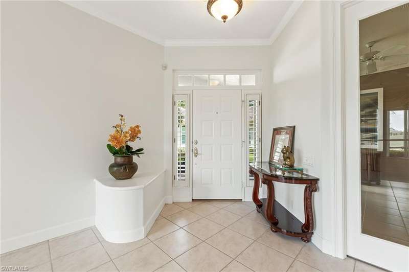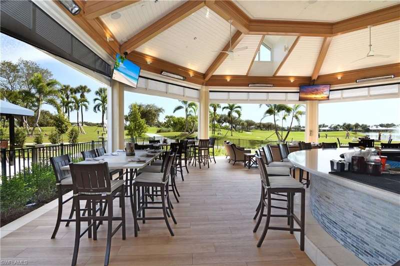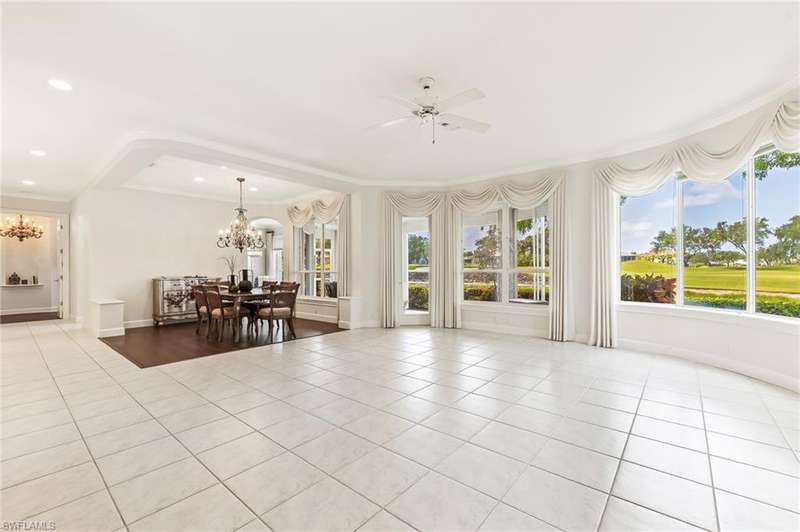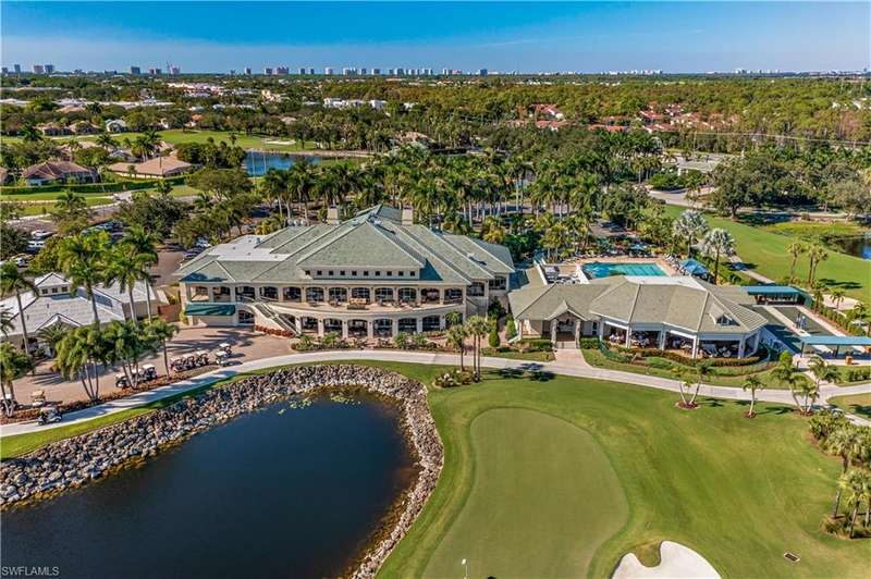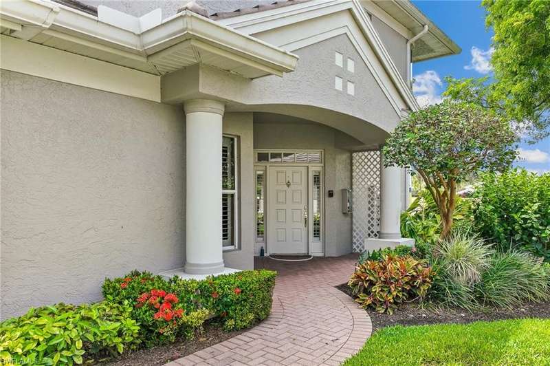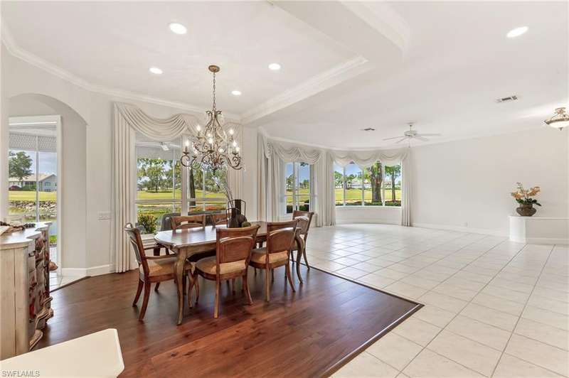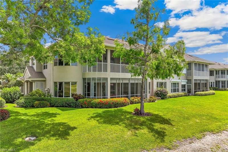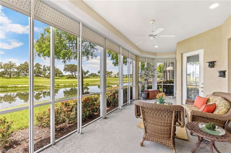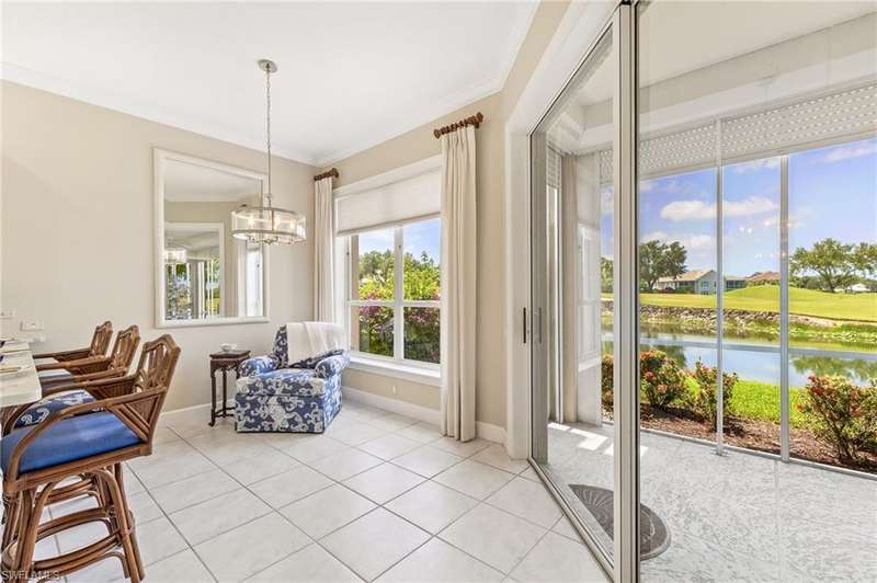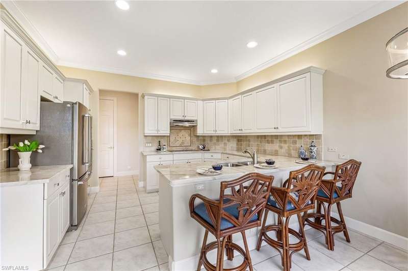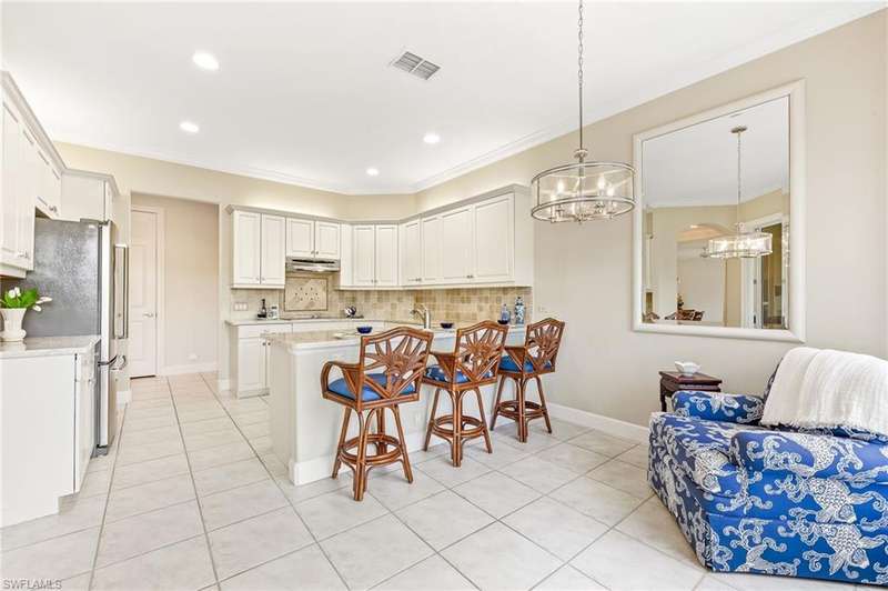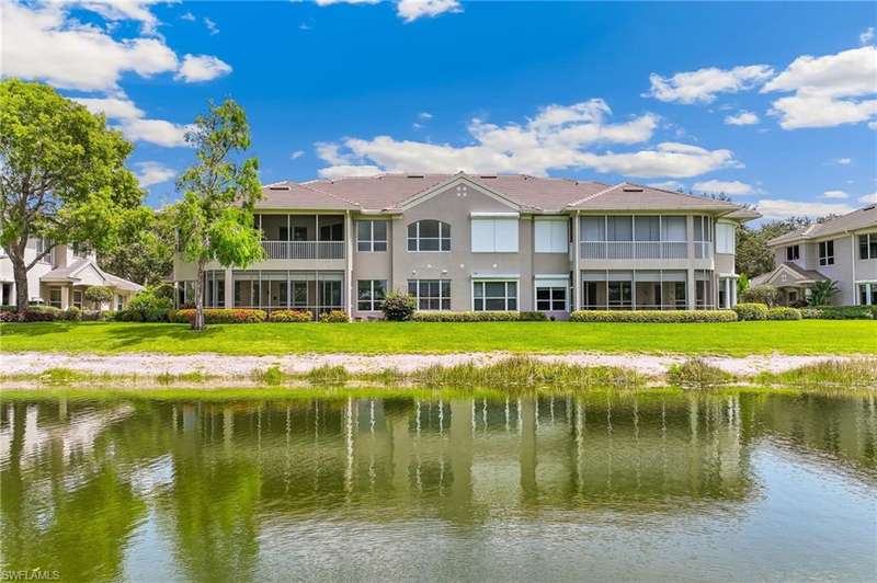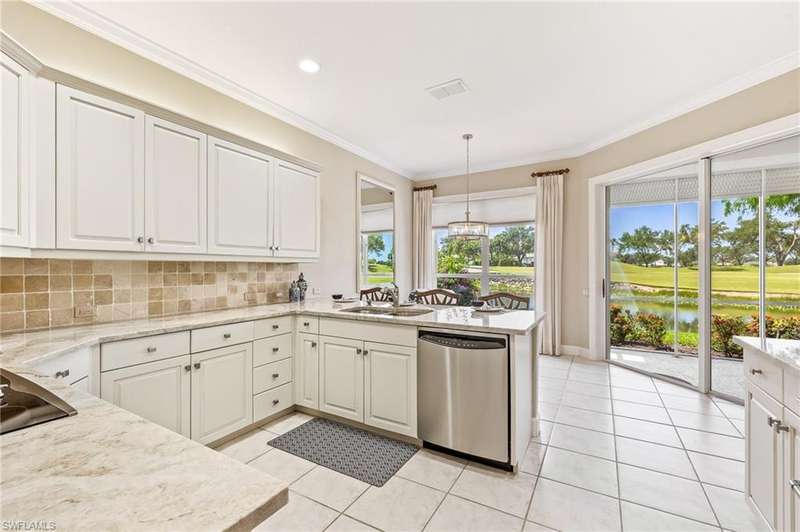Stunning End Unit in Kensington Golf & Country Club. Experience the best of Naples living in this beautifully maintained end-unit condo located in the prestigious gated community of Kensington Golf & Country Club. This light-filled residence lives like a single-family home and offers breathtaking panoramic views of the lake and golf course. The split Floor plan is ideal for family and friends. Over 2,000 sq. ft. with 2 bedrooms plus den / 2 full baths. The den with a garden door could easily accomodate a 3rd bedroom and / or home office. From the moment you walk in, you're welcomed by a wall of windows and sliding glass doors that bring the outdoors in. The open floor plan features tile flooring throughout the main living areas and warm wood-look flooring in the dining room and both bedrooms blending elegance with easy maintenance. The kitchen is a chef s delight, featuring quartz countertops, stainless steel appliances, and ample storage. The spacious primary suite offers lanai a