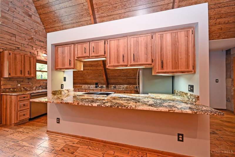 Stunning stone A-Frame situated on 3.10 acres down a long private drive with updates galore!! Custom stonework, hardwood floors, beamed ceilings, a full finished lower level and updated kitchen and baths. This tranquil setting offers an abundance of natural beauty, wildlife and privacy. First floor laundry, oversized garage and great outdoor entertaining space, including a covered deck and paver patio fit perfect for any lifestyle. The ideal mix of country living but with the close proximity to highways and entertainment. You will not be disappointed in this special home.