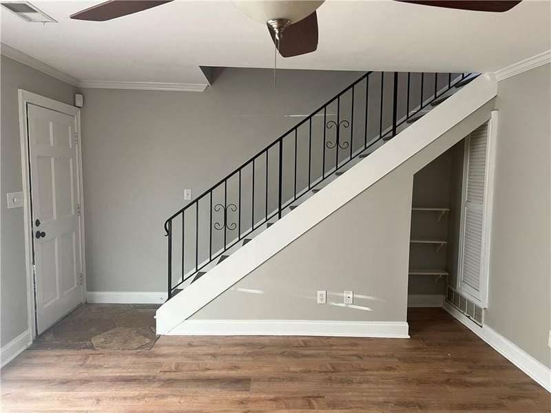 This delightful townhome, convenient to 75/285/Vinings, has been updated and freshly painted throughout & the space has been maximized. Hardwoods greet w/ crown molding in the lg family room, giving way to a breakfast nook at back of home. French doorsleading out to private patio that backs up to woods. Kitchen w/ granite & ss appliances overlooks breakfast nook. Brand new and highlyefficient HVAC system. Sunny master w/ walk in closet & en suite bath w/ wainscoting & tile at front of home & 2nd bedroom w/ it's own bath sit at the back. Washer and Dryer included and located upstairs. We are currently looking for tenants to occupy starting July 31st. Thank you!