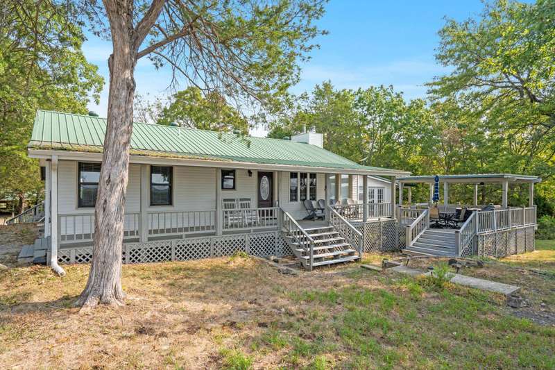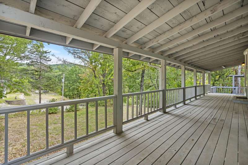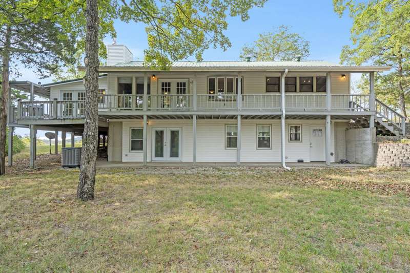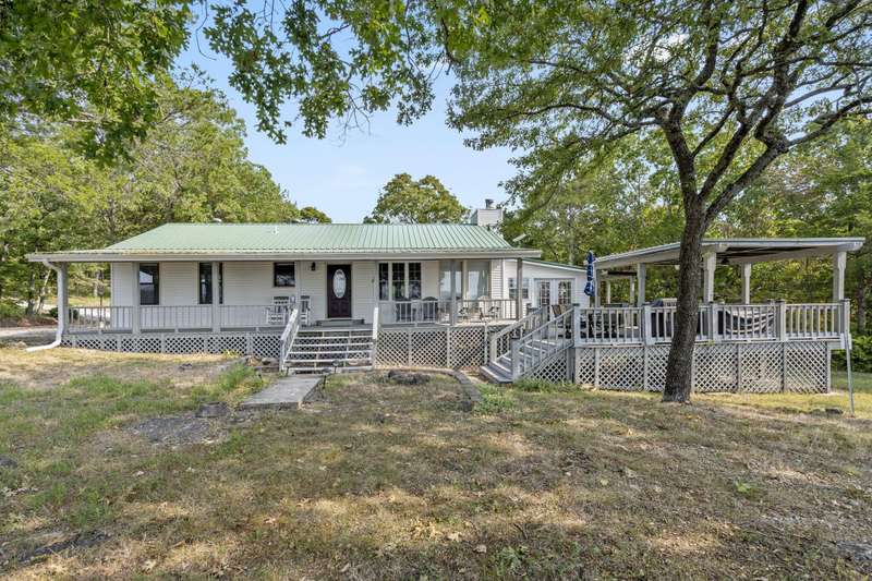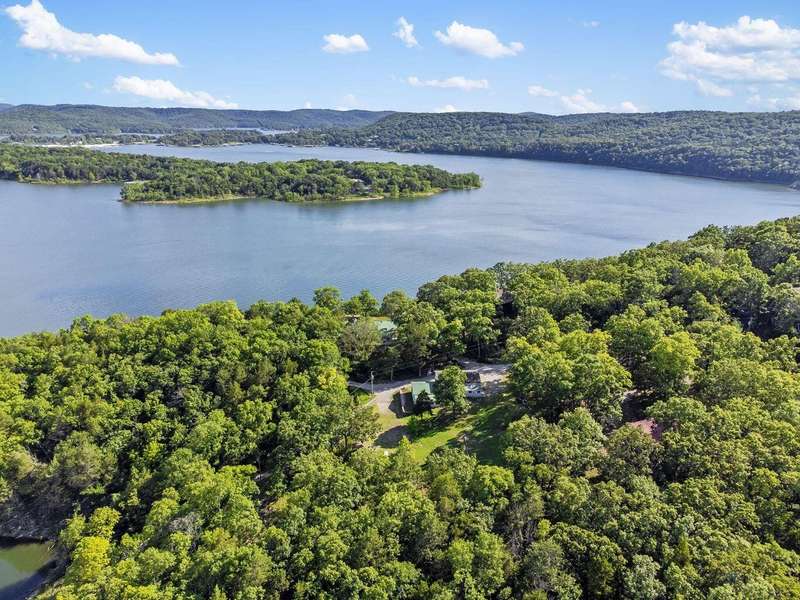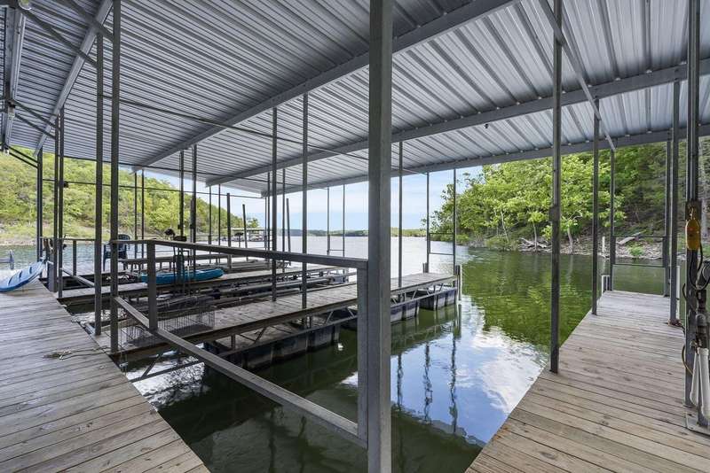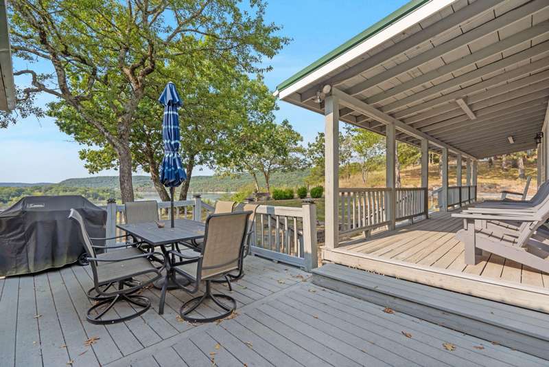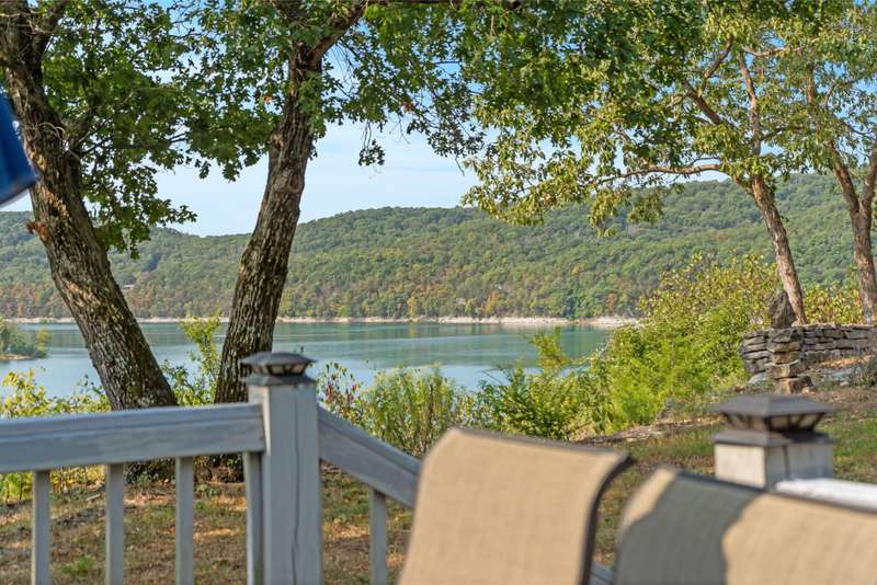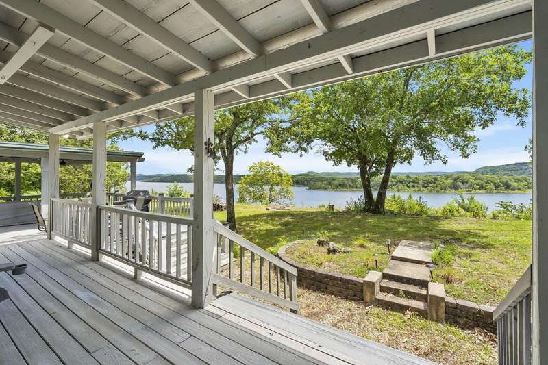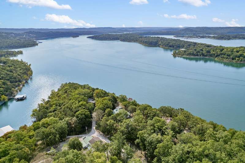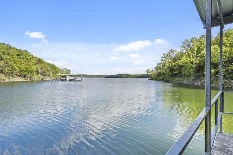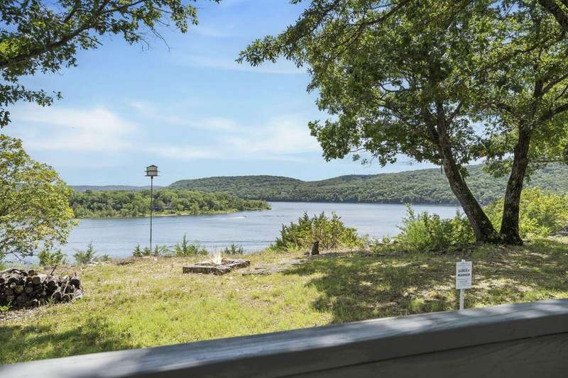 Panoramic Sunrise, Sunset, Lake & Mountain Views on Table Rock Lake! Welcome to your private lakefront retreat! Nestled on one acre of pristine Table Rock Lake frontage, this extraordinary property offers both walk-to-the-water access on one side and bluff-front vistas on the otherproviding breathtaking views from every angle. Designed for entertaining and relaxation, the home features a partially covered, wrap-around deck, a bluff-front firepit, and scenic rock ledges perfect for enjoying unforgettable sunsets. Inside, the open-concept living area flows seamlessly into the dining and kitchen spaces, centered around a cozy stone gas fireplace and an enclosed sunroom for year-round outdoor enjoyment. The kitchen features beautiful Corian countertops, a stylish slate backsplash, new stainless steel appliances, and a pantry. The main-level primary suite offers stunning lake views, and an ensuite bath. The fully remodeled lower level (2021) includes an expansive family room with a second stone gas fireplace, two guest bedrooms, two full guest baths, and a laundry/mudroom. Recent updates also include a new water heater, whole home water filtration system, water softener, upgraded attic insulation, gutters and gutter covers, and fresh paint. Other features include a HVAC system with EcoNet Smart Home controls, vinyl siding, and a low-maintenance metal roof. Step outside to discover a stone walkway and bridge leading to a detached shop/garage with two garage stalls, additional carports, John Deere room, bunk room, half bath, and reloading room, a rare and unique amenity! Enjoy easy access to the lake via a private easement path leading to the dock, where two 10x24 boat slips are available for additional purchase ($$), one with a new lift. Boat slips are privately owned and must be purchased with the home. Furniture package available for additional $$. Private and peacefulonly four homes in the subdivision!