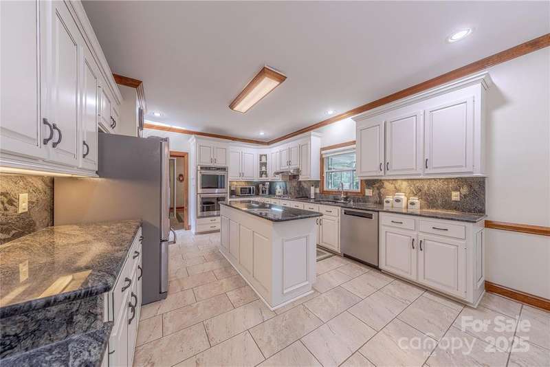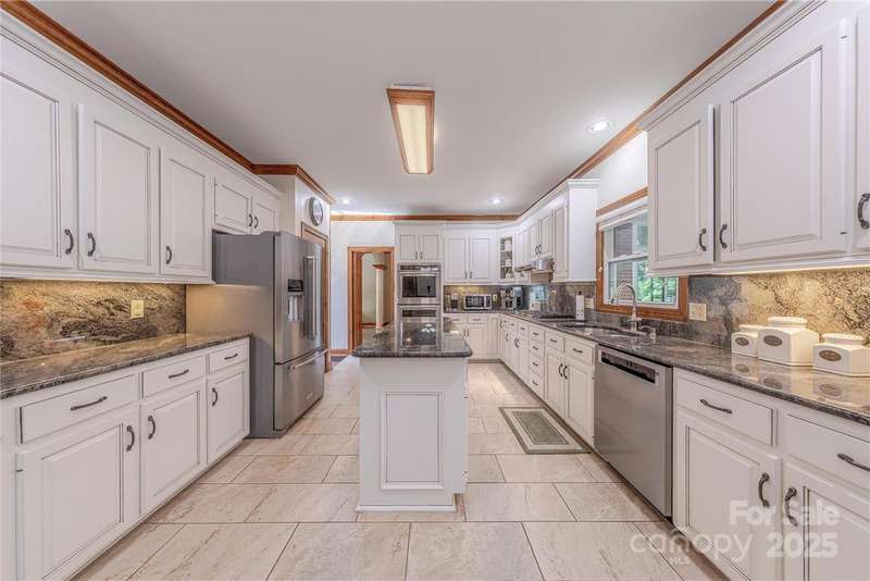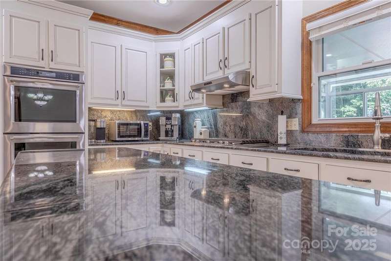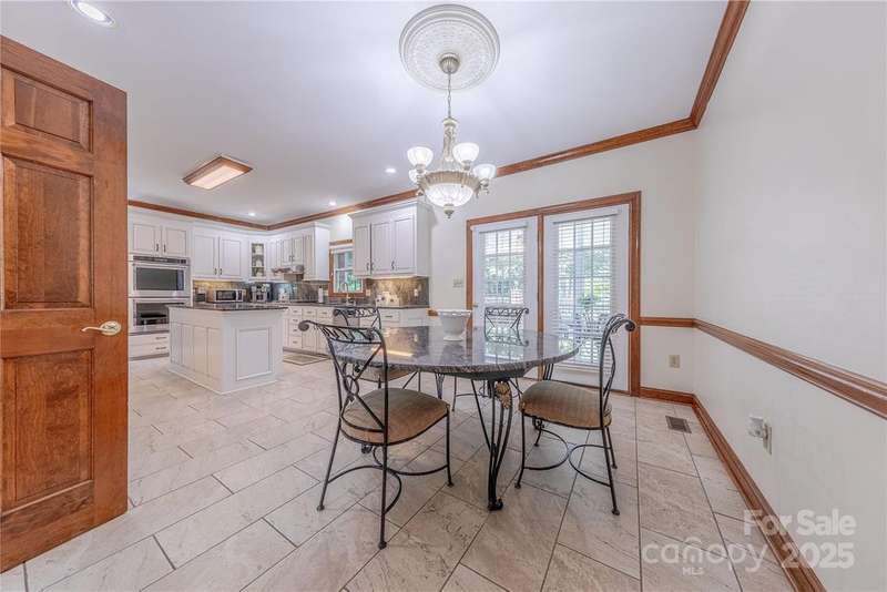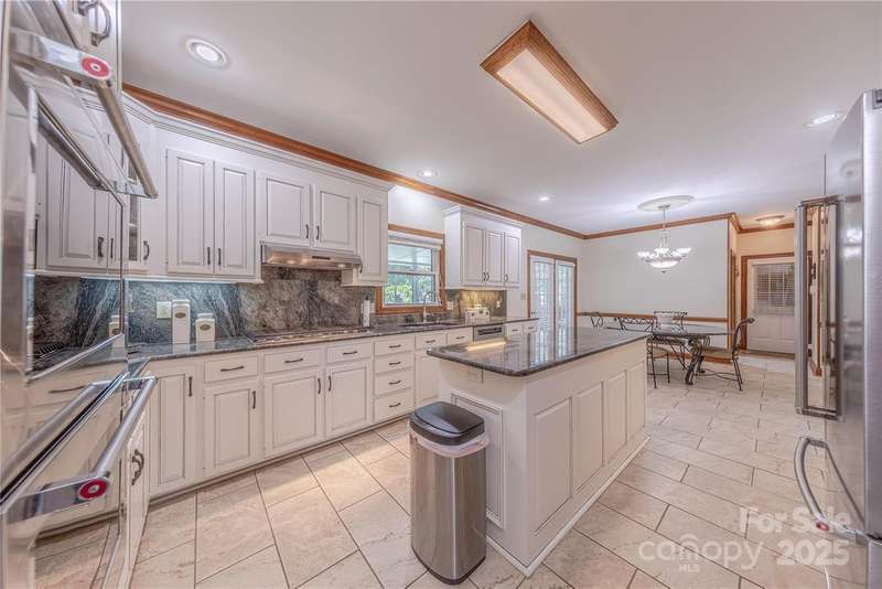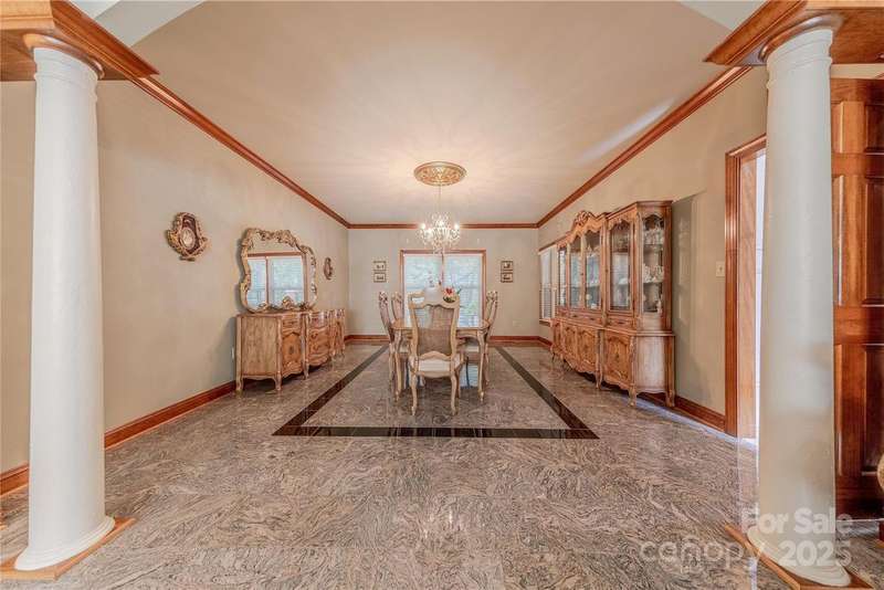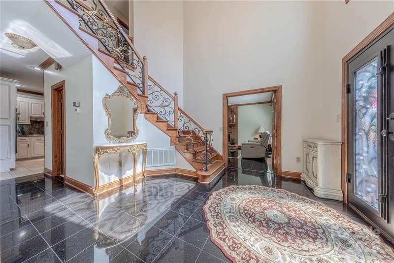 Stately 2-story entry w/palladium window overlooking stunning curved staircase w/HW treads, wrought iron spindles, Aladdin Retractable Chandelier. 1st floor w/gorgeous granite/marble/tile floors & crown molding. Double French doors into lovely formal living room, extends into spacious formal DR(crystal chandeliers in LR/DR remain). French doors from entry into family room, gas log FPL, ceiling fan (FPL sold as is condition--sellers never used). Extra large kitchen w/granite counters/backsplash, DB ovens, 5-burner gas cooktop, SS range hood, wine rack over desk area & ceramic tile flrs. Tons of cabinets/sink in Tiled laundry room. Wall cabs in garage DO NOT REMAIN. Enormous tiled sunroom, sliders to expanded brick paver patio & private backyard. Oversized primary BR w/dressing area, jetted tub, huge shower, bidet. Updated hall bath, lovely tiled walls/floor, skylight. Rec room, WIC attic storage, rear stairs down to mudroom. Pool table & Kitchen granite table & chairs are negotiable.
