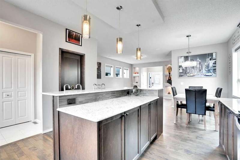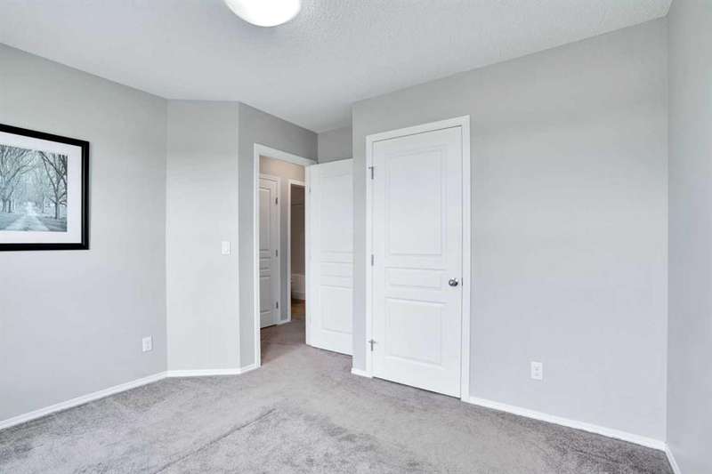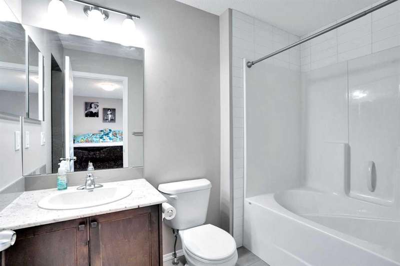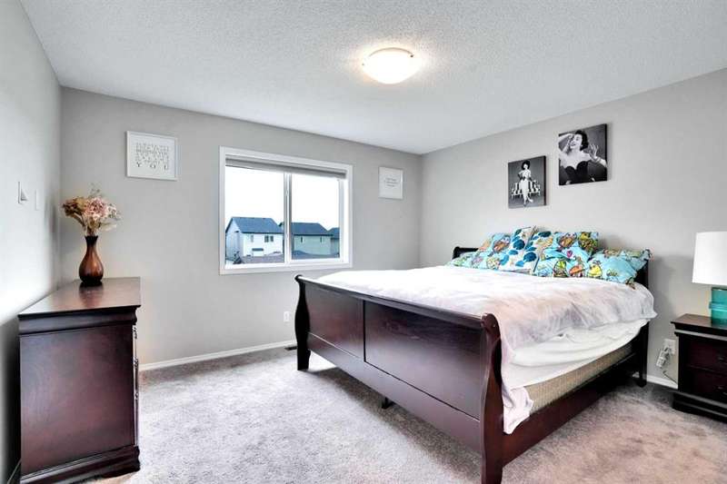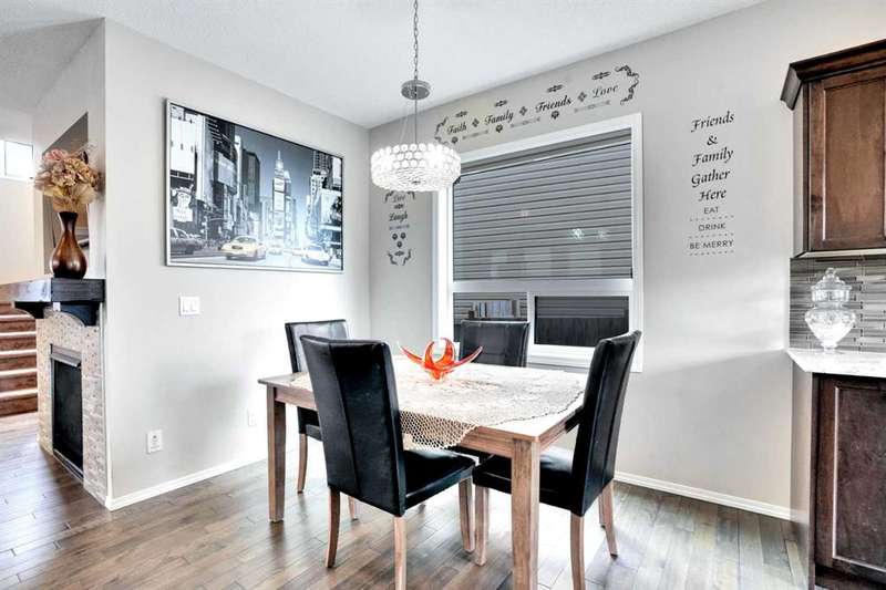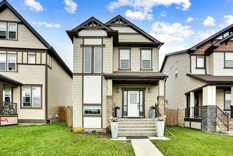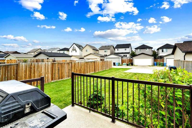 Welcome to this beautiful one owner, move-in ready single family home in the established community of Skyview Ranch. Walk in to a lovely open floor plan, bright with natural light from large windows and from stylish modern lighting on the nine-foot ceilings. Rich hardwood floors accentuate the main-floor living area, with durable and beautiful tile at both front and back entrances. The spacious kitchen includes tons of work and storage space, with a large island, breakfast bar, and ample cabinets, finished with lovely granite countertops and upscale stainless steel appliances. The large walk in pantry and built-in wine rack complete this handsome and practical kitchen. Living room features a gas-burning fireplace , topped by a solid wood mantle with wall mounted television and built-in ceiling speakers. Built-in lighted shelves in the living room highlight your treasures. To complete the main floor, a two-piece bath is located off the living room. Upstairs, the spacious master bedroom looks out over the backyard. It comprises ample space for a king-sized bed, and boasts a lovely ensuite with over-sized soaker tub and walk in closet. There are second and third bedrooms upstairs for the kids or home office. The upstairs also features a four piece main bath and convenient laundry facilities. The home has dual front-door closets and a huge back closet for storage of all your outdoor essentials. An added bonus is central air conditioning. The basement includes rough in for a future bathroom and has unlimited potential for whatever type of additional space your family needs. This home features a large open back yard with poured garage pad saving you the cost while building your own double garage, gas barbecue hook-up on the deck, and side fencing. This home is located in family-friendly Skyview Ranch, near parks, schools, walking paths, transit and amenities, and with easy access to Stoney and Deerfoot Trail.