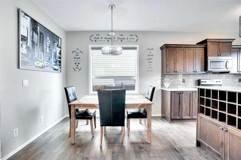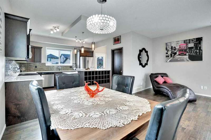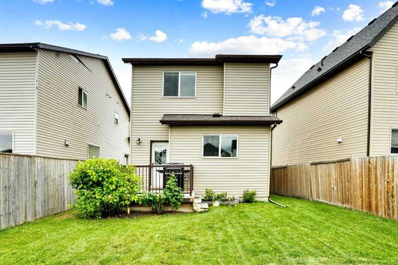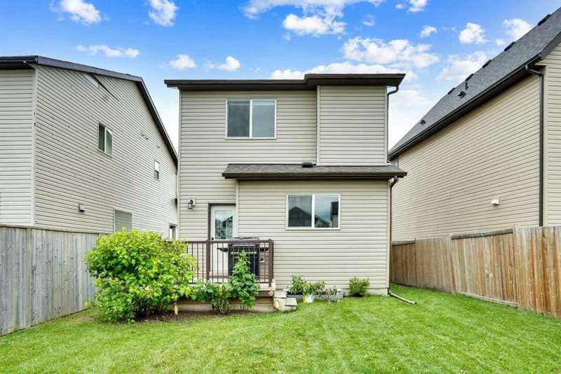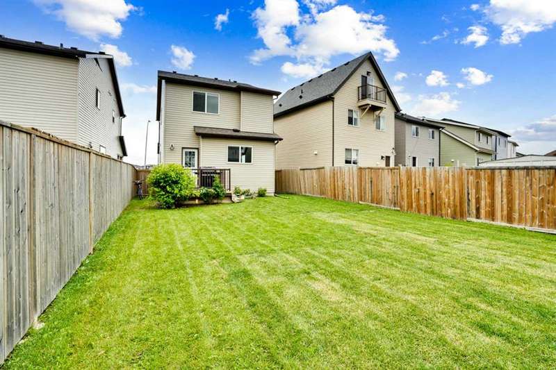 Welcome to this beautiful one owner, move-in ready single family home in the established community of Skyview Ranch. Walk in to a lovely open floor plan, bright with natural light from large windows and from stylish modern lighting on the nine-foot ceilings. Rich hardwood floors accentuate the main-floor living area, with durable and beautiful tile at both front and back entrances. The spacious kitchen includes tons of work and storage space, with a large island, breakfast bar, and ample cabinets, finished with lovely granite countertops and upscale stainless steel appliances. The large walk in pantry and built-in wine rack complete this handsome and practical kitchen. Living room features a gas-burning fireplace , topped by a solid wood mantle with wall mounted television and built-in ceiling speakers. Built-in lighted shelves in the living room highlight your treasures. To complete the main floor, a two-piece bath is located off the living room. Upstairs, the spacious master bedroom looks out over the backyard. It comprises ample space for a king-sized bed, and boasts a lovely ensuite with over-sized soaker tub and walk in closet. There are second and third bedrooms upstairs for the kids or home office. The upstairs also features a four piece main bath and convenient laundry facilities. The home has dual front-door closets and a huge back closet for storage of all your outdoor essentials. An added bonus is central air conditioning. The basement includes rough in for a future bathroom and has unlimited potential for whatever type of additional space your family needs. This home features a large open back yard with poured garage pad saving you the cost while building your own double garage, gas barbecue hook-up on the deck, and side fencing. This home is located in family-friendly Skyview Ranch, near parks, schools, walking paths, transit and amenities, and with easy access to Stoney and Deerfoot Trail.