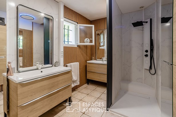From the entrance, the living area impresses with its open volumes and high ceilings, enhanced by an impressive exposed framework and a decorative fireplace that highlight the villa's fluid layout and warm character. The lounge includes an integrated home cinema, while the fully equipped kitchen blends harmoniously into the living space, creating a convivial atmosphere for hosting guests. The property offers five bedrooms, including two master suites, plus a third shower room. Refined finishes and quality materials lend the whole property an elegant and cosy atmosphere.