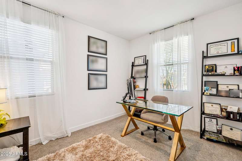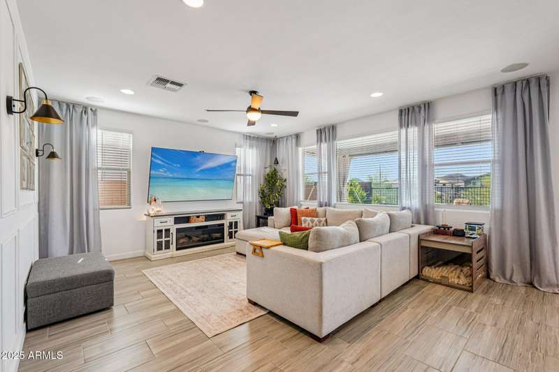 Welcome to this beautifully decorated two-story home offering 3,268 sq ft of style and functionality. The main level features an open layout with a spacious great room, huge kitchen island with quartz countertops, walk-in pantry, breakfast seating, and a cozy kitchenette area that flows seamlessly for entertaining. A formal dining room and a guest bedroom/office with adjacent bath complete the first floor.