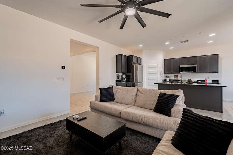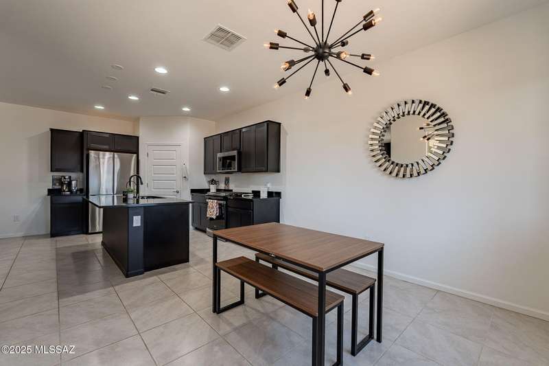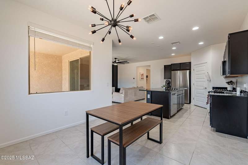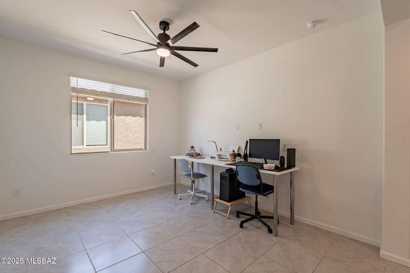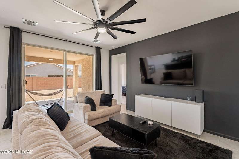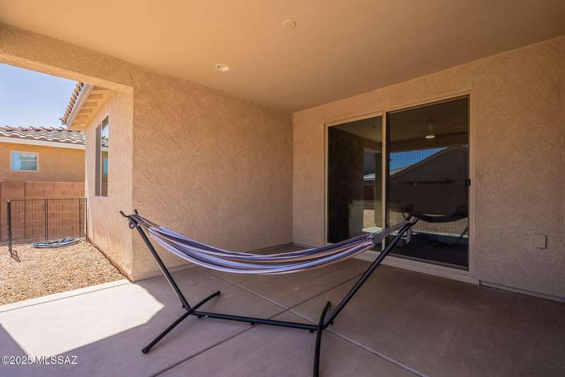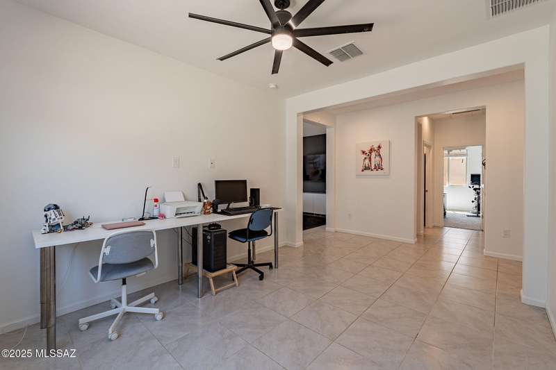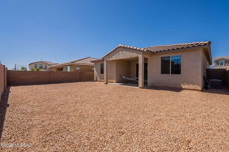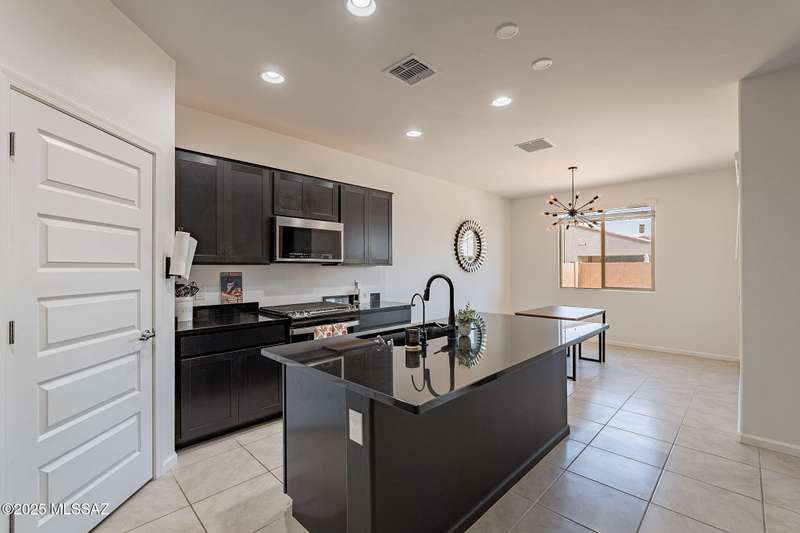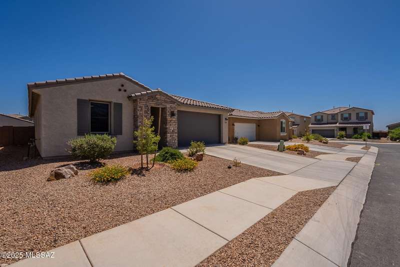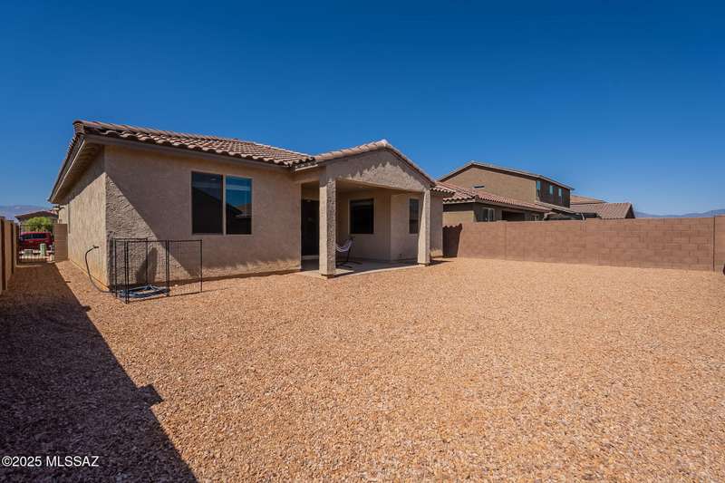 Built in 2022 by Mattamy Homes, this Acacia plan in Saguaro Trails blends modern design with easy desert living. The 1,653 sq ft single-story layout includes 2 bedrooms, 2 baths, a private den, and a flex room ideal for an office or gym. The open kitchen features black granite countertops, stainless steel appliances, and a large island with seating. Refrigerator, washer, and dryer convey. Energy-efficient construction and a smart thermostat enhance comfort year-round. Low-maintenance desert landscaping and access to community parks, pool, and walking paths within the Vail School District.