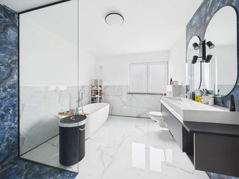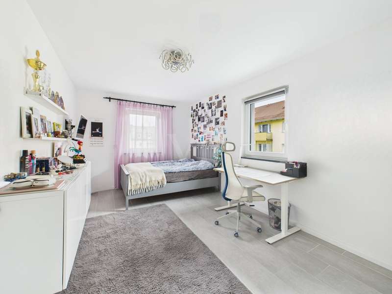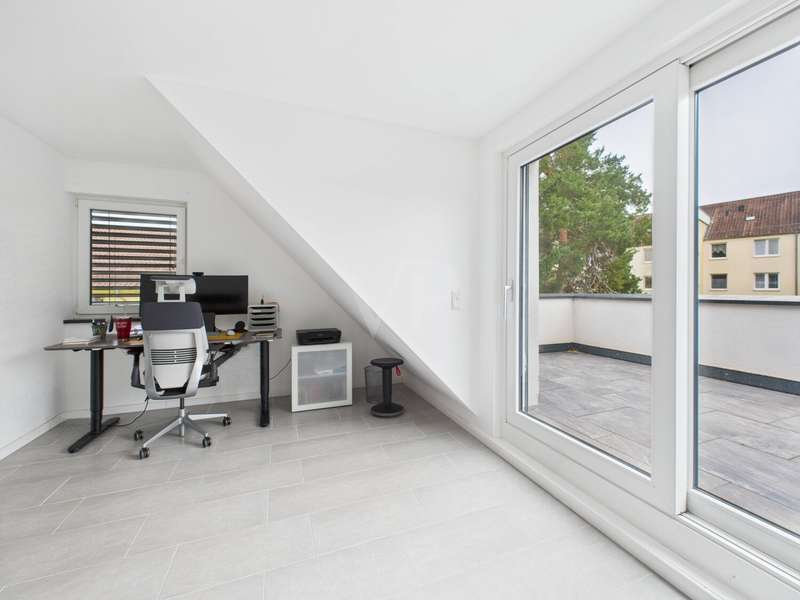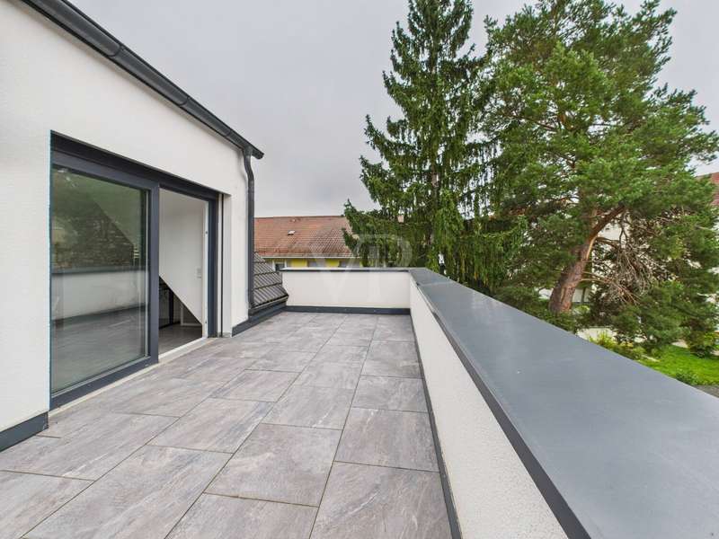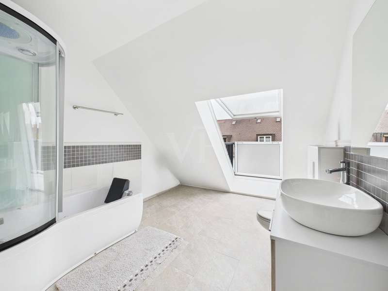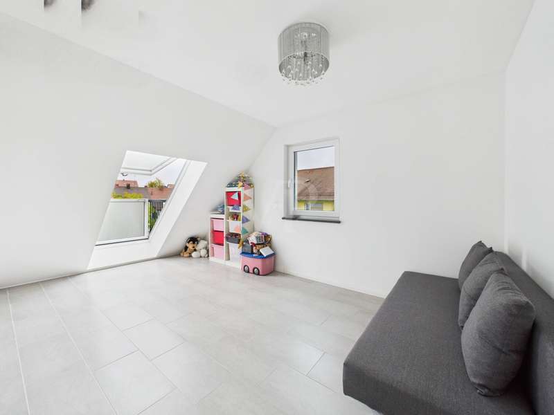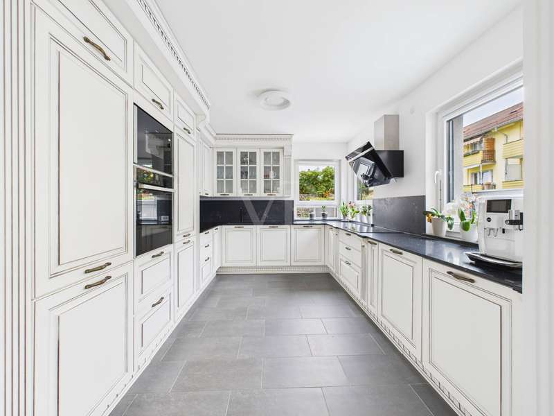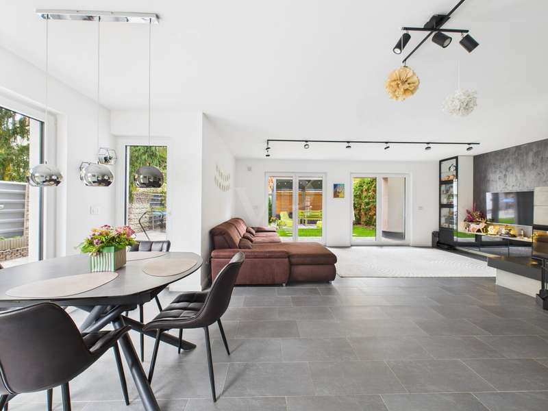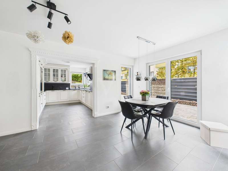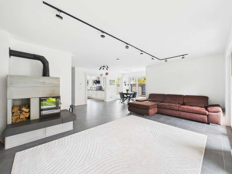 This high-quality detached house from 2019 combines elegant design, state-of-the-art technology and high-quality furnishings on around 182 m² of living space. The house impresses with its clear architecture, a well thought-out room concept and a homely atmosphere that perfectly combines style and comfort. The heart of the house is the spacious, light-flooded living and dining area with fireplace and access to the sunny terrace and garden. Floor-to-ceiling windows bathe the room in warm daylight and create an open, inviting living atmosphere. The fireplace lends the living area additional cozy warmth and makes it the ideal place to relax. The custom-made fitted kitchen in an elegant country house style impresses with high-quality fronts, a dark natural stone worktop and modern brand-name appliances from 2022. It combines classic design with state-of-the-art functionality - ideal for connoisseurs and families. A stylish guest WC completes this level. Energy-efficient underfloor heating ensures a pleasant living experience throughout the house, providing even heat and a high level of comfort. This is complemented by a comprehensive smart home system that can be used to conveniently control lighting, shutters, heating and security technology (including a camera system) centrally or via an app - for maximum living comfort and security at the most modern level. There are 3 bright bedrooms on the upper floor, which can be used in a variety of ways - as children's rooms, guest rooms or dressing rooms. The highlight of this floor is the luxurious bathroom with elegant, large-format marble-look tiles, a free-standing designer bathtub, a floor-to-ceiling rain shower and a custom-made double washbasin with large mirrors and modern lighting. This is where timeless elegance meets wellness - a place to relax and feel good. The top floor offers 2 further, spacious rooms that are ideal as a parental suite, guest room or home office. A modern shower room provides additional comfort here. Particularly charming are the two Velux convertible windows - one in the bathroom and one in one of the bedrooms - which can be opened up into small roof balconies and provide an extraordinary amount of light and an open feeling of space. The adjoining roof terrace also offers a beautiful view and is perfect for spending relaxing hours outdoors - whether reading, sunbathing or enjoying your first coffee in the morning. Several basement rooms await you in the basement, which offer plenty of storage space and can also be used as a hobby room, fitness area or workshop thanks to the solid construction. A separate laundry room ensures tidiness and functionality. A high-quality AQMOS water softening system is also installed in the boiler room, which reliably ensures soft, low-limescale water and protects the entire building services at the same time - another detail that underlines the well thought-out features of this home. The garden features a well-tended lawn and a spacious terrace, which invites you to enjoy cozy barbecues and relaxing hours outdoors. The sheltered location creates privacy and offers space for individual design ideas. The house has a solar system installed on the roof, which provides sustainable energy. An outdoor parking space with wallbox right next to the house completes this attractive offer. There are also additional parking spaces on the property.
