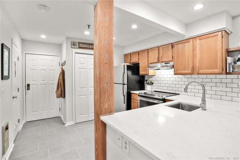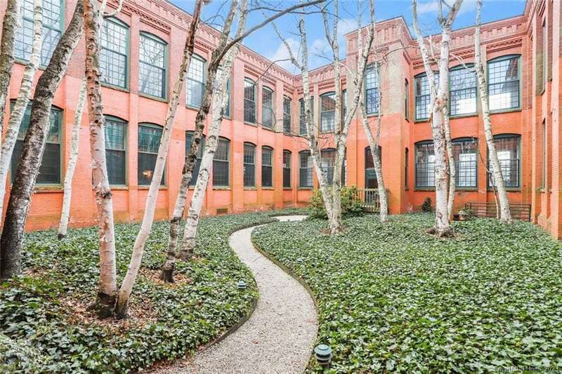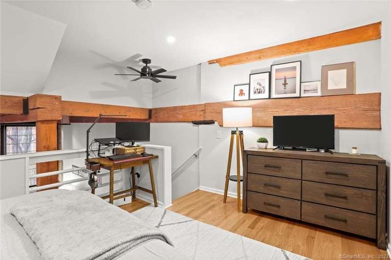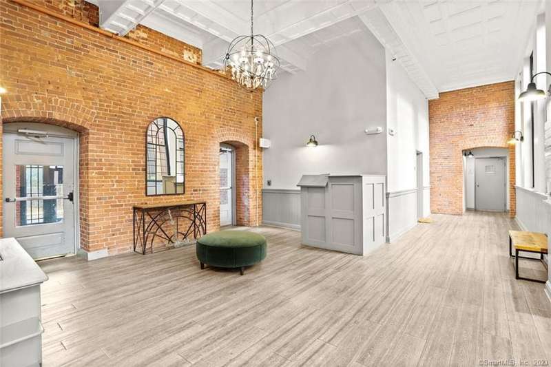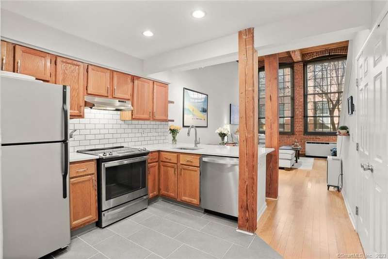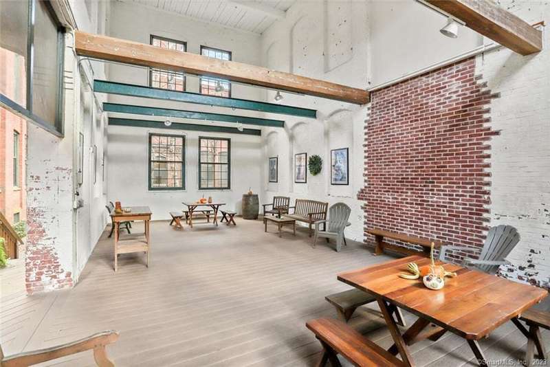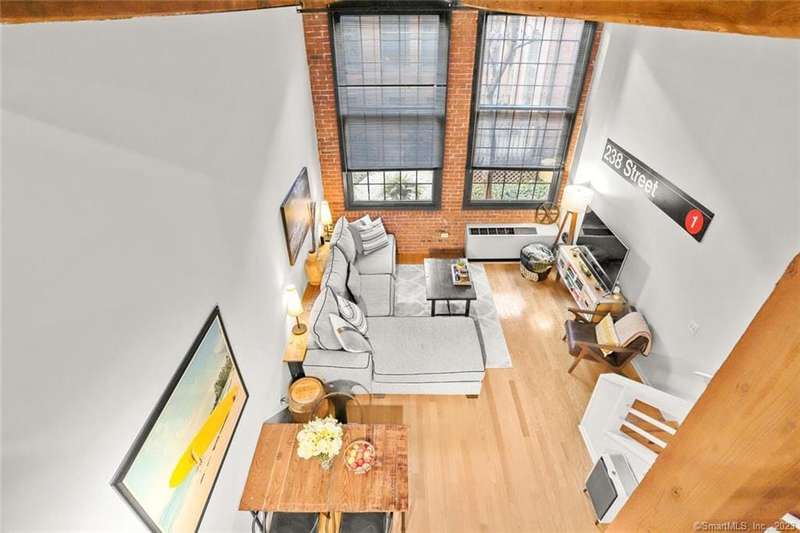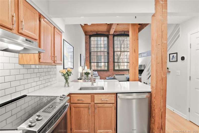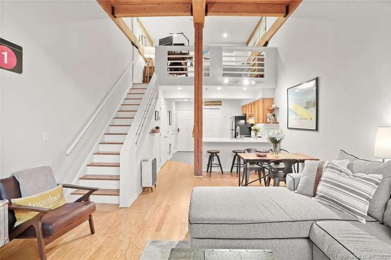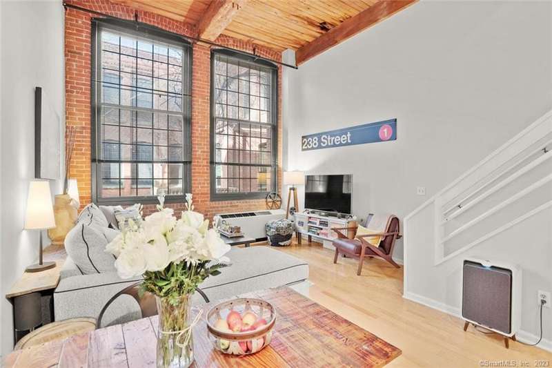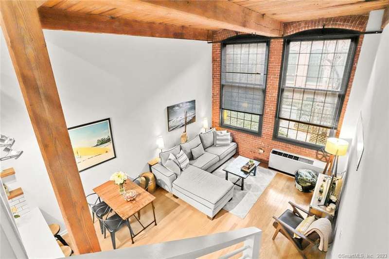 Beautiful NYC-style loft condo in the sought-after, renovated hat factory known as Clocktower Close. This stunning loft features 14' ceilings, two-story windows, exposed original wood beams, and a stunning brick wall that adds warmth and charm. The open kitchen/dining area has been renovated with quartz countertops, a subway tile backsplash, large gray tile floor, a stove/air fryer, and a dishwasher. The new chic, modern half-bath just off the kitchen provides style and convenience on the main level. The upstairs primary bedroom suite is spacious and private and has plenty of closet space and newly installed recessed lighting. Many amenities, including a fitness center with sauna and locker rooms, conference room, community game room/lounge and community kitchen, laundry room and landscaped courtyard. Located just 7-minutes from bustling downtown South Norwalk, restaurants, shops, Norwalk beaches, train, I-95 and the Merritt Parkway. EXCELLENT CREDIT IS A MUST!
