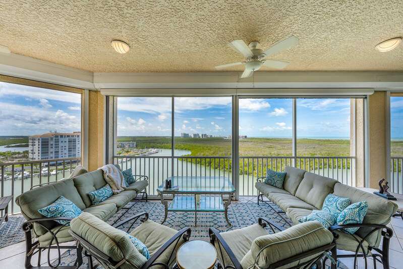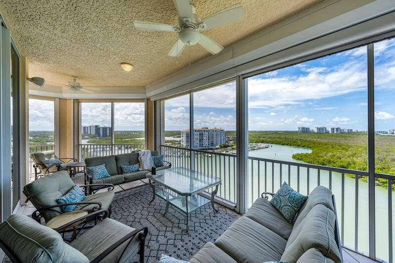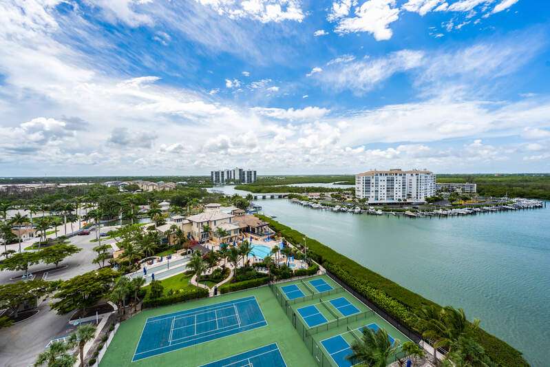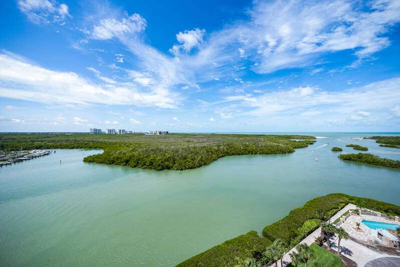 Spectacular unobstructed views of the Gulf, Bay and beyond are waiting to surprise you from this 11th floor Penthouse corner unit with large windows and 10-foot glass slider doors. From sunrise to sunset over Naples, you'll never tire of the everchanging views. This spacious 3 Bedroom, 3 Bath (or 2 Bedroom plus Den) sky-home has 11-foot-high ceilings. There are two over-sized Terraces; one located off the Great Room, with a southwest exposure and the second is located off the Kitchen and Breakfast Room and has a sun lit northeast exposure The Primary Suite has a spectacular picture window with a Gulf view, two walk-in closets and a spacious en-suite with dual sinks, a soaking tub and a separate shower. The second bedroom is also en-suite, and the third bedroom/den has a full bath directly across the hall. A new boat dock may be negotiated separately. Additionally, docks are available for purchase through the Pelican Isle Yacht Club. Pelican Isle has direct Gulf access with no bridges to hinder sail boats. Don't miss touring the Pelican Isle Yacht Club, which offers Tennis, Pickleball, Bocce, group Yachting Events, a workout facility, and dining. Membership is optional. Situated just south of the intersection of Delnor Wiggins Road and Vanderbilt Drive, the location is private yet close to Naples' fantastic shopping, restaurants and the Gulf beaches.