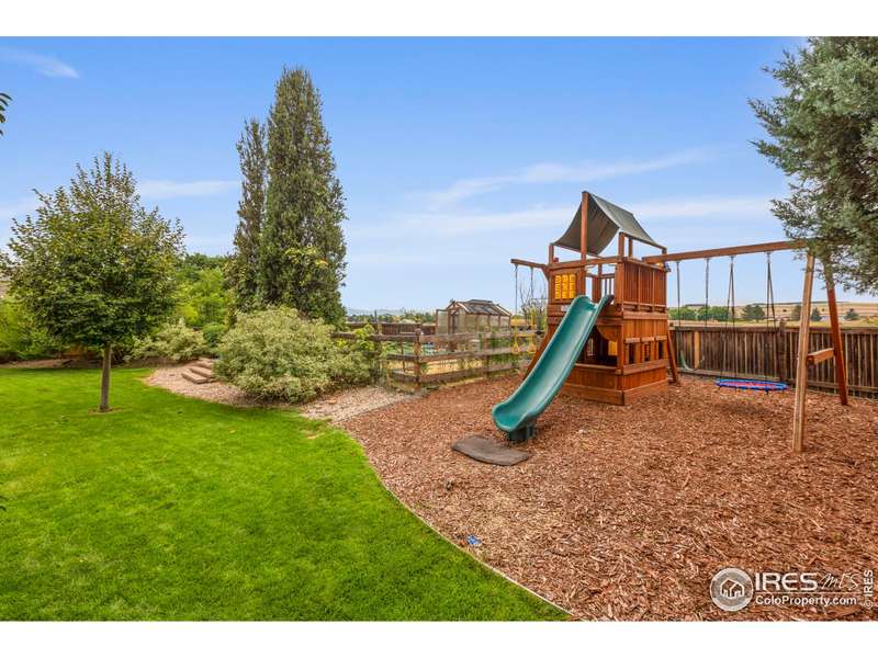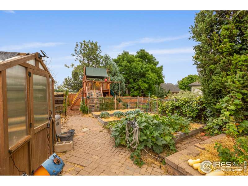 Nestled in a quiet Southeast Fort Collins cul-de-sac, this 5-bed, 4-bath home is a gardener's paradise backing to open space with stunning mountain views. Enjoy a greenhouse, irrigated garden beds, and mature fruit trees (plums, apples, grapes). The primary suite boasts his-and-her walk-in closets, a 5-piece bath, vaulted ceilings, and mountain views. Four spacious upstairs bedrooms, a main-floor office, and a finished basement with a kitchenette, bedroom, bath, and hobby area offer room for all. Features include all new 2025 carpet, 2024 furnace, A/C, water heater, luxury vinyl plank flooring, a well-appointed kitchen with glass cooktop, new dishwasher, and double ovens. A newer playground, large patio, and 3-car garage with workshop area add appeal. Steps from top-rated Poudre School District schools and shopping, this home blends tranquility with convenience, perfect for creating lasting memories.