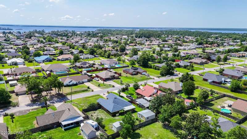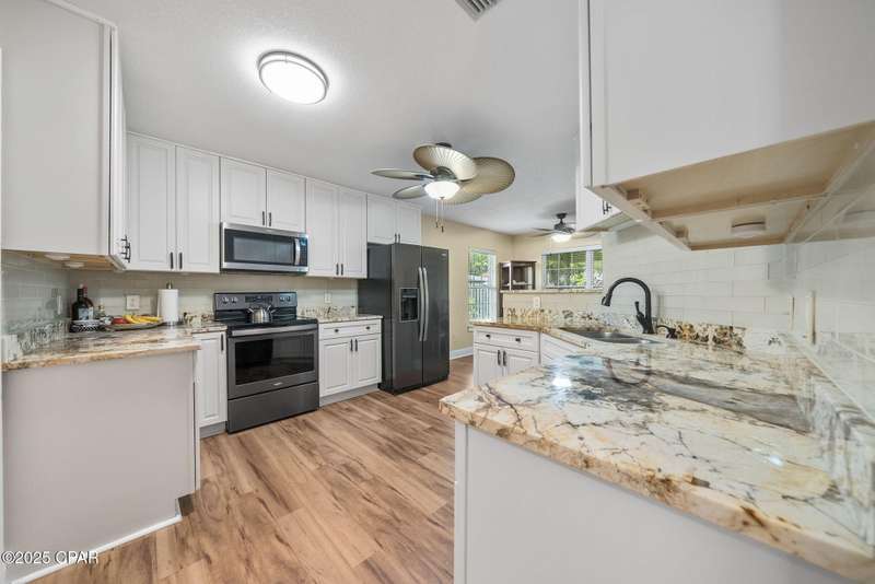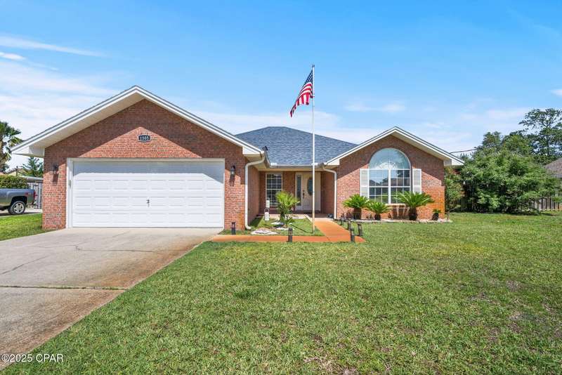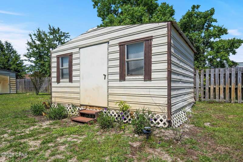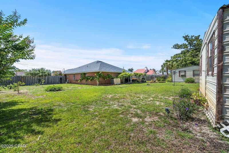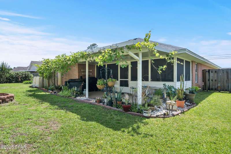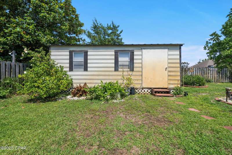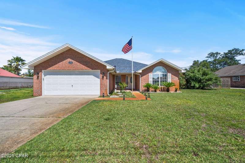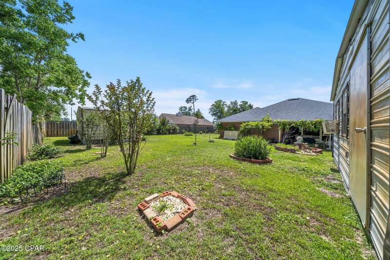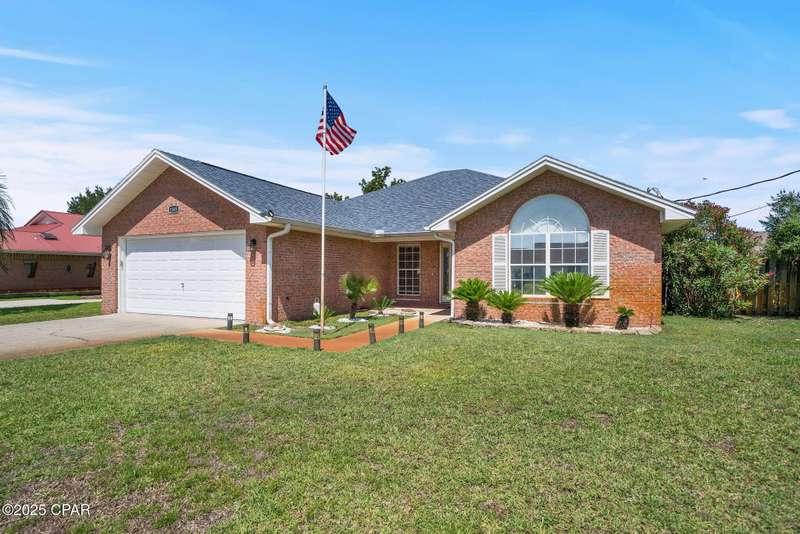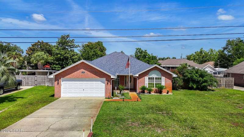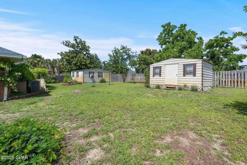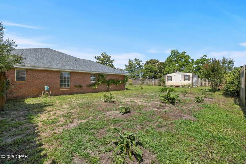 Centrally located in the heart of Lynn Haven, this 3-bedroom, 2-bathroom brick home features an open floor plan with 10' ceilings, luxury vinyl plank flooring throughout, crown molding, recessed lighting, and a desirable split-bedroom layout.The newly remodeled eat-in kitchen offers granite countertops, a pantry, breakfast bar, and sleek black stainless steel appliances. A separate dining area provides the perfect space for gatherings. The spacious master suite includes a walk-in closet and an en-suite bath with double vanities and cultured marble countertops.Step outside to a beautiful, large fenced-in backyard oasis, complete with lush landscaping, a screened-in back porch, an additional covered patio area, a sprinkler system with shallow well, and two storage sheds -- including a 20x28 insulated shed with window A/C and a 10x16 utility shed.This well-maintained home blends comfort, space, and functionality -- a must-see!