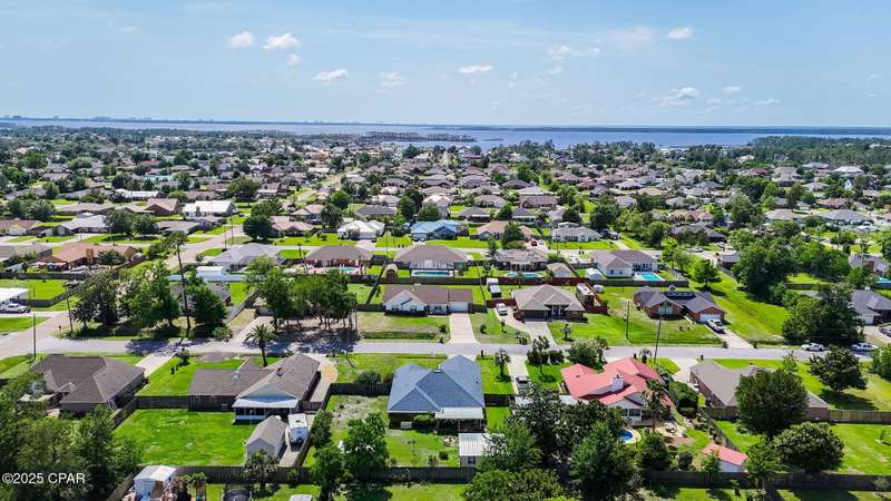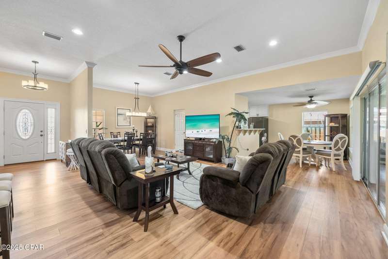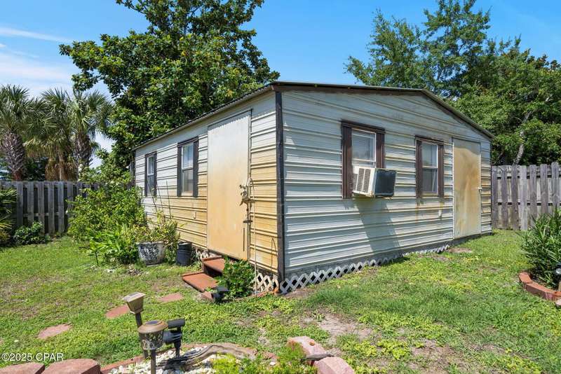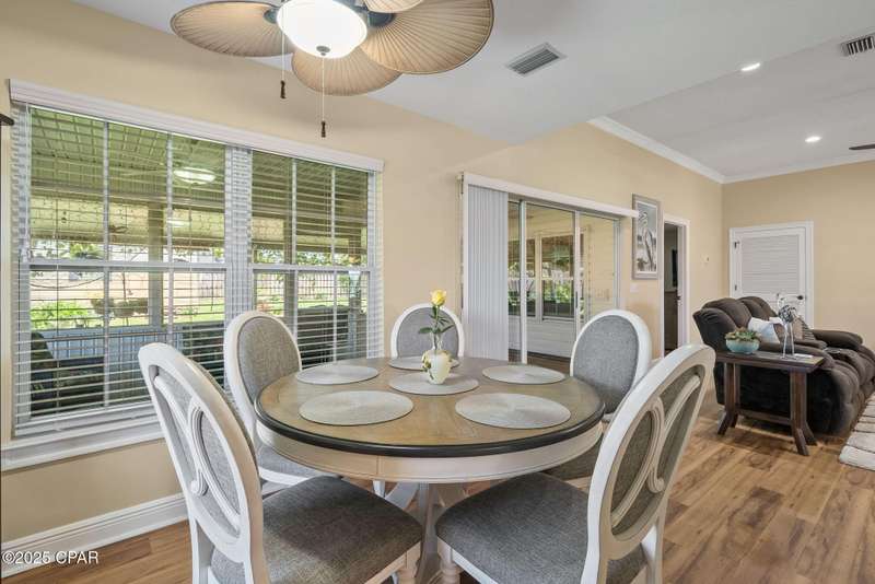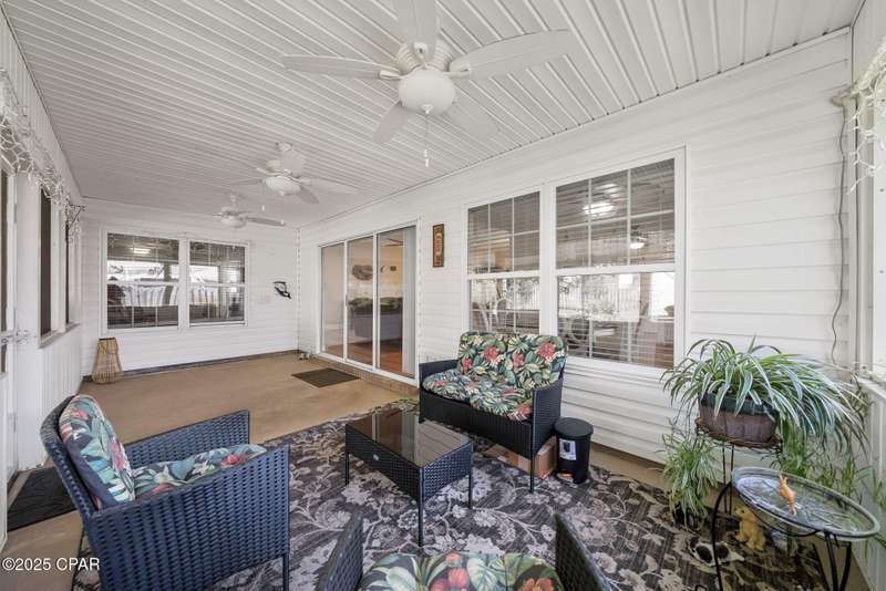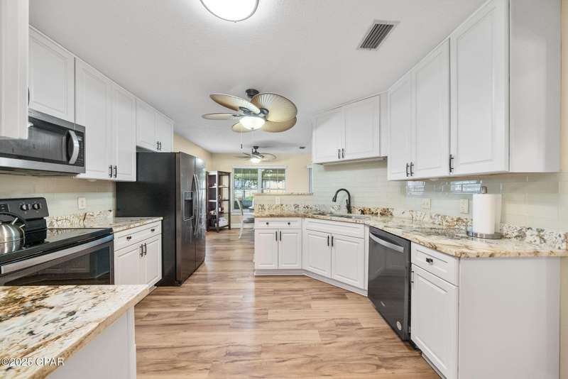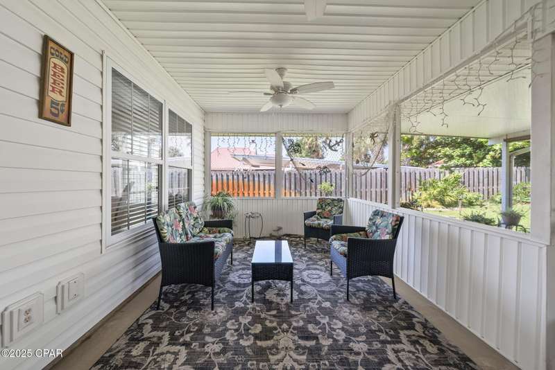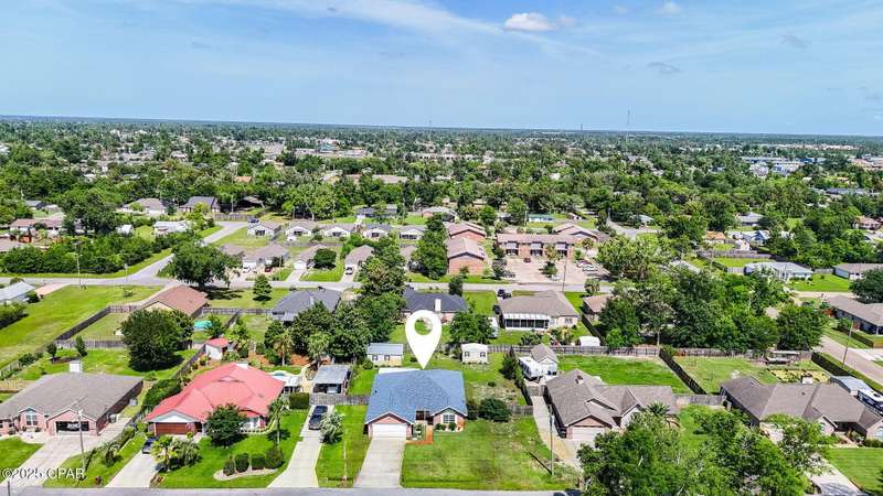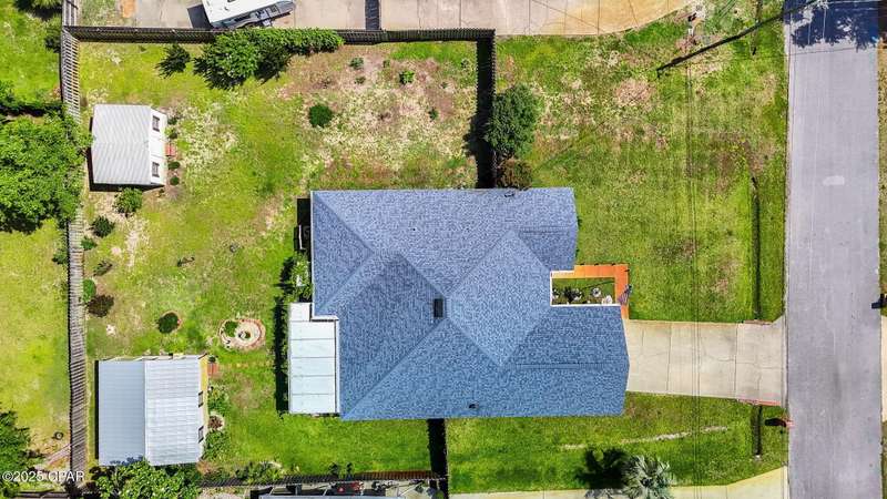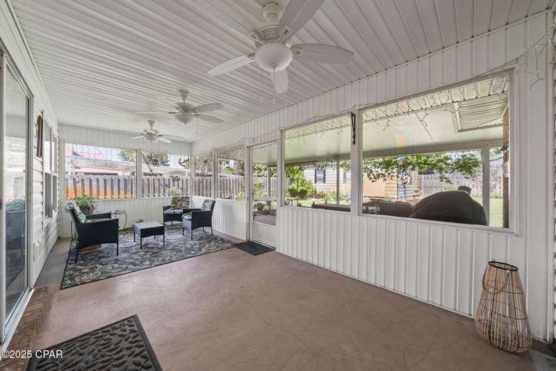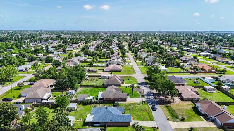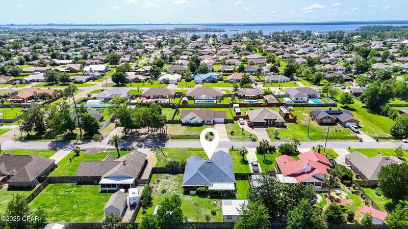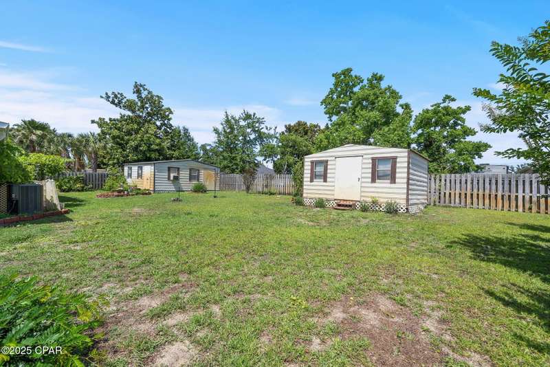 Centrally located in the heart of Lynn Haven, this 3-bedroom, 2-bathroom brick home features an open floor plan with 10' ceilings, luxury vinyl plank flooring throughout, crown molding, recessed lighting, and a desirable split-bedroom layout.The newly remodeled eat-in kitchen offers granite countertops, a pantry, breakfast bar, and sleek black stainless steel appliances. A separate dining area provides the perfect space for gatherings. The spacious master suite includes a walk-in closet and an en-suite bath with double vanities and cultured marble countertops.Step outside to a beautiful, large fenced-in backyard oasis, complete with lush landscaping, a screened-in back porch, an additional covered patio area, a sprinkler system with shallow well, and two storage sheds -- including a 20x28 insulated shed with window A/C and a 10x16 utility shed.This well-maintained home blends comfort, space, and functionality -- a must-see!