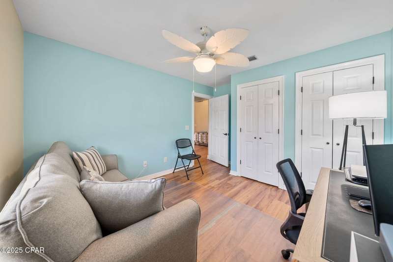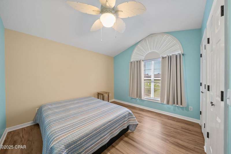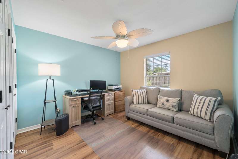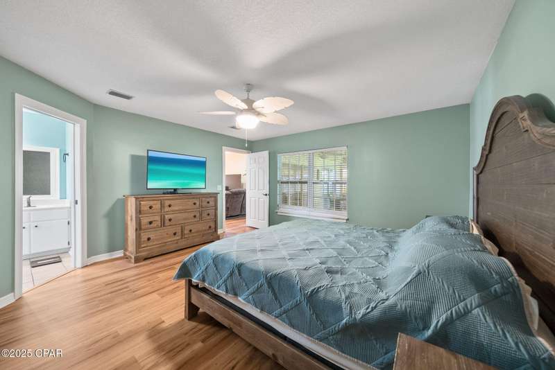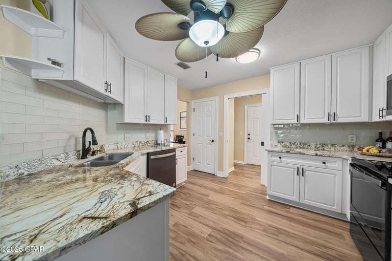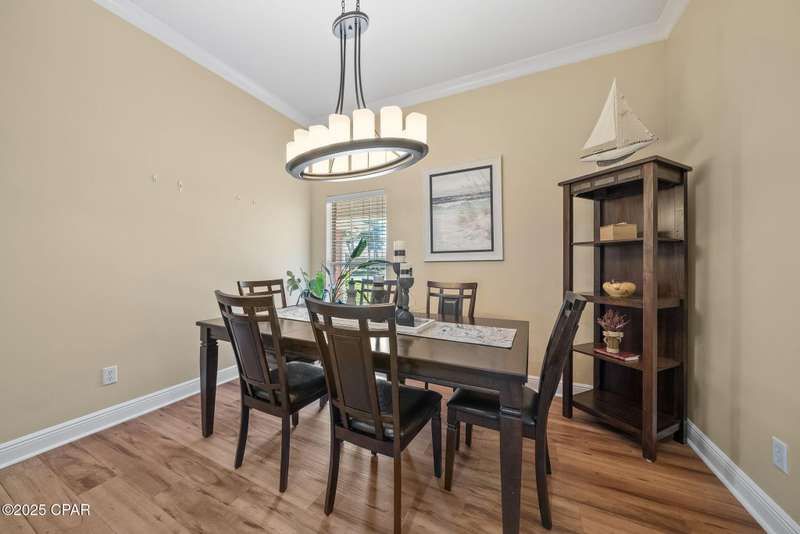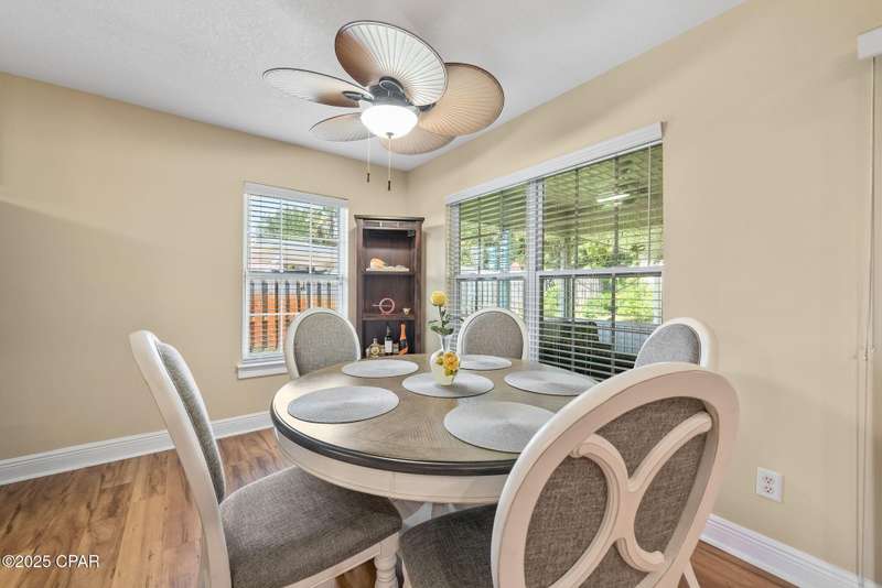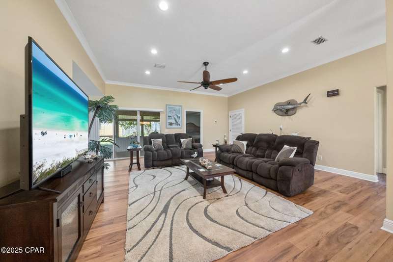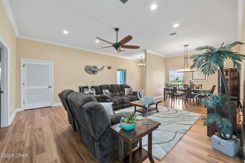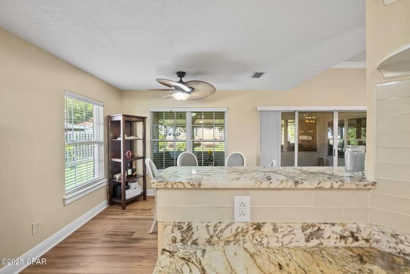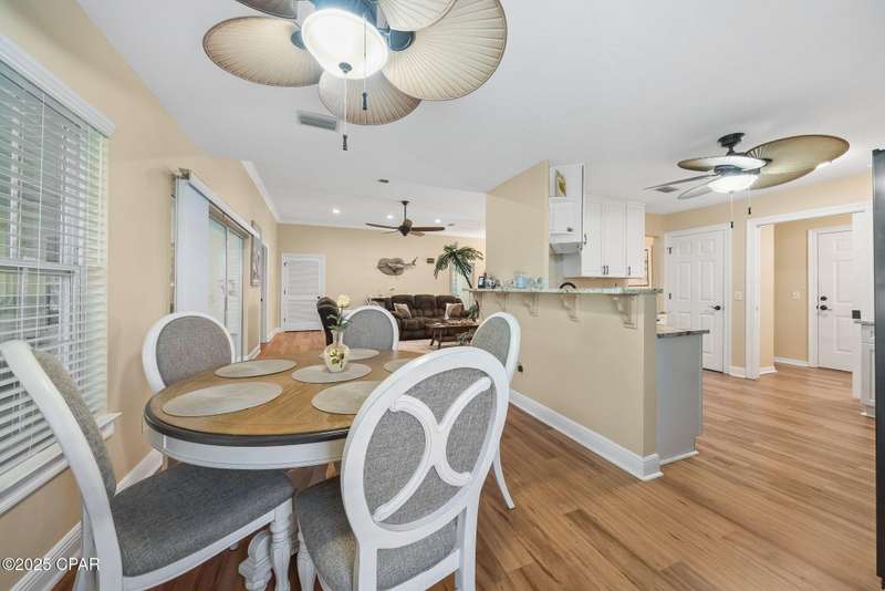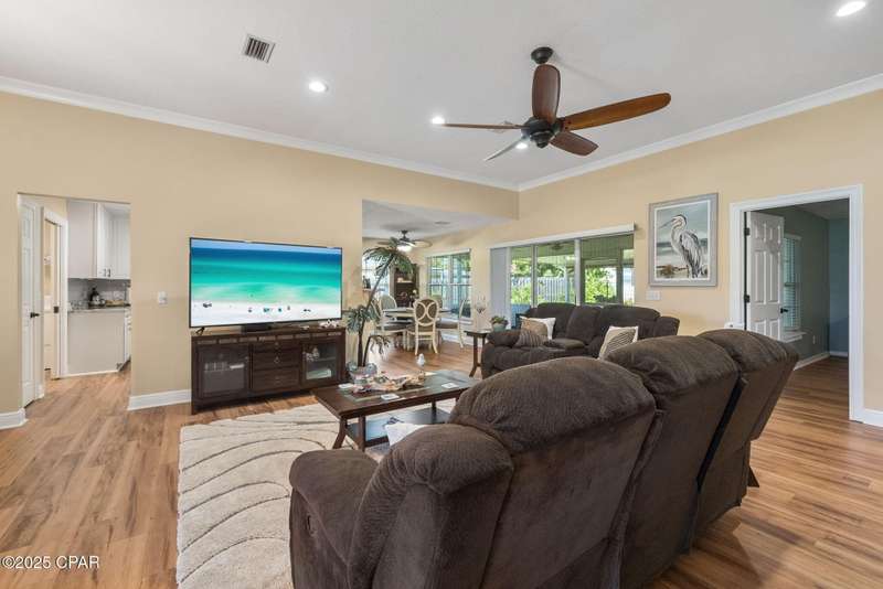 Centrally located in the heart of Lynn Haven, this 3-bedroom, 2-bathroom brick home features an open floor plan with 10' ceilings, luxury vinyl plank flooring throughout, crown molding, recessed lighting, and a desirable split-bedroom layout.The newly remodeled eat-in kitchen offers granite countertops, a pantry, breakfast bar, and sleek black stainless steel appliances. A separate dining area provides the perfect space for gatherings. The spacious master suite includes a walk-in closet and an en-suite bath with double vanities and cultured marble countertops.Step outside to a beautiful, large fenced-in backyard oasis, complete with lush landscaping, a screened-in back porch, an additional covered patio area, a sprinkler system with shallow well, and two storage sheds -- including a 20x28 insulated shed with window A/C and a 10x16 utility shed.This well-maintained home blends comfort, space, and functionality -- a must-see!