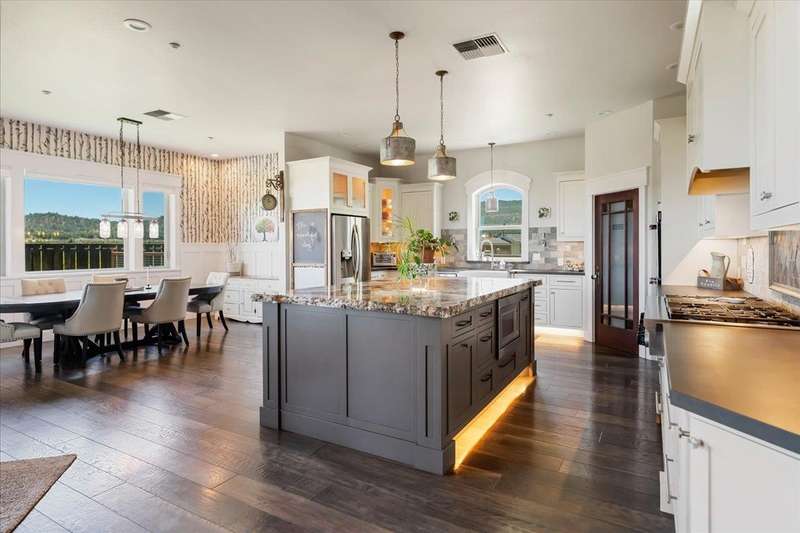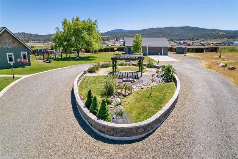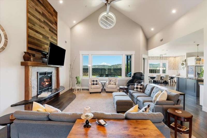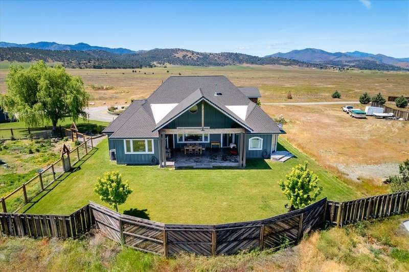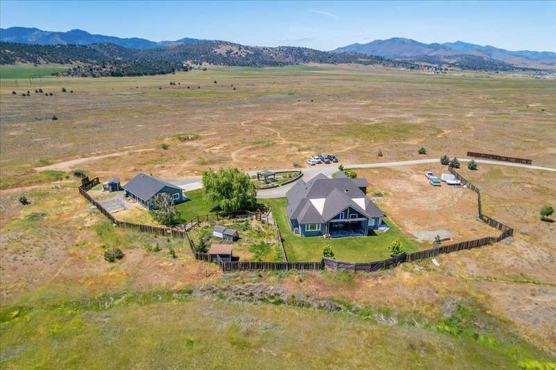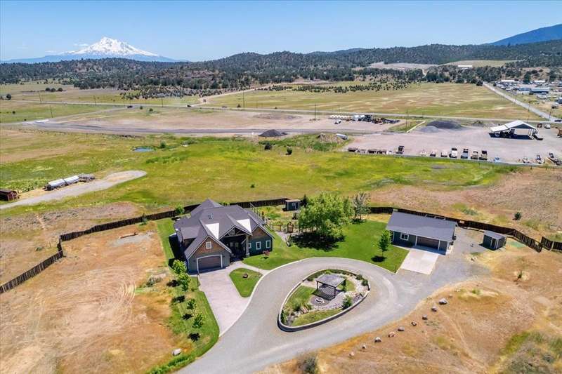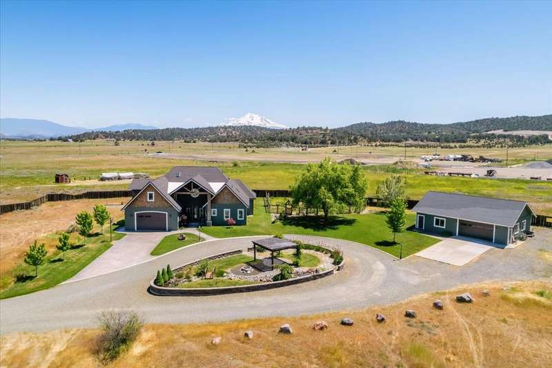 EXQUSITELY CONSTRUCTED HOME COMES WITH 160 ACRES; INCREDIBLE MT. SHASTA VIEWS INCLUDING GOOSENEST, WILLOW CREEK, WHALEBACK, THE EDDIES AND BLACK BUTTE! ENTER THIS MAGNIFICENT HOME THROUGH CUSTOM DOORWAY TO 25' VAULTED CEILINGS, ENDLESS WINDOWS, LAVISH FIXTURES SET OFF OPEN FLOOR PLAN THROUGHOUT LIVING AREA. GAS FIREPLACE, DELUXE KITCHEN WITH LARGE SLAB ISLAND, CUSTOM CABINETS WITH SOFT UNDERMOUNT LIGHTING; CAST IRON 6-BURNER GAS RANGE AND LUXURY LEVEL APPLIANCES. KITCHEN ALSO ADJOINS SPACIOUS DINING ROOM AREA, AGAIN WITH CUSTOM LIGHT FIXTURES AND SCANCES. LIVING ROOM AREA VIEWS LARGE COVERED PATIO AND LAWNS DIRECTED TO MT. SHASTA VIEW; CUSTOM WOOD PRIVACY FENCE CONTAINS INTERIOR LANDSCAPED YARD. CIRCULAR DRIVE AT FRONT ENTRANCE SHOWS OFF DETAILED CONSTRUCTION, AND ENHANCES WATER FEATURE, PERGOLA, FIREPIT AND PATIO, GIVING ANOTHER AREA FOR ENTERTAINING. SEPARATE STUDIO LIVING SPACE WITH KITCHEN AND BATH HAS ATTACHED GARAGE AND RV HOOKUPS. LARGE GROUND FLOOR MASTER SUITE BOASTS GIANT WALK IN CLOSET AND LUXURIOUS BATH ENSUITE; CAST IRON SOAKING TUB AND LARGE WALK IN SHOWER. EXIT DOOR CONNECTS TO THE PATIO. ADJACENT TO HOME IS LOVELY GARDEN/CHICKEN AREA WITH FANCY CHICKEN COOP.