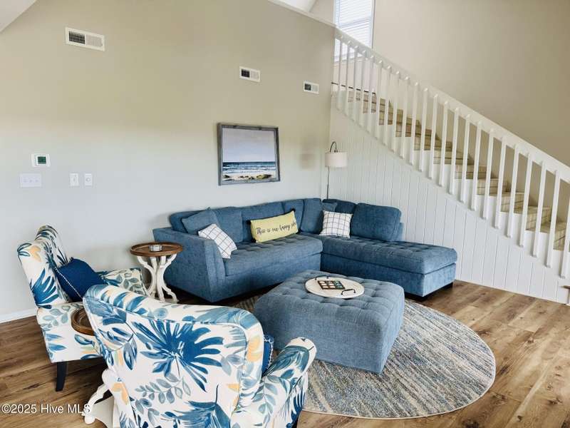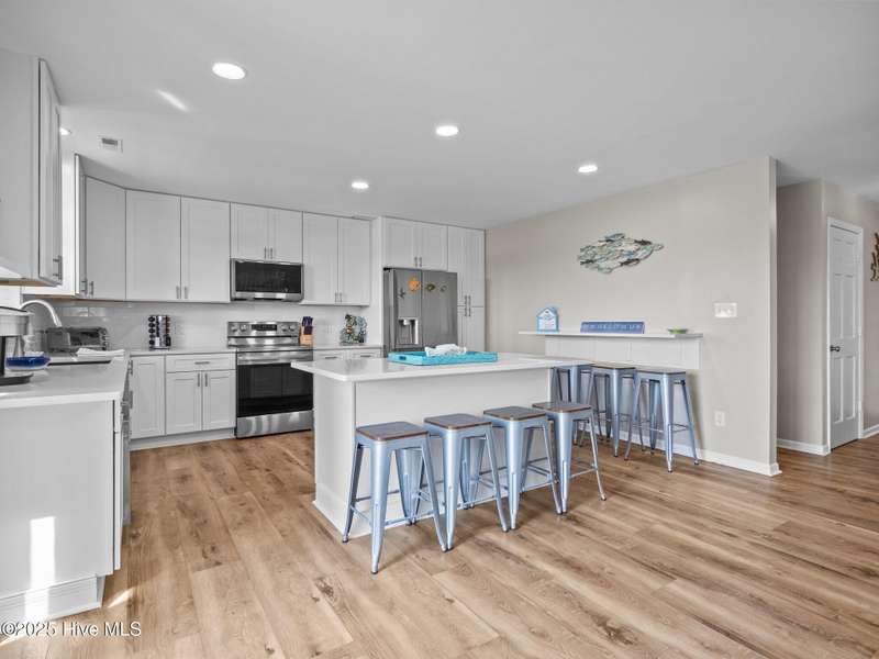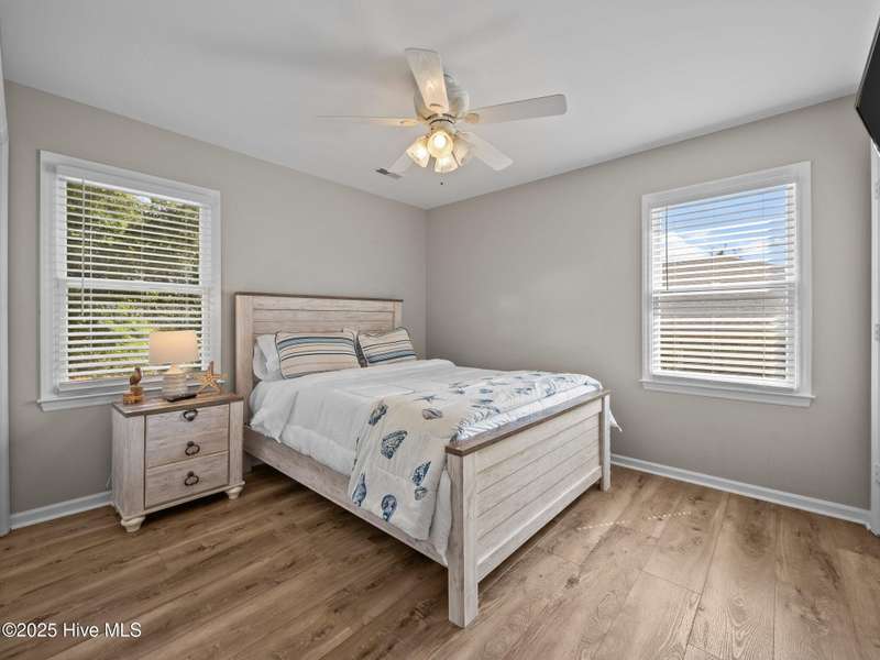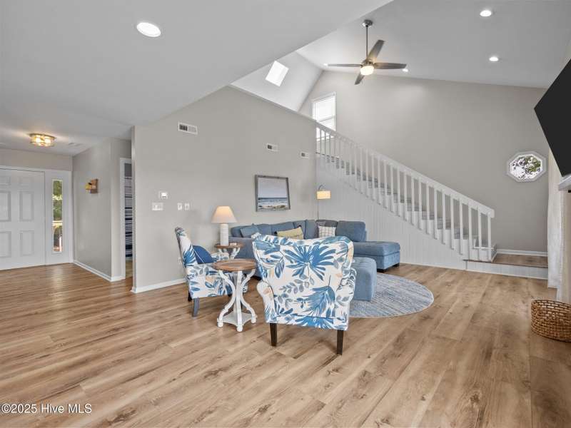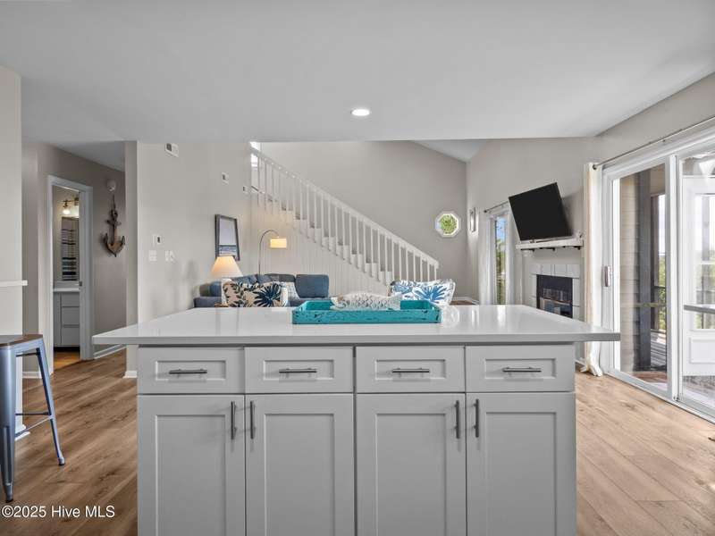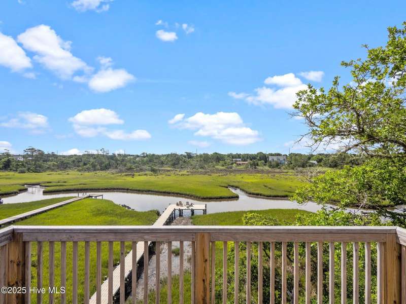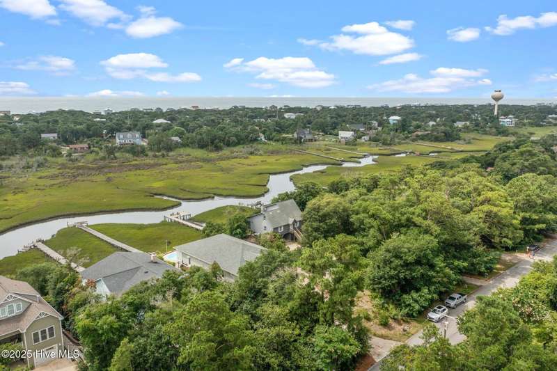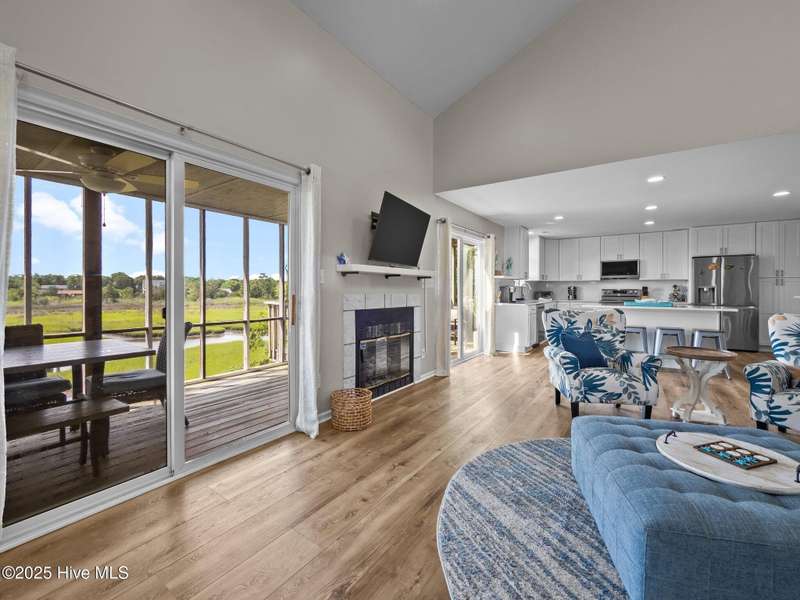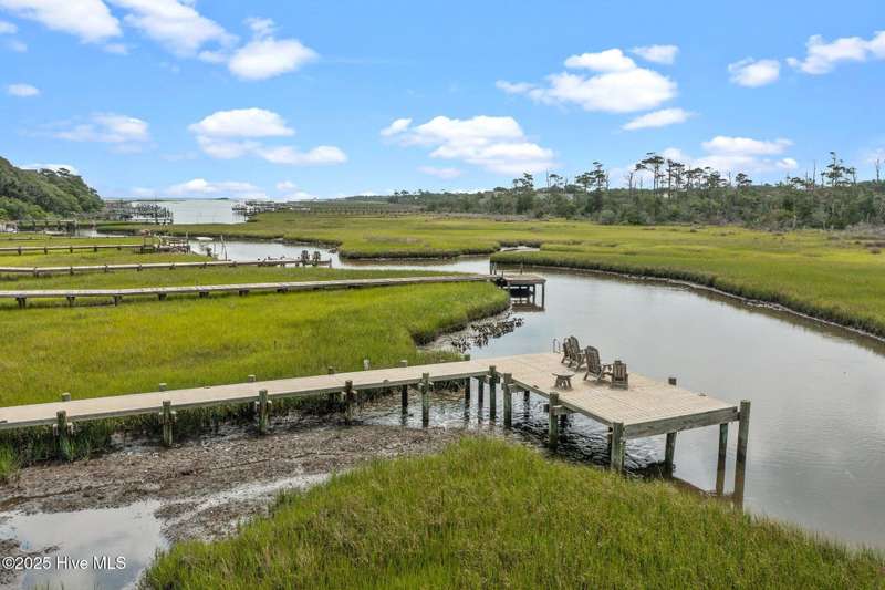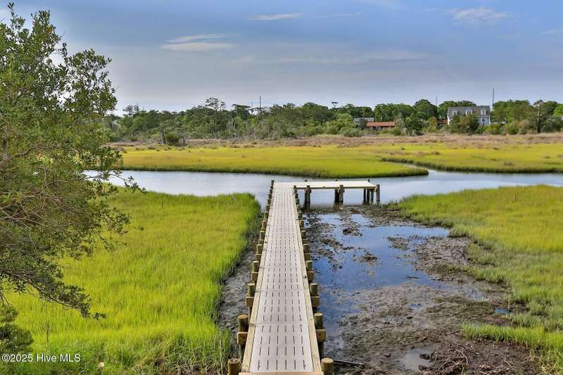 Remodeled Island Cottage with Stunning Water Views and Private Dock. Enjoy sweeping views of Archers Creek and Bogue Sound from this beautifully updated waterfront cottage, tucked away on a high lot outside the flood zone—no flood insurance required! Recent upgrades include new HVAC, LVP flooring fresh paint, quartz kitchen countertops, new ceiling-height cabinetry and island, stainless steel appliances and cleaned ductwork. A brand new hog slat dock and included kayaks make this a true water lover's retreat. The ground level offers a deep double carport (fits 4 vehicles or boat/trailer), large storage area, and an outdoor elevator servicing all 3 levels. The main floor features 2 bedrooms, a full bath, and an open-concept living space with a gas log fireplace, dining area, and updated kitchen. Enjoy indoor-outdoor living with a spacious screen porch and open deck overlooking the water. Upstairs, a loft office with sound views, laundry closet, and a private primary suite with a balcony complete the layout. This home has a great track record as a rental investment! Located in a quiet sound-side neighborhood just minutes from the beach—this is coastal living at its finest!