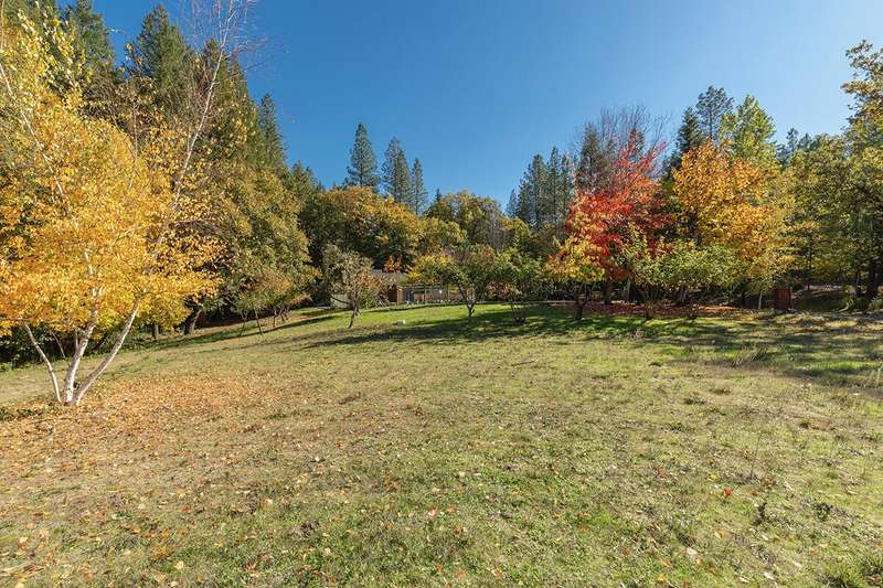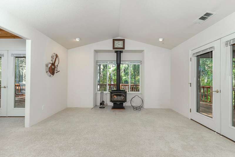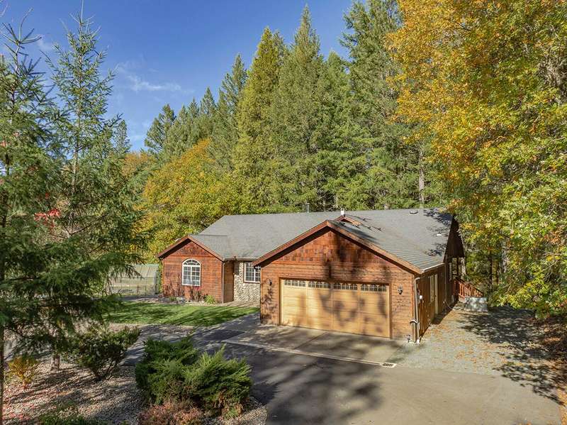 Country retreat on 2.12 acres in a Beautiful West Grants Pass setting! This charming single-level 3-bedroom, 2-bath home offers 1864 sq ft of comfortable living with stunning knotty pine vaulted ceilings, two cozy wood stoves, and a warm, inviting great room design. The kitchen features granite counters, a breakfast bar, pantry, and easy access to the formal dining room—perfect for entertaining. Enjoy the outdoors on the expansive wrap-around deck with covered areas overlooking the creek and property. This home is made for country living with a fenced garden, fruit trees, greenhouse, poultry coop, storage shed, and a picturesque seasonal creek crossed by a bridge shared with a neighbor. Additional features include a gated entry, paved circular driveway, attached 2-car garage, and a whole-house Generac generator for peace of mind. There's also room to build a shop. A true blend of natural beauty and practical comfort. Your private retreat is waiting for you to discover it.