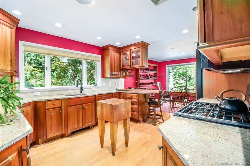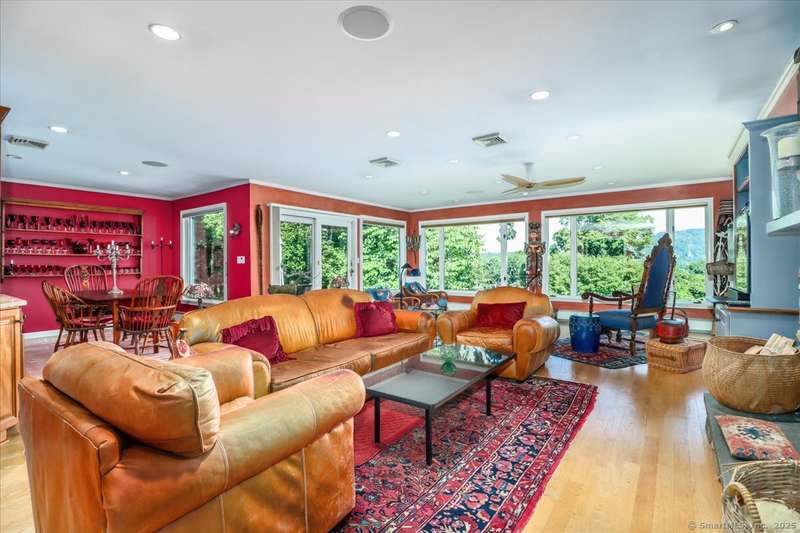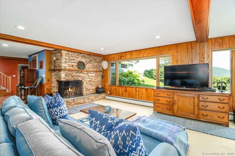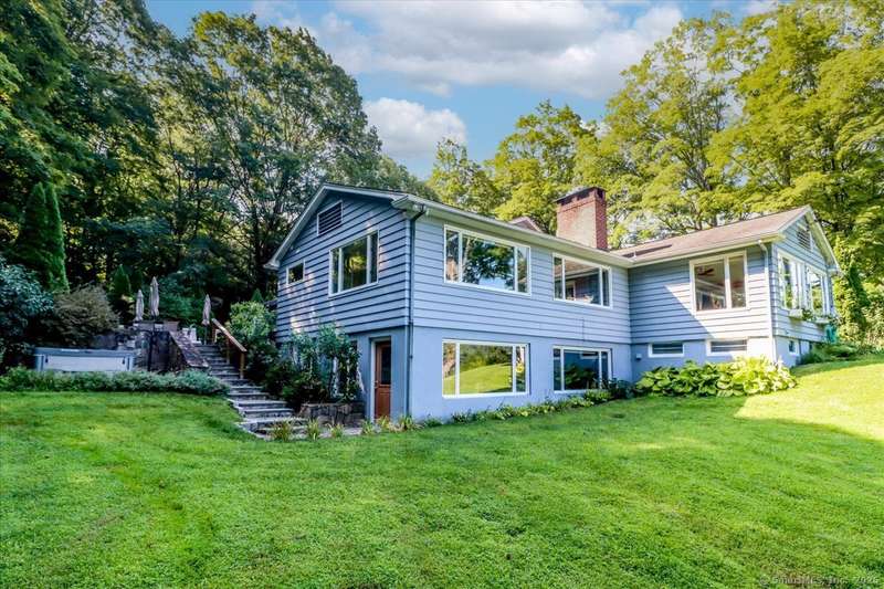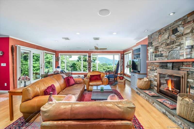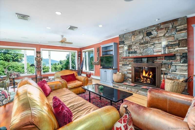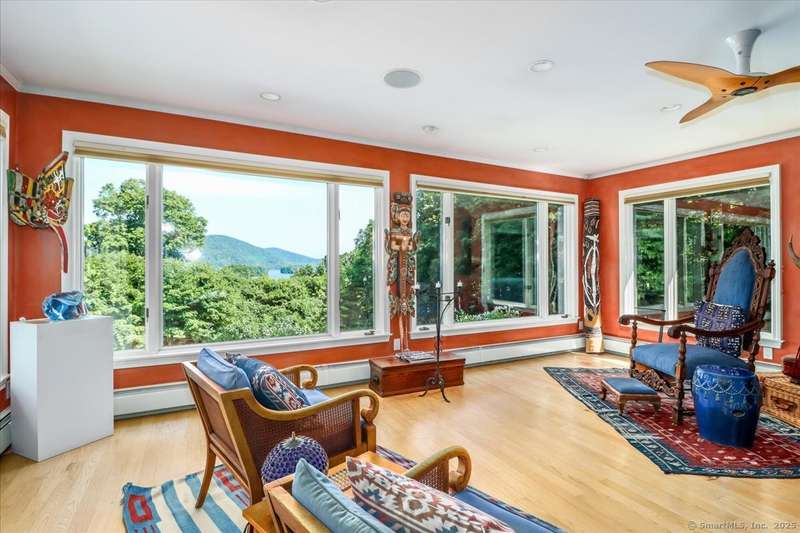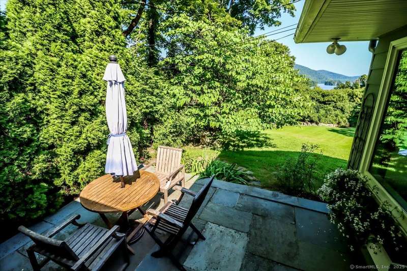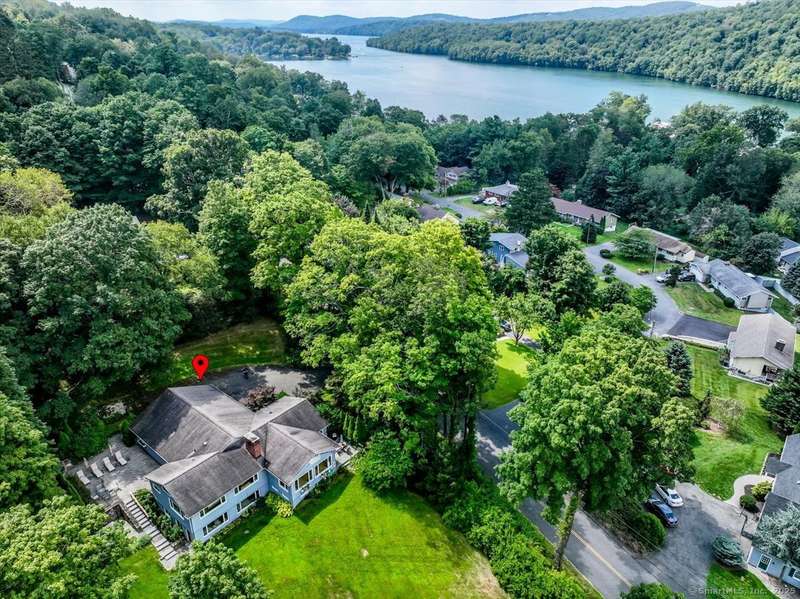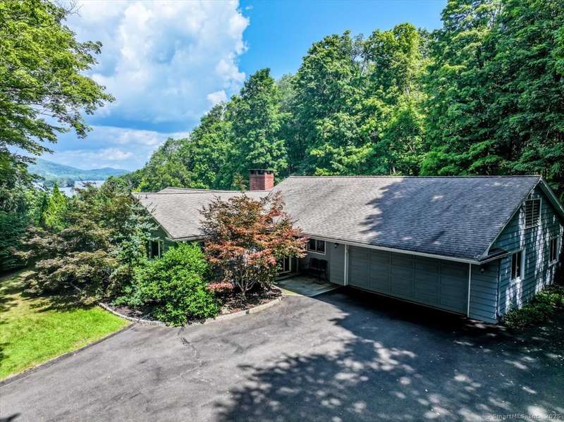 Exceptional Candlewood Lake Ranch with Panoramic Views and fully approved accessory apartment and additional lot. Experience lakeside living at its finest in this remarkable Candlewood Lake home, featuring breathtaking water views. From the moment you enter the foyer, you're greeted by a dramatic wall of windows framing stunning lake vistas. Open-concept design features a spacious living room with a handsome stone fireplace, built-in bookcases, and a dry bar, flowing seamlessly into the dining area and a custom kitchen with granite counters, cherry wood cabinetry, and a breakfast bar. Main-level primary suite is a peaceful retreat with lake views and a recently remodeled bath-perfect for starting your day. Sauna room offers the ultimate in relaxation. An additional bedroom, library, and laundry area complete the main level. Walk-out lower level is an approved apartment, ideal for guests or multi-generational living. It includes a large great room with stone fireplace and bar, a bedroom