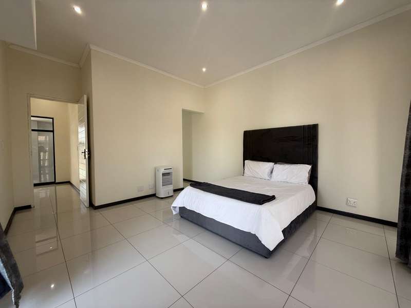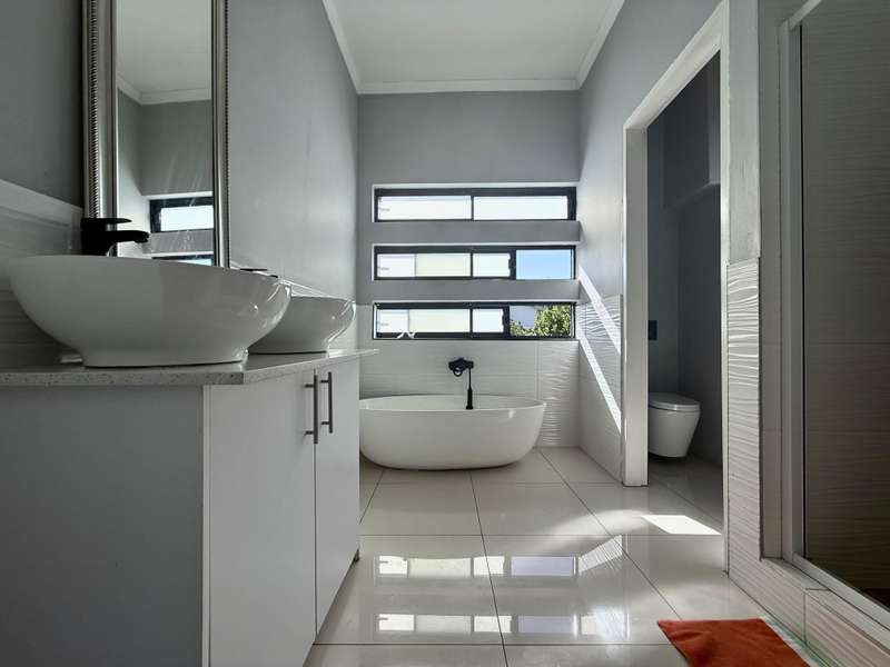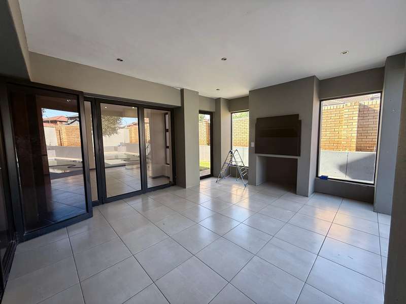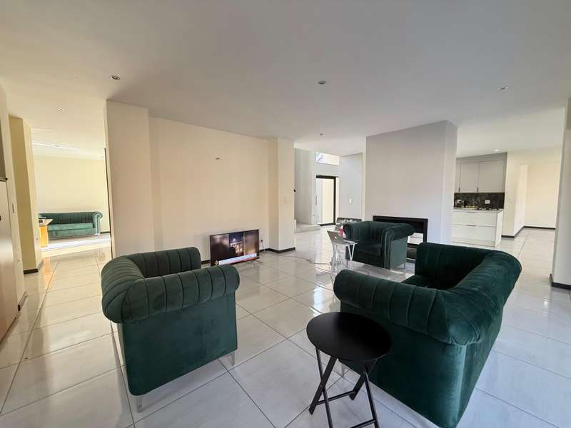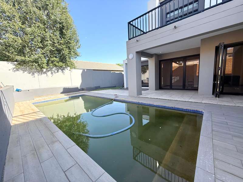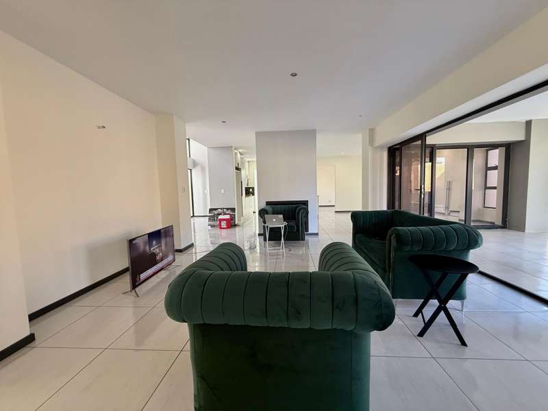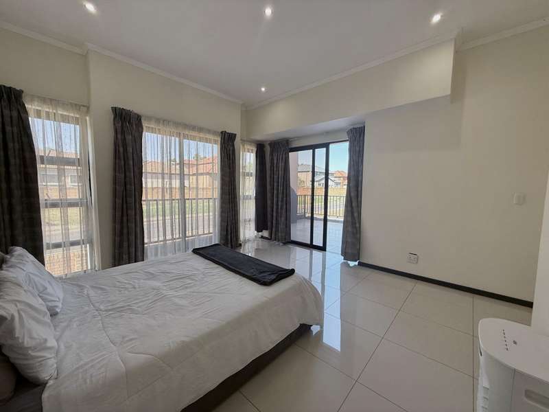 Welcome to your dream home, where modern design meets timeless elegance. This stunning 5-bedroom, 6-bathroom property is a masterpiece of comfort and functionality, offering every detail to make life effortless and enjoyable. As you arrive, a grand entrance welcomes you with sophistication. To your left, a serene pond adds a touch of tranquility, setting the tone for this exceptional home. Choose between two entrances: a secondary access point on the left or the main entrance, which leads into the heart of the home. Step through the main entrance, and you’ll find a thoughtfully designed layout. On your left is a stylish guest bathroom, while to your right lies the spacious lounge area, complete with a double-facing fireplace that creates a warm and inviting atmosphere. The lounge flows seamlessly into the dining area, which offers picturesque views of the backyard, perfect for entertaining or quiet family dinners. Adjacent to the dining area is a versatile open room, ideal as a kids’ lounge or pajama room, bathed in natural light and offering additional backyard views. The modern kitchen is a chef’s delight, complemented by a scullery with ample space for a washing machine and dishwasher, ensuring practicality without compromising on style. The outdoor amenities are just as impressive. A dedicated domestic accommodation includes space for a double bed and an en-suite bathroom. The scullery provides easy access to the washing line, streamlining your daily chores. The backyard is a haven for relaxation and entertainment, featuring a large pool, a braai area, and an open patio, surrounded by a spacious garden perfect for family gatherings or outdoor fun. The first bedroom, located downstairs, offers a peaceful retreat with room for a queen or extra-length queen bed and views of the sparkling pool. Upstairs, the high ceilings and modern stair rails lead to four additional bedrooms, each with balcony access. Three of these bedrooms comfortably fit double or queen beds, with one featuring its own private balcony overlooking the entrance. Two standard bathrooms upstairs cater to these bedrooms, one with a bathtub and the other with a shower. Master Suite The luxurious master bedroom is a sanctuary of comfort, with space for a king-sized bed and stunning views of the garden and main road. A walk-in closet with ample storage and a sleek, modern en-suite bathroom complete this exquisite retreat. Perfect for Family Living This home is designed for both everyday living and special occasions, offering a seamless blend of indoor and outdoor spaces. Whether hosting guests, relaxing by the pool, or enjoying a quiet evening by the fireplace, this property is a true modern masterpiece. Discover the perfect balance of style, comfort, and functionality in this exceptional home—your ultimate lifestyle awaits.