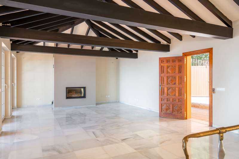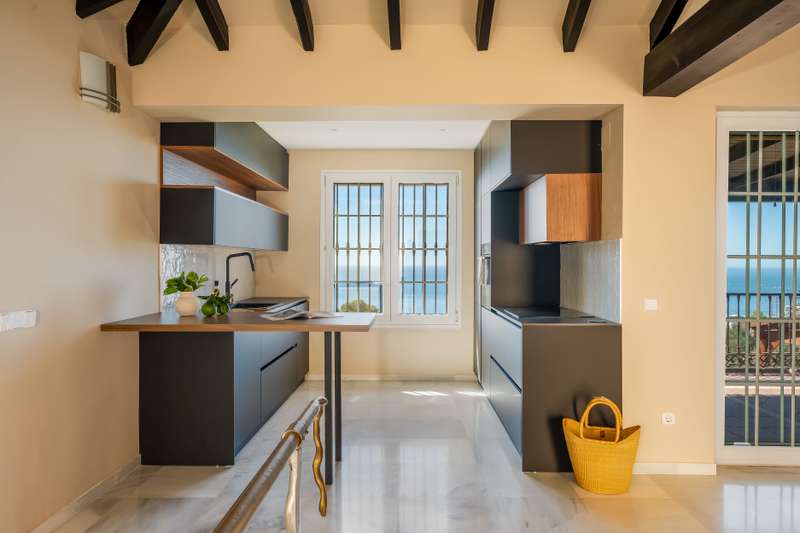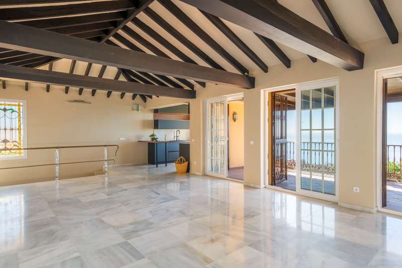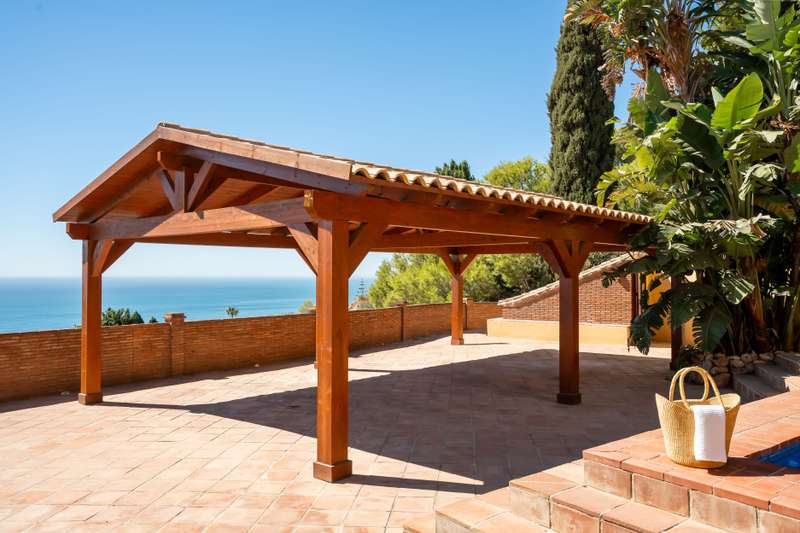 Welcome to a unique home in one of the most sought-after and prestigious areas of Benalmádena, Capellanía. The villa is located on a quiet street with virtually no through traffic—the road leads directly to this property. This ensures privacy and tranquility, while still allowing access if desired. The location is excellent: just a few minutes from the charming restaurants and services of Benalmádena Pueblo, as well as the stunning beaches of Benalmádena, with easy access to both Fuengirola and Benalmádena town center. The high-end services of El Higuerón are also very close by. The villa captivates with breathtaking panoramic views of the sea and mountains, always unobstructed. The large private garden offers a perfect space to enjoy sunny days, and under the impressive wooden pergola there is ample room for, for example, a dining area and a billiard table. The garden also features a spacious swimming pool and an independent building with a studio and its own bathroom, with the poss
