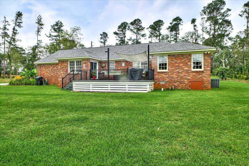 Hard to find ranch on acreage in Evans! Total of 3.17 flat acres off Evans to Locks! Home featuring 4 bedrooms and 2.5 baths w/side entry double car garage. Great room with fireplace, vaulted ceiling and bamboo flooring. Formal living and dining room combination. Kitchen with tons of cabinets, large pantry, corian counter tops, tile backsplash, ss appliances to include double wall oven, and smooth cook top. Kitchen also features a desk area that could be a small office space. Breakfast area with newer sliding glass door leading to oversized trex deck w/sail. One secondary bedroom with vaulted ceiling and computer/office nook. Another secondary bedroom w/double closet and desk area. Primary bedroom w/two closets and view of backyard. Roof new in January 2025, crawl space encapsulated and has dehumidifier, new outbuilding to remain with property. Owner just planted over 100 plants after Hurricane. Utility room in garage perfect for extra storage. Laundry room is 9x7 w/tons of extra storage and cabinets.