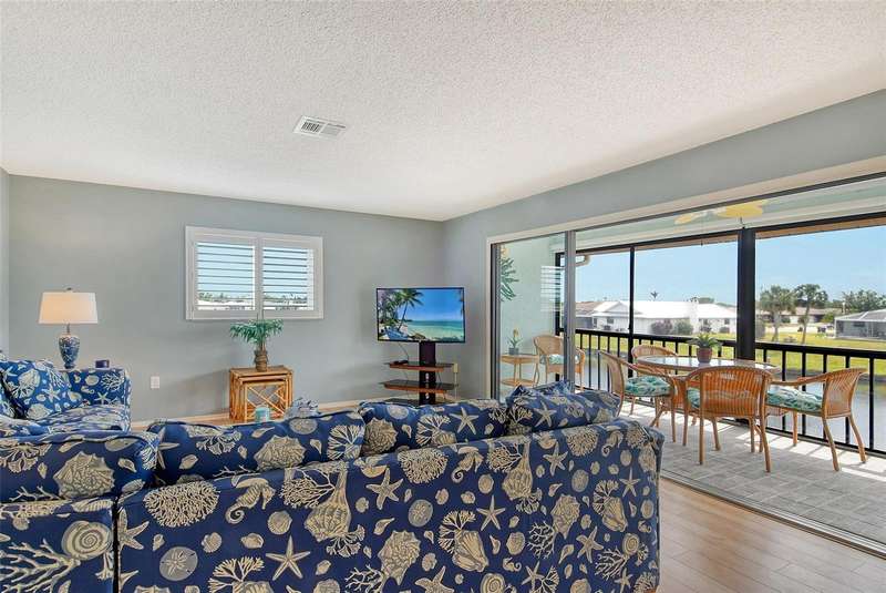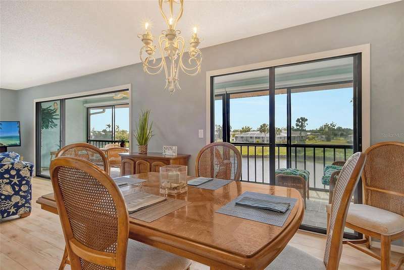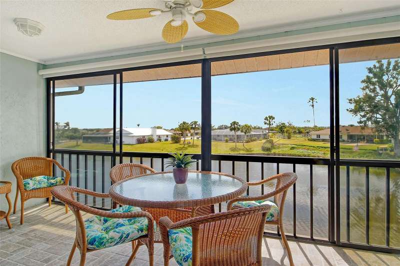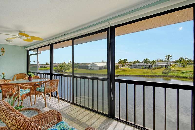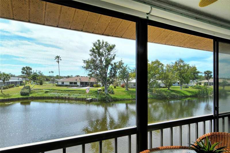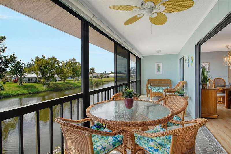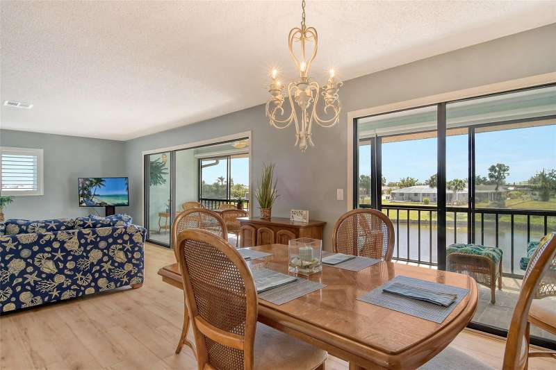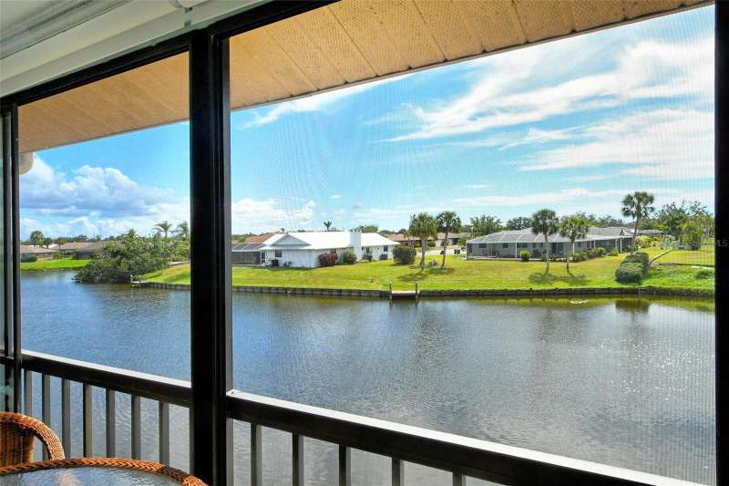 Sweeping water views from nearly every window and door, greet you as you enter this beautifully turnkey furnished unit. Both sunrises and sunsets will be yours to enjoy each day. The coastal décor will make you feel right at home. Recently updated and painted, this wonderful unit features two bedrooms and two baths, new windows and new lanai screens. Granite counters with a stylish tumbled marble backsplash and stainless appliances make this a dream kitchen. A new roof was installed in 2024. Thoughtful interior updates throughout, many which have been done in the last few years, will give a new owner peace of mind. Interior laundry, covered parking, low HOA fees, community pool, clubhouse, all within close proximity to shopping and the beaches, make this unit one that should not be missed. Villa Nova Shores is a secret gem in Venice. A place to call home. Live the lifestyle, enjoy the sunshine.