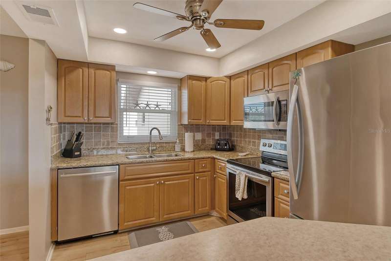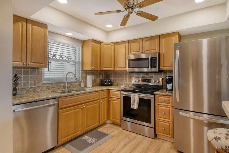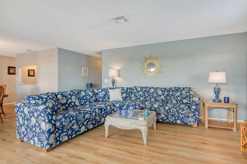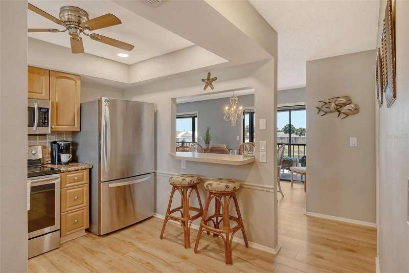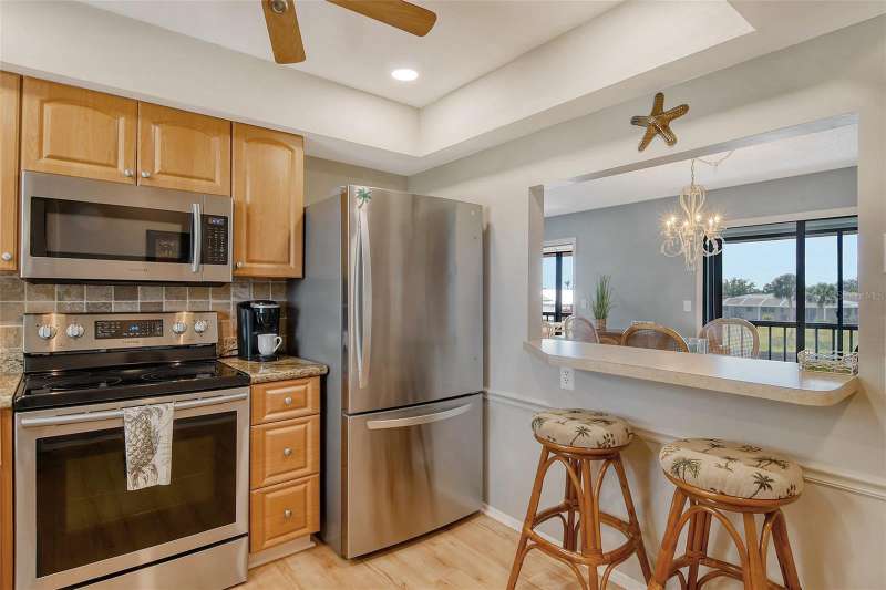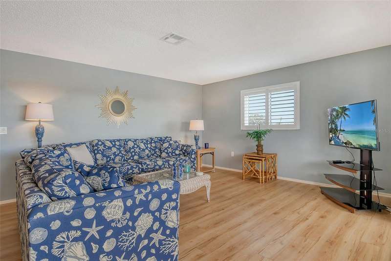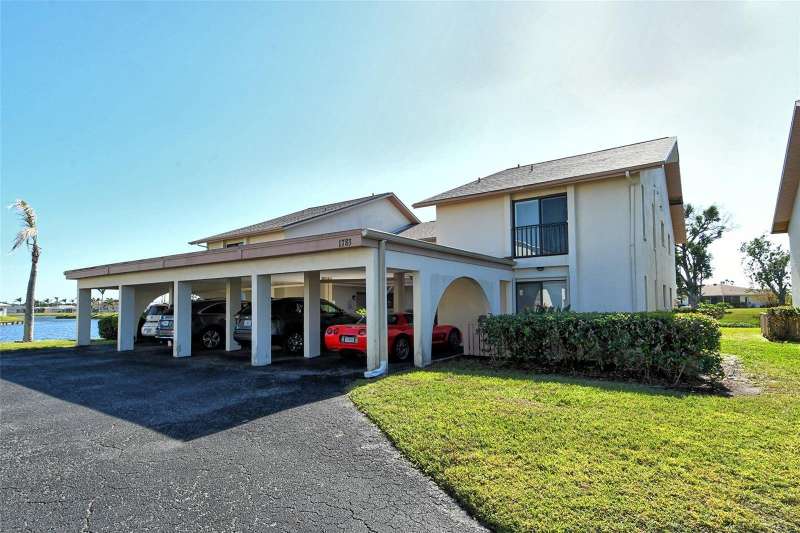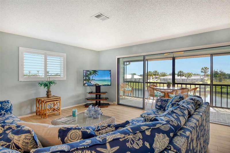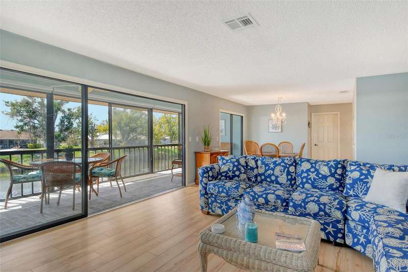 Sweeping water views from nearly every window and door, greet you as you enter this beautifully turnkey furnished unit. Both sunrises and sunsets will be yours to enjoy each day. The coastal décor will make you feel right at home. Recently updated and painted, this wonderful unit features two bedrooms and two baths, new windows and new lanai screens. Granite counters with a stylish tumbled marble backsplash and stainless appliances make this a dream kitchen. A new roof was installed in 2024. Thoughtful interior updates throughout, many which have been done in the last few years, will give a new owner peace of mind. Interior laundry, covered parking, low HOA fees, community pool, clubhouse, all within close proximity to shopping and the beaches, make this unit one that should not be missed. Villa Nova Shores is a secret gem in Venice. A place to call home. Live the lifestyle, enjoy the sunshine.
