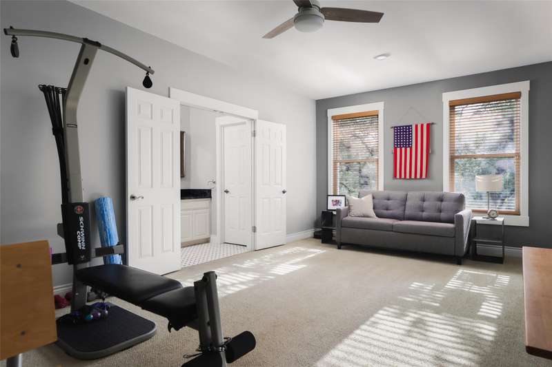 Upstairs, a sunlit loft connects two large bedrooms with en-suite baths and walk-in closets, one with porch access. Across the loft, the second primary suite is a true retreat, featuring a generous dressing area, spa-like bathroom with heated floors and walk-in shower, and French doors opening to the upper porch. A hidden staircase leads to the finished attic, a versatile space with dormer windows ideal for play, creative use, or storage.