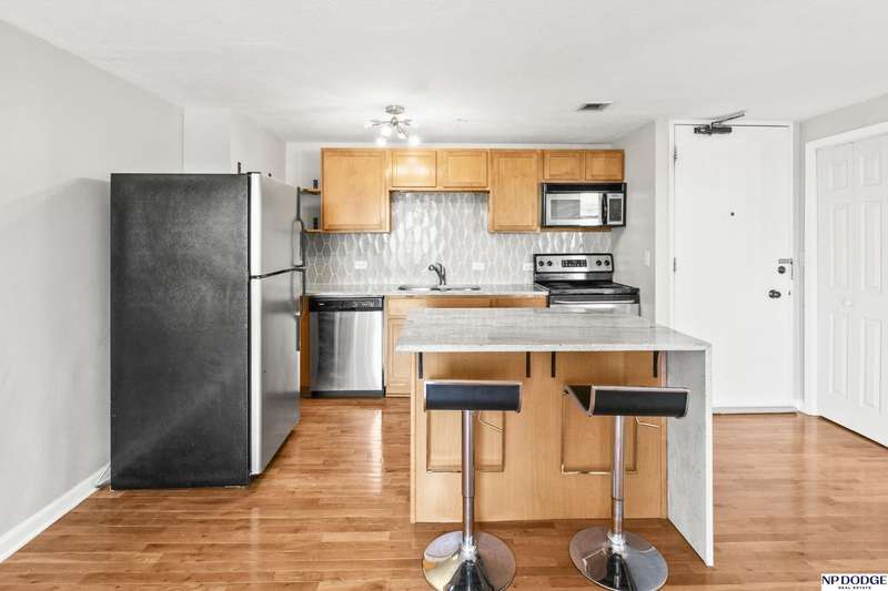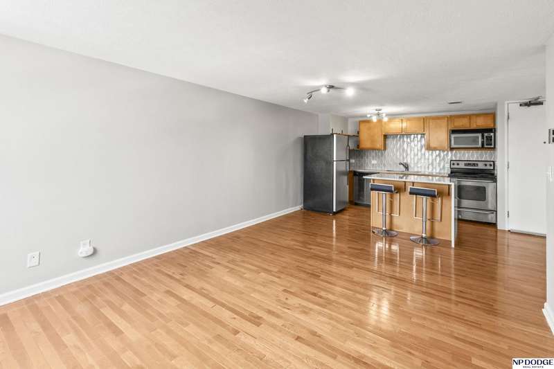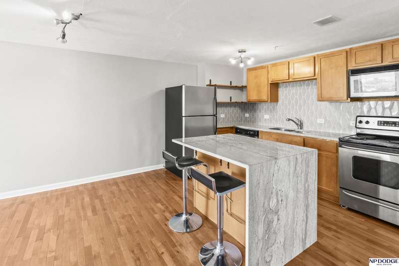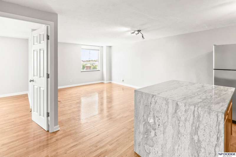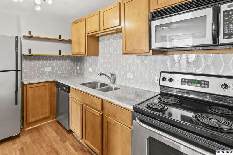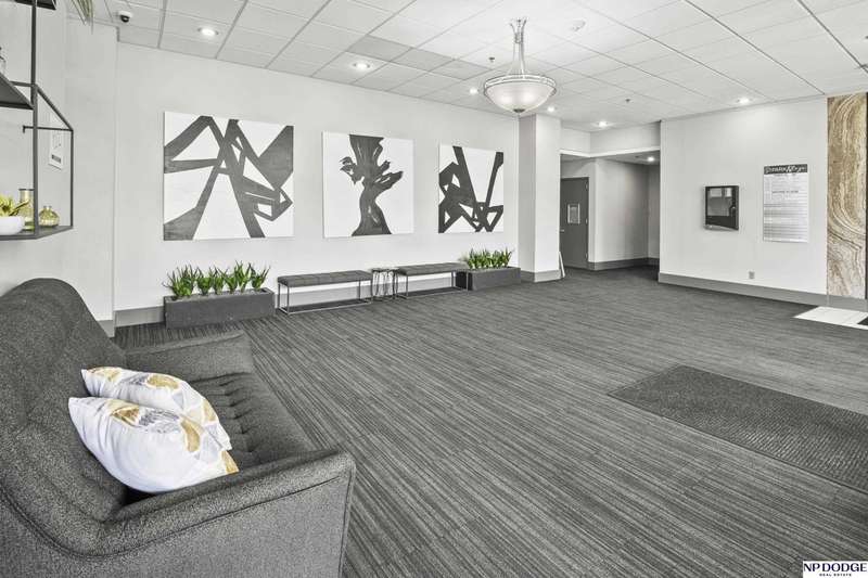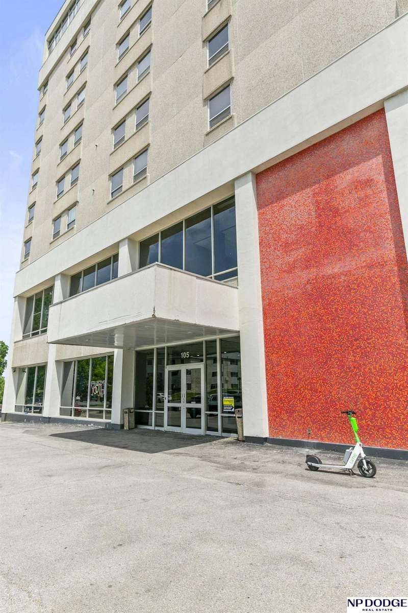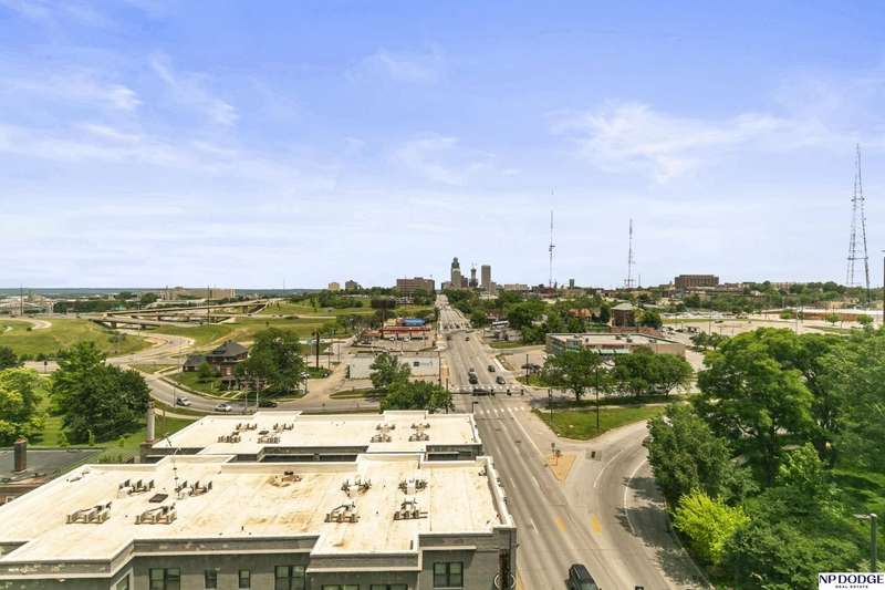 This open-concept corner unit condo features one bedroom, one bathroom, and one underground parking spot. Facing east, you'll enjoy a stunning view of downtown Omaha. The kitchen boasts a gorgeous granite waterfall countertop, trendy backsplash, stainless steel appliances, and accent shelving. The updated bathroom includes a bath/shower combo. Amenities include access to a fitness center, secured entry, free laundry on each floor, and a rooftop patio with a grill and shared kitchen. Water, gas, sewer, trash, and heating/AC are covered by the HOA. Just minutes from UNMC, Creighton, Blackstone, UNO, and downtown. AMA