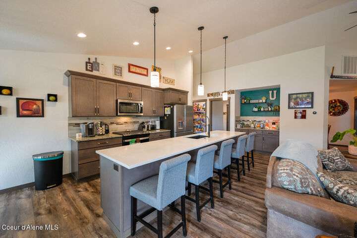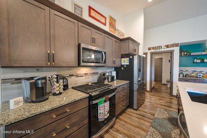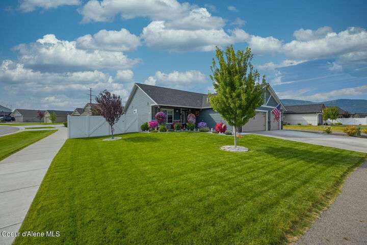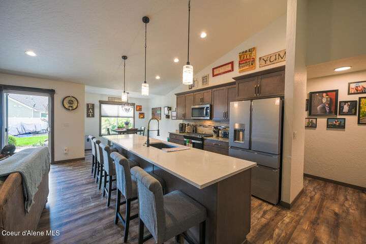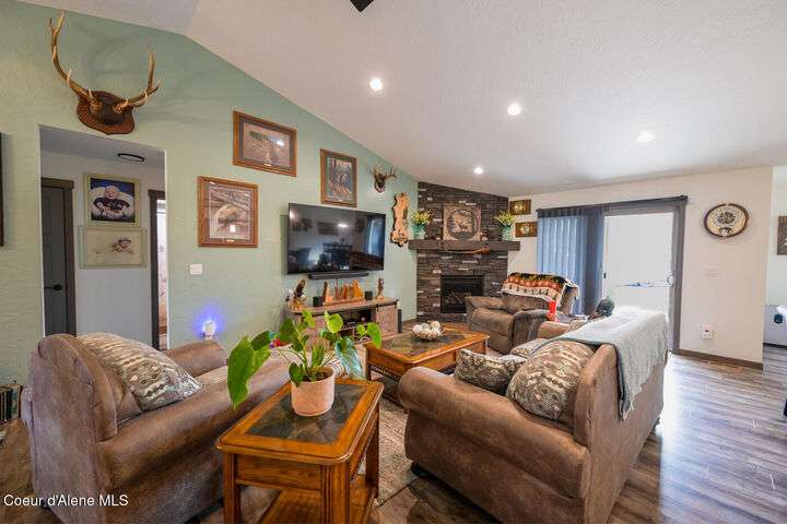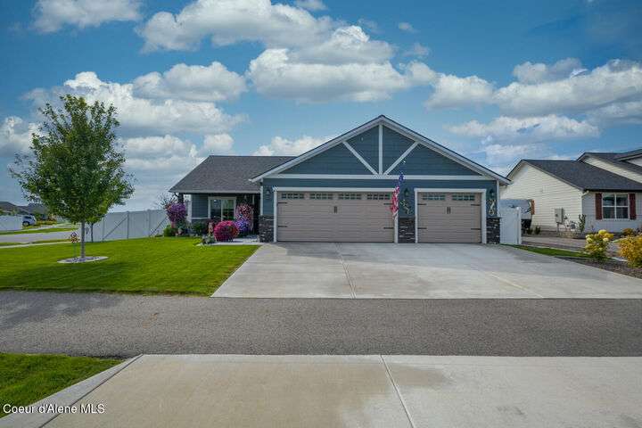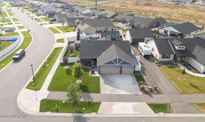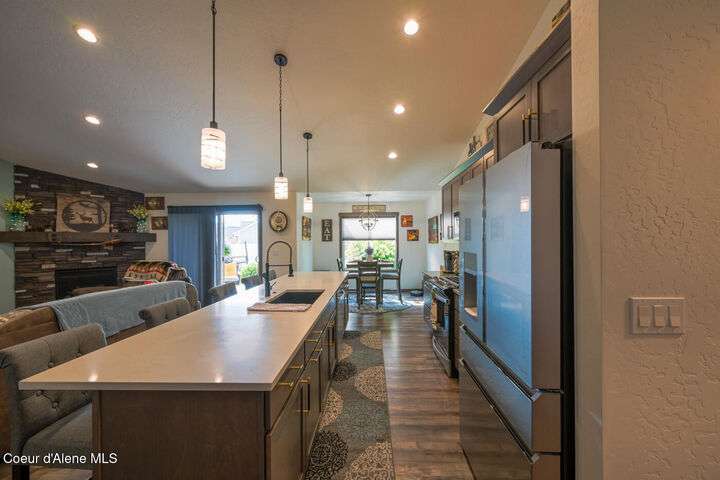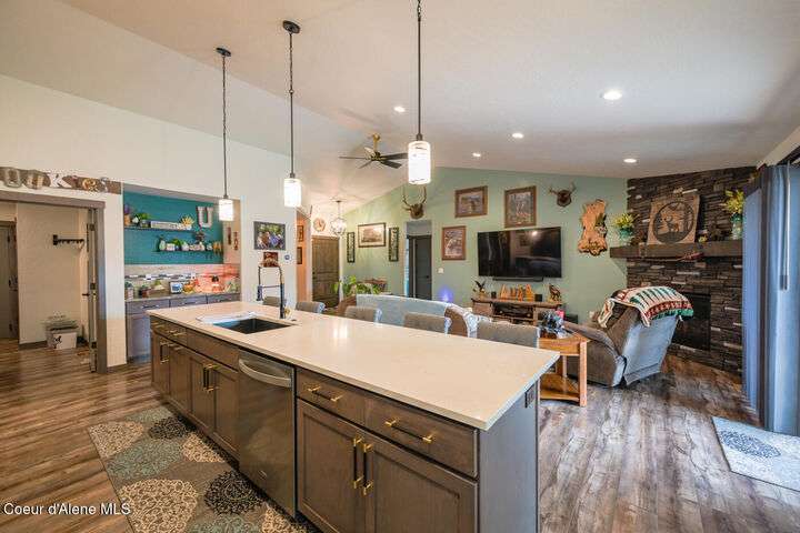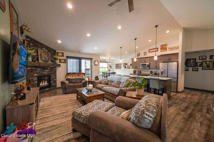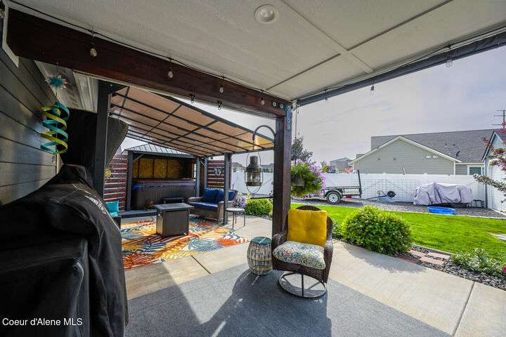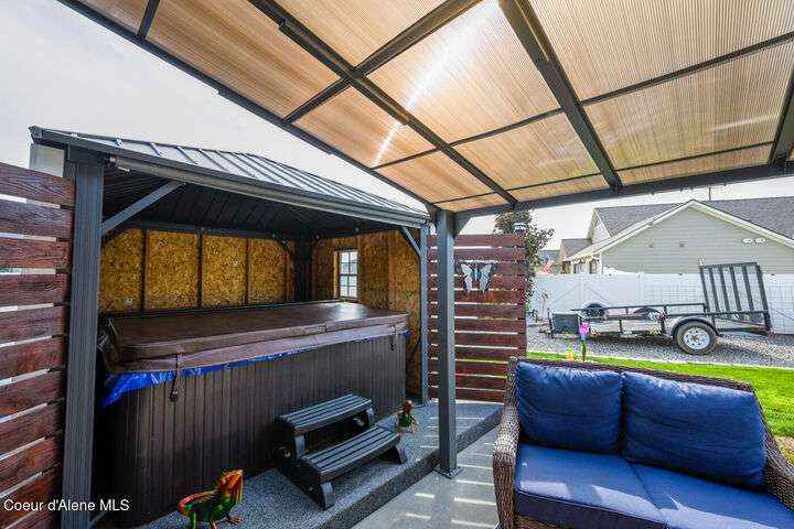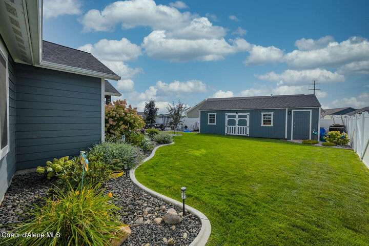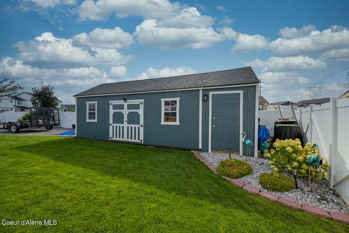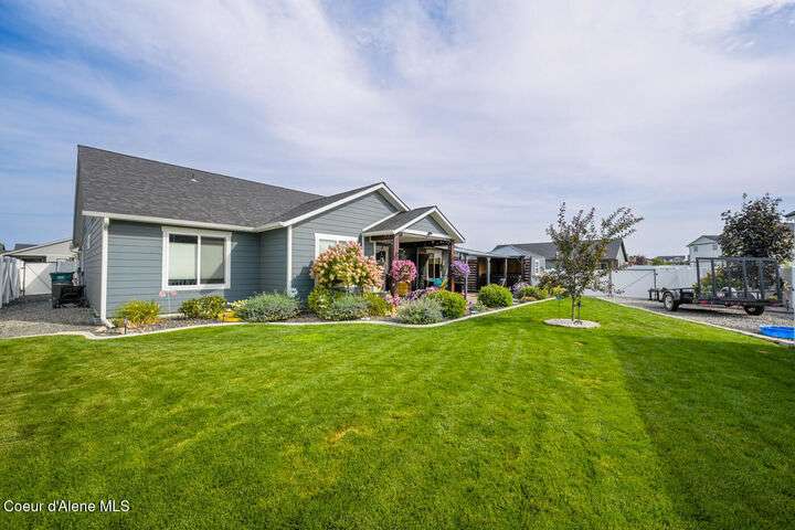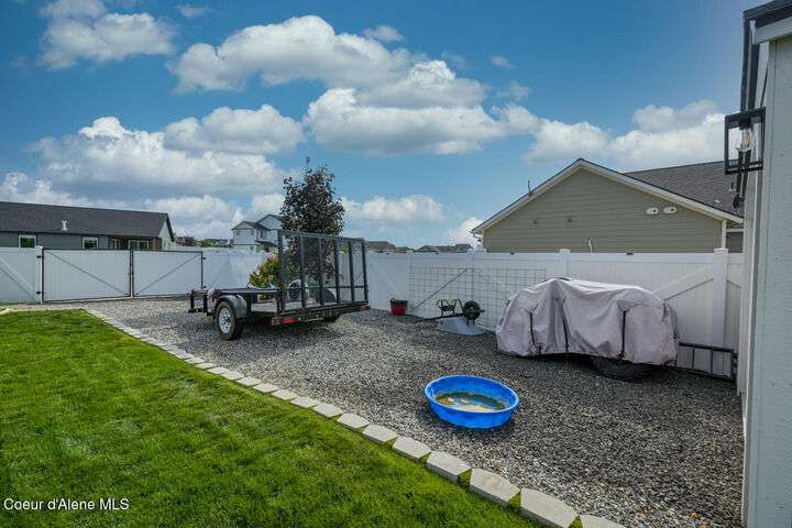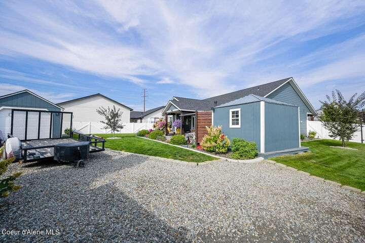 Large lot! Room for a shop! This beautifully maintained 3 bedroom, 2 bathroom, with den residence offers comfort, style, and functionality in every corner. From the moment you step inside, you'll be greeted by a warm and inviting living space featuring a floor-to-ceiling stone fireplace — the perfect centerpiece for cozy evenings. The open-concept kitchen boasts a large island ideal for entertaining, meal prep, or casual dining. With ample storage and high-end finishes, it's a true gathering spot for family and friends. The spacious master suite includes a tile shower and plenty of closet space, providing a peaceful escape at the end of the day. Step outside to enjoy your large covered patio, beautiful landscaping, and a private hot tub under a gazebo. Your own backyard retreat. 12x28 Shed with Meat Cooler Behind-Gate RV Parking Fully fenced This home checks all the boxes — don't miss your chance to make it yours!