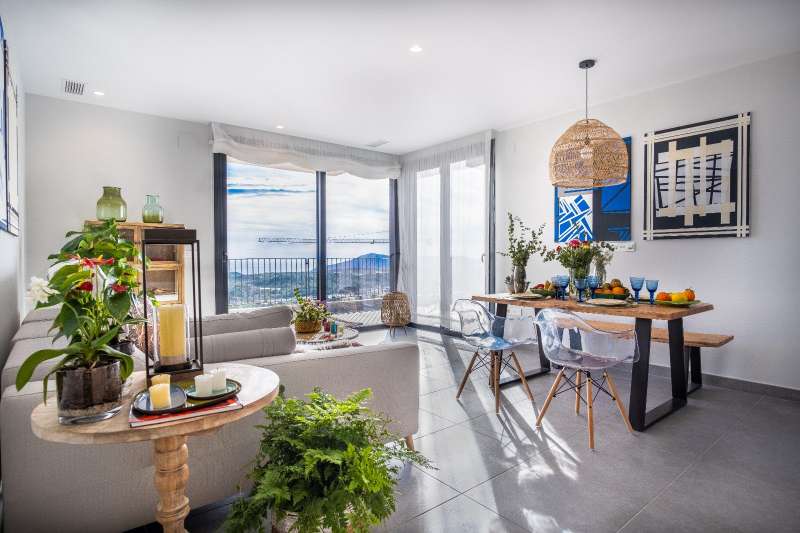 The villas for sale in Polop, Spain feature 2 or 3 bedrooms and 2 bathrooms, depending on the model. They come with private gardens and terraces, complete with swimming pools and a garage. The interior spaces are filled with ample natural light, thanks to the large windows, and the living areas are spacious with open-plan kitchens. All villas are equipped with fitted wardrobes and kitchen appliances.